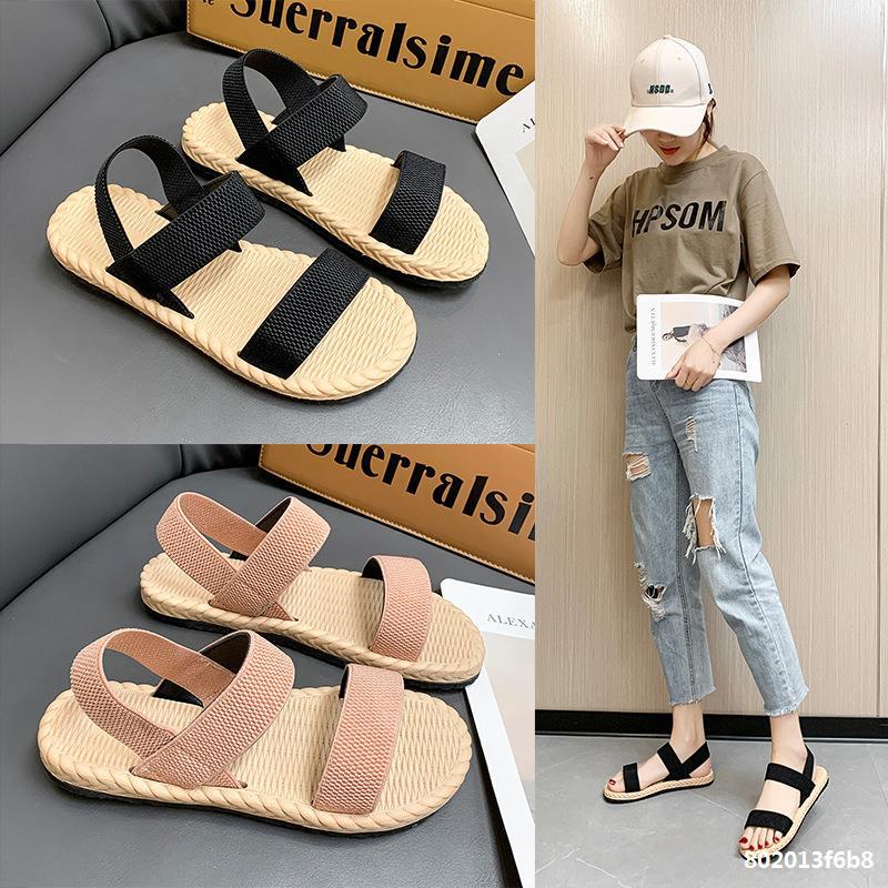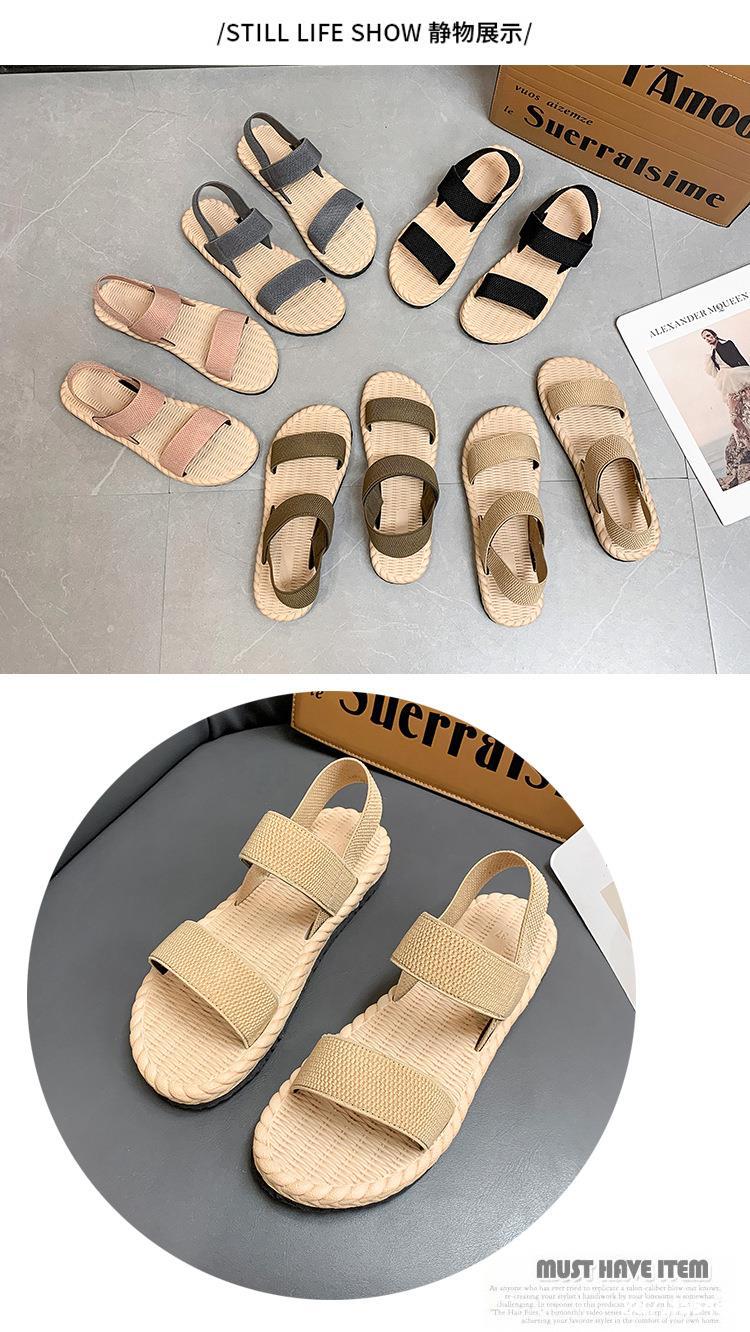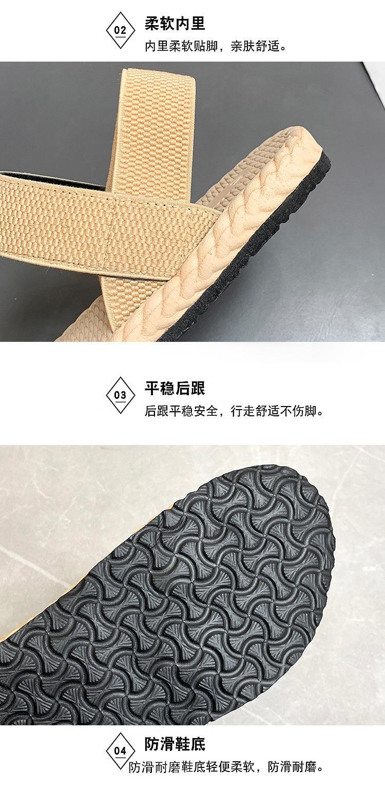 여성용 신축성있는 밴드 크로스 플랫 슈즈 2023 새로운 샌들 여성용 여름 착용 모조 짚 짠 린넨 로마 샌들