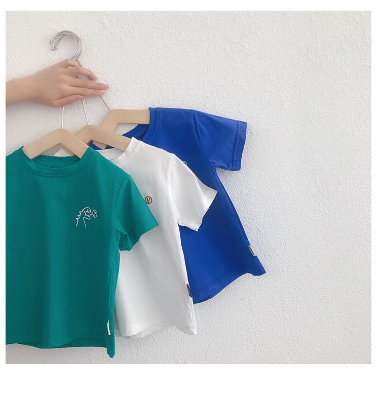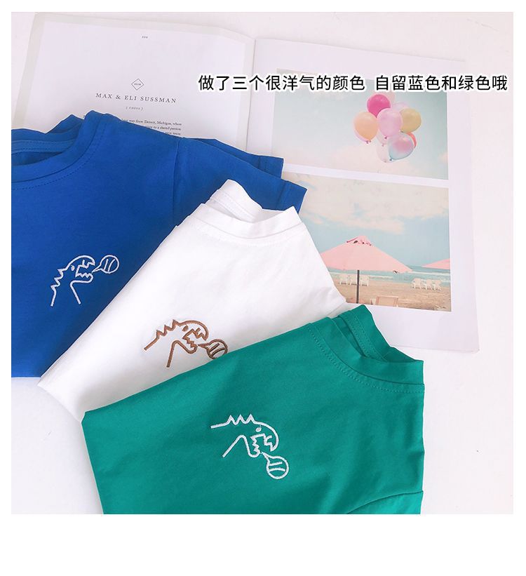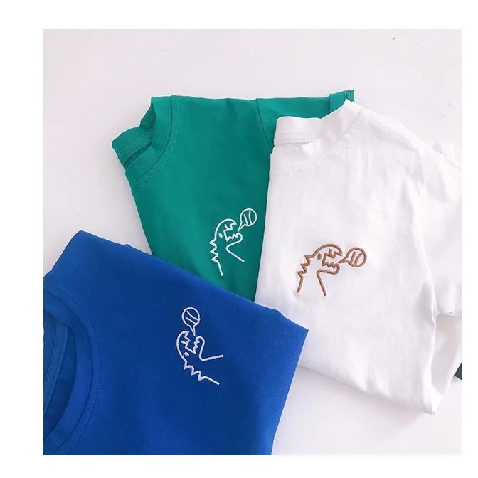 아동복 여름 2023 새로운 어린이 공룡 자수 반팔면 티셔츠 중소 소년 소녀 반팔 어깨