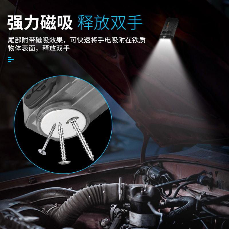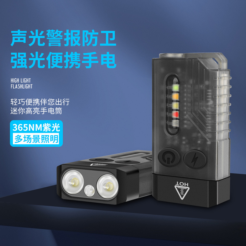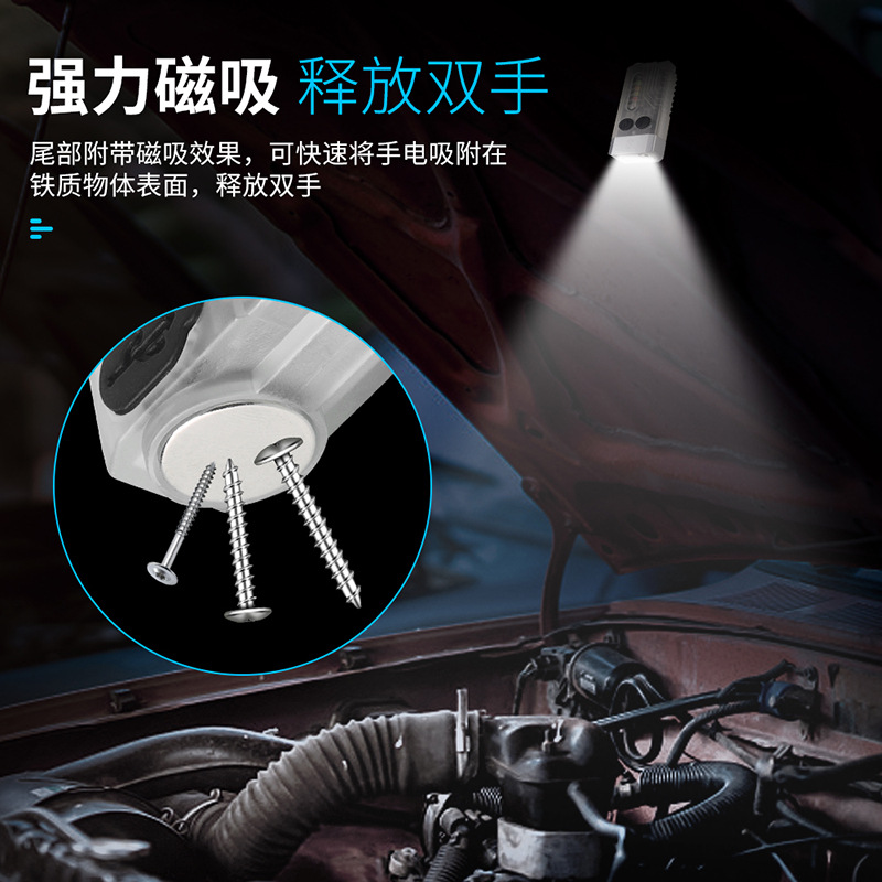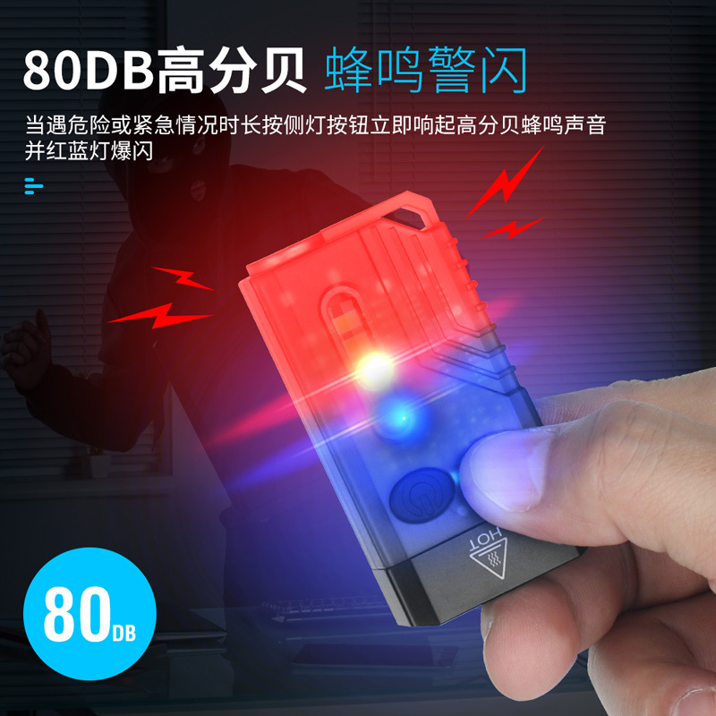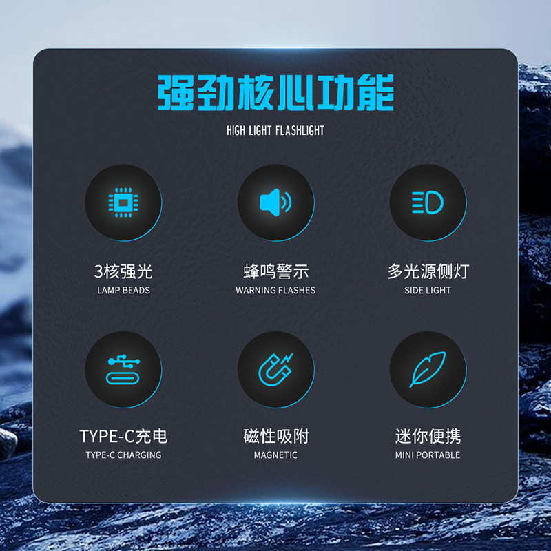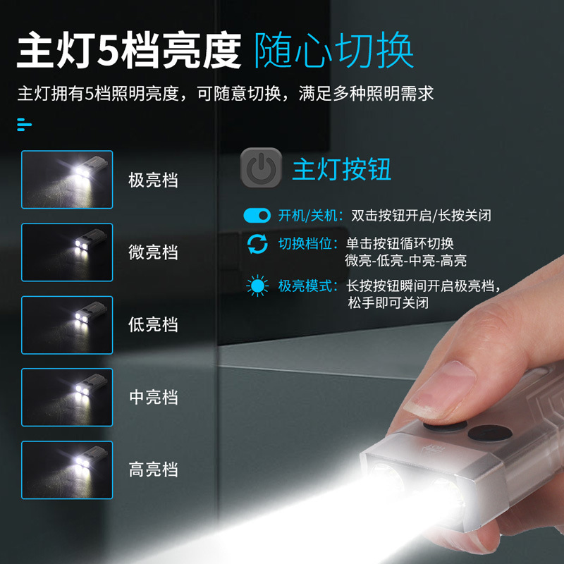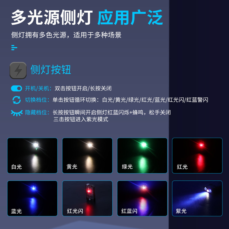 特色功能: 侧灯红蓝警示,UV紫光验钞,红光SOS,小巧轻便,磁吸功能,蜂鸣器