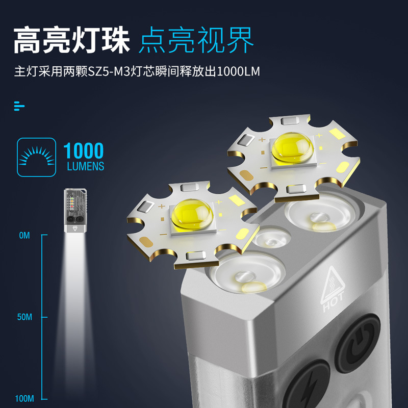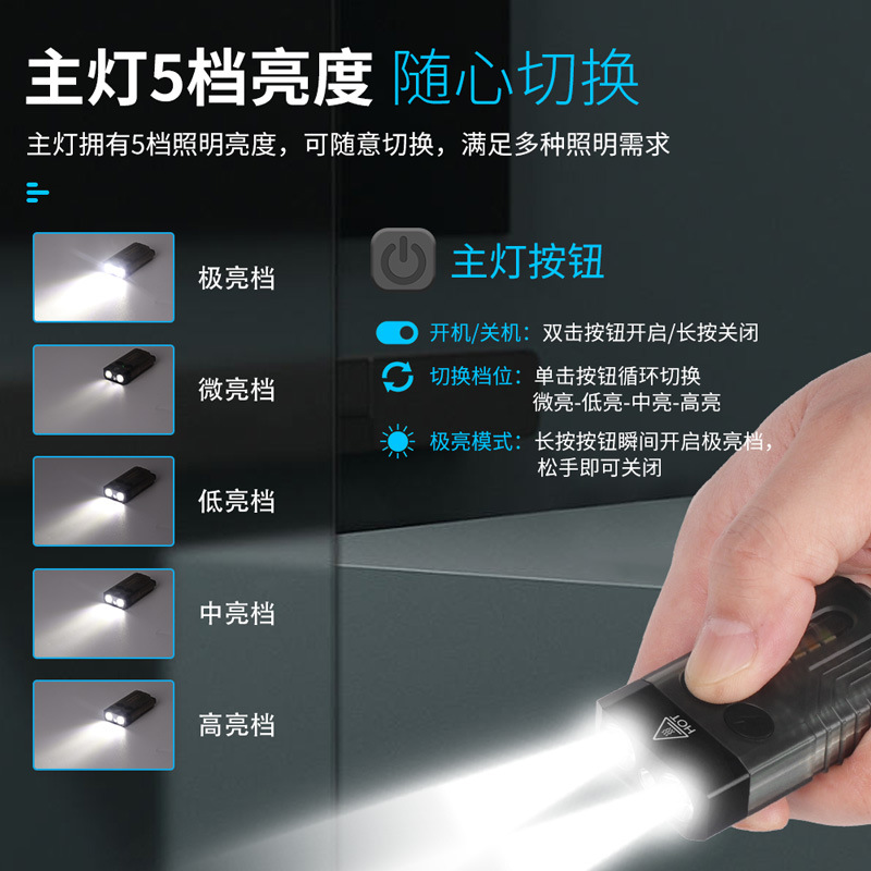 双开关设计:极亮(长按主灯开关按钮开启松手关闭)1000LM