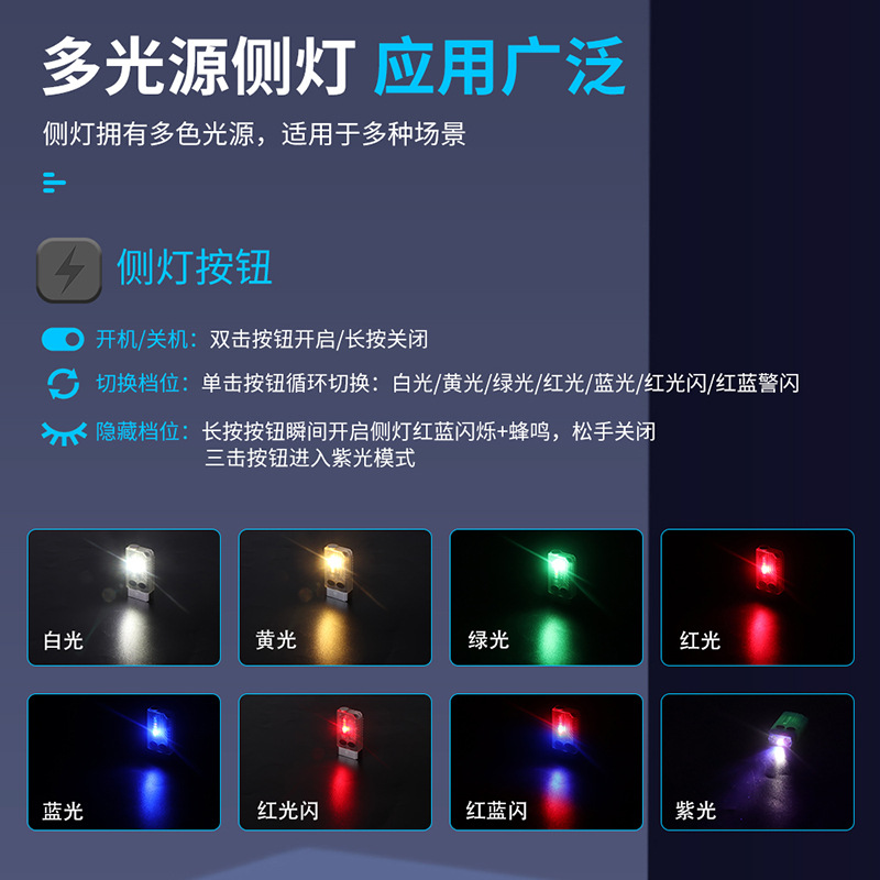 2.侧灯按键连续按3击-主灯紫光亮-长按关闭