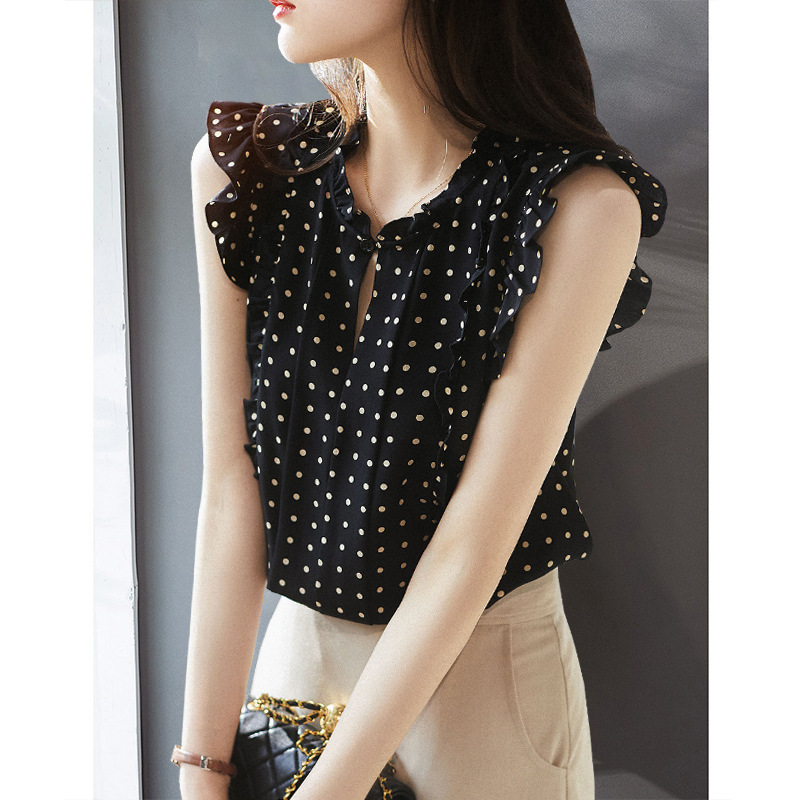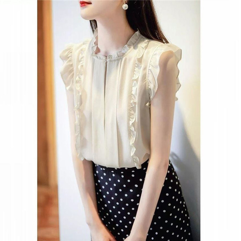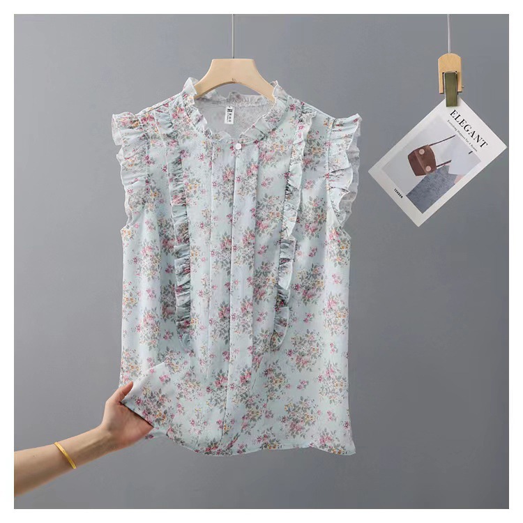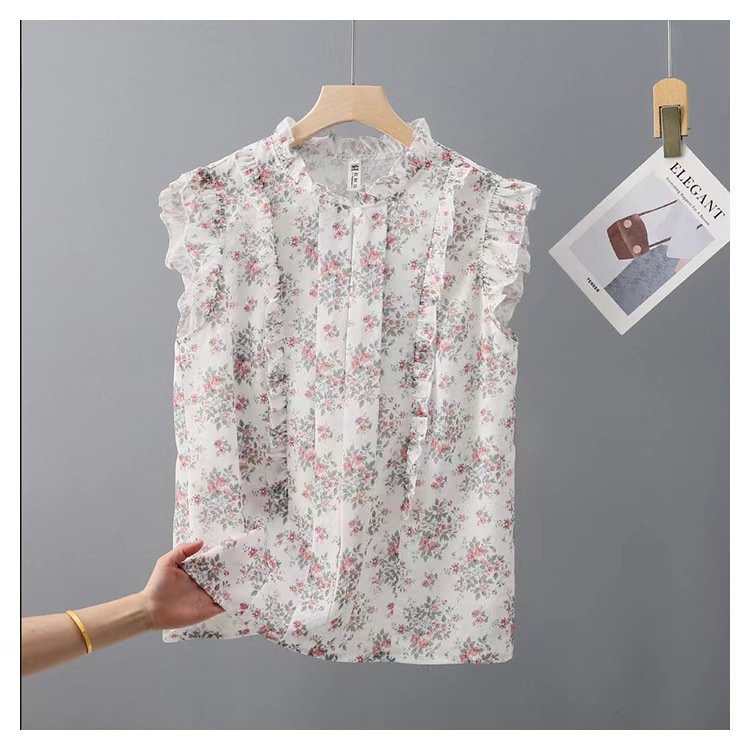 민소매 러플 꽃 셔츠 여자의 2023 여름 새로운 느슨한 우아한 셔츠 달콤한 쉬폰 인쇄 탑