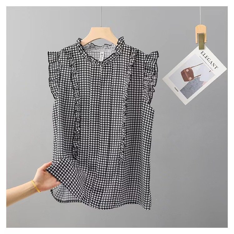 민소매 러플 꽃 셔츠 여자의 2023 여름 새로운 느슨한 우아한 셔츠 달콤한 쉬폰 인쇄 탑스토어 가기