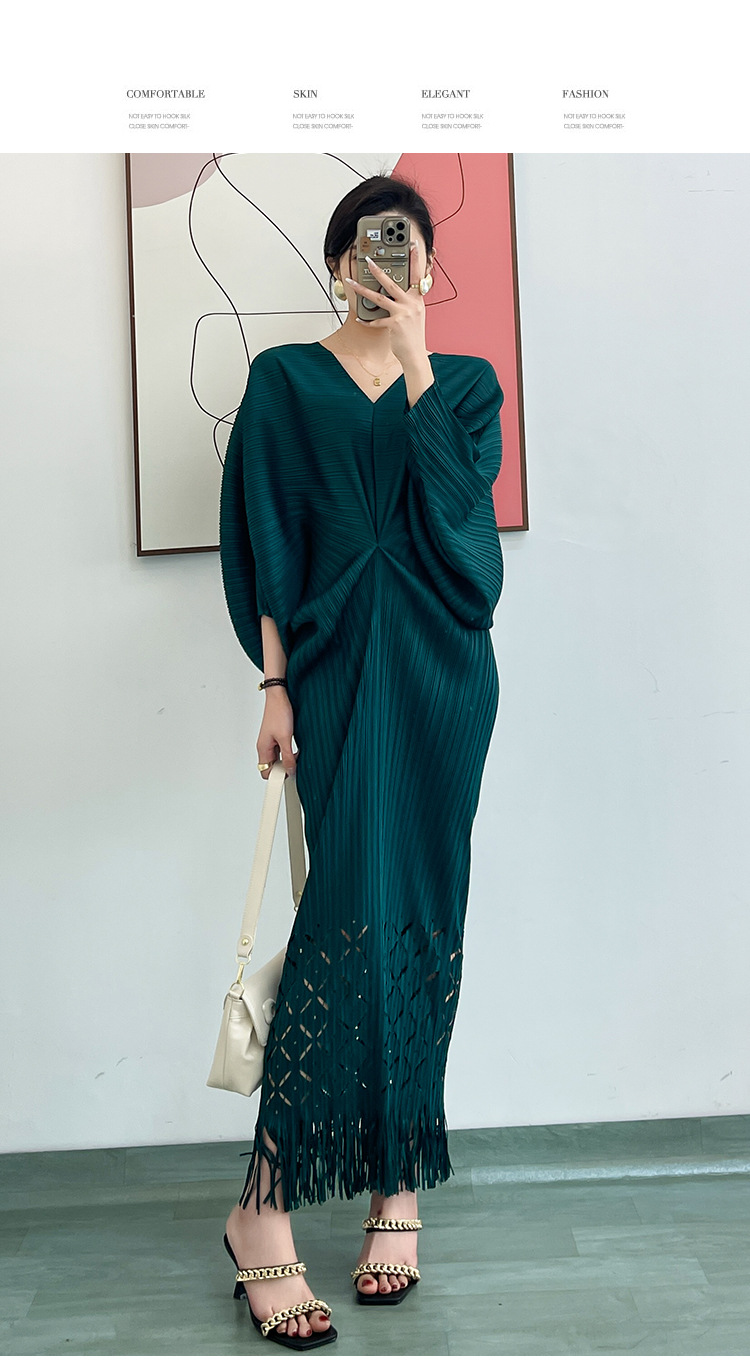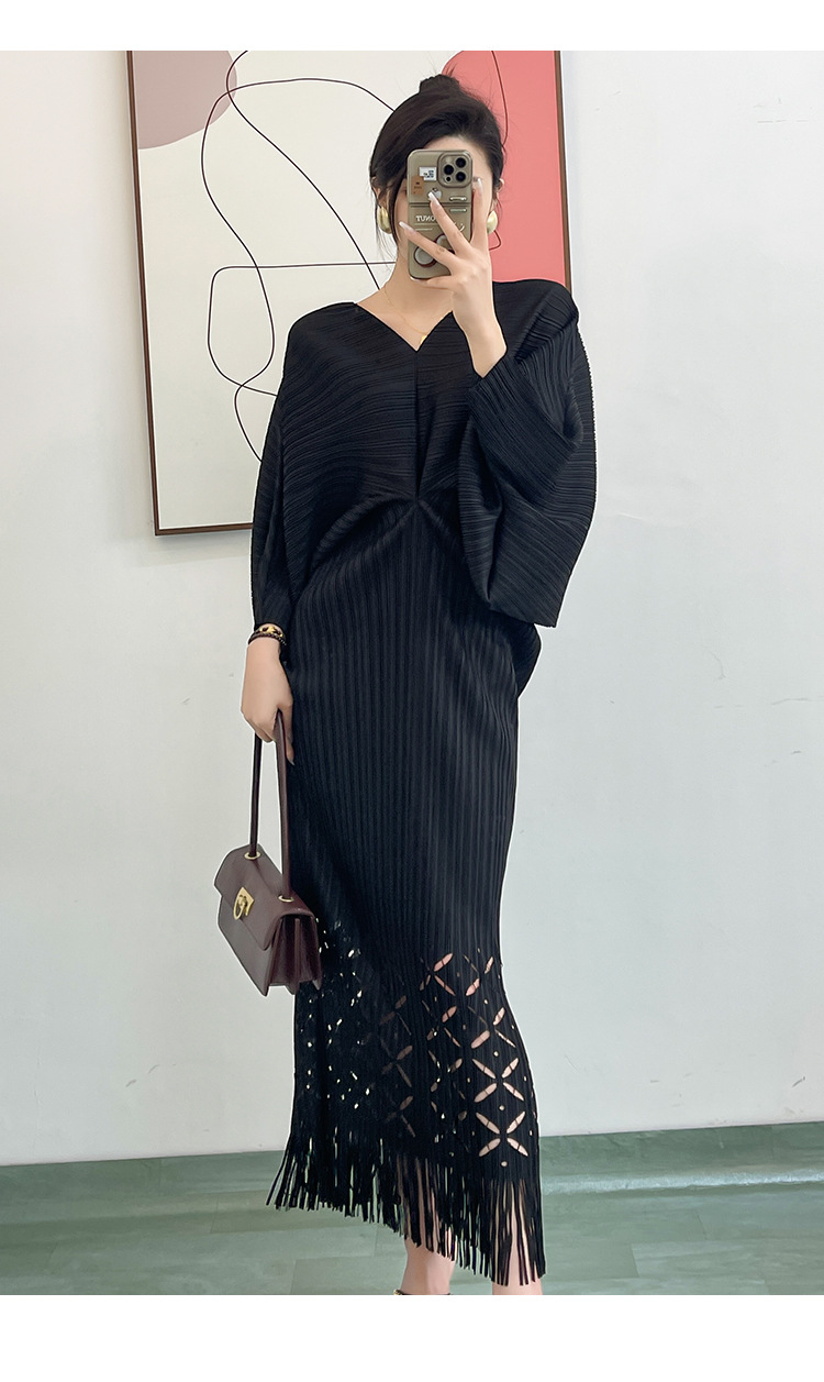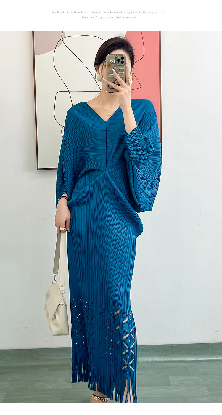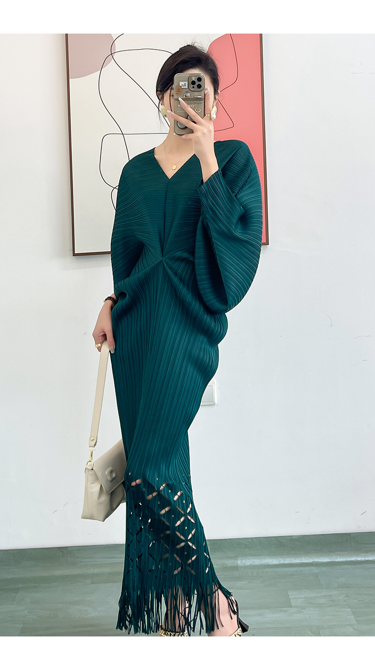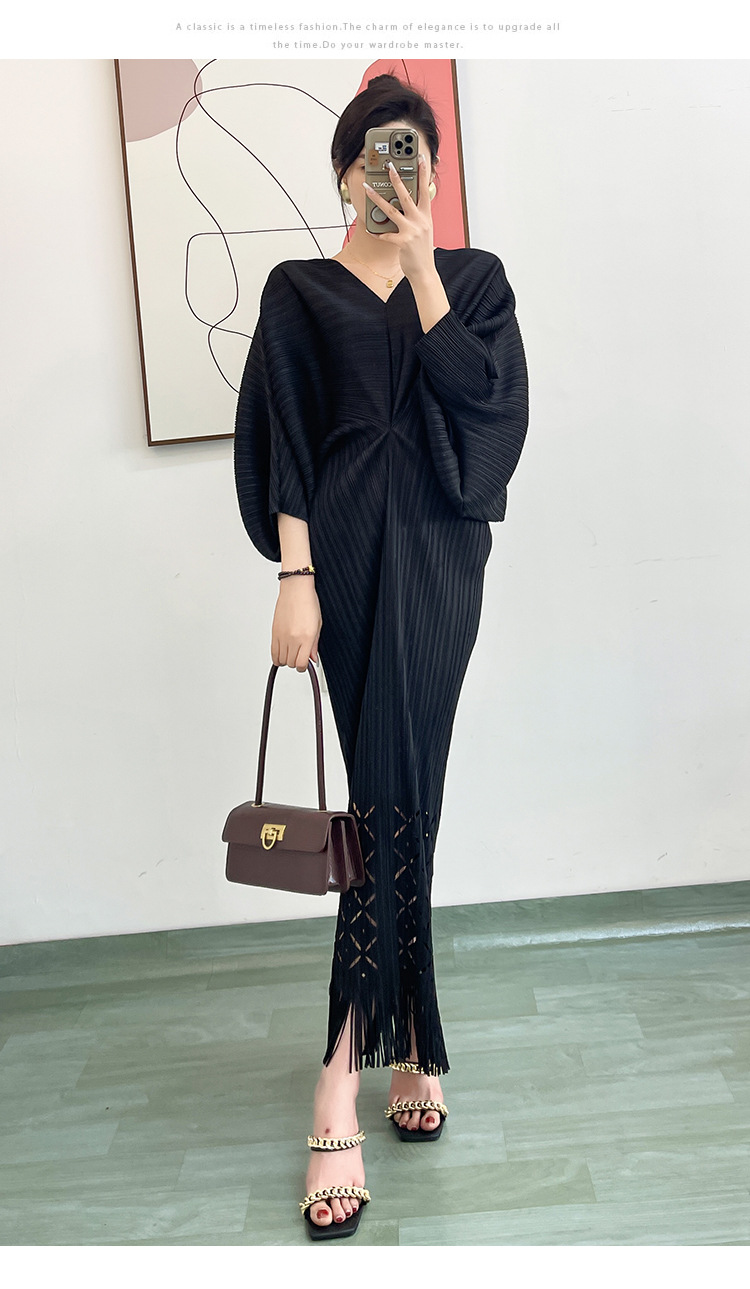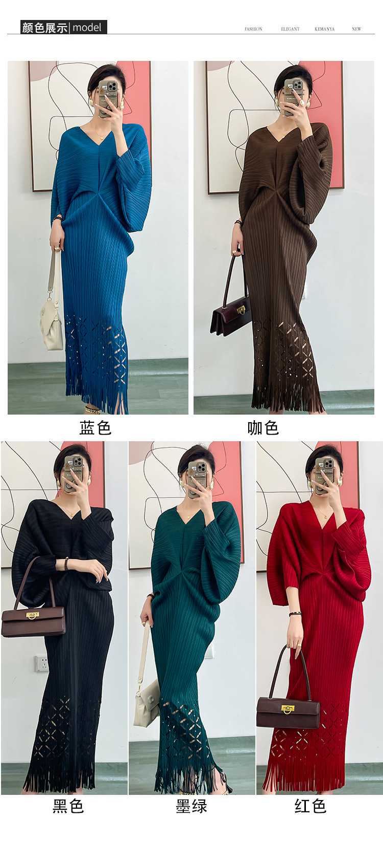 실제 촬영 삼이 플리츠 빅사이즈 원피스 2025 우아한 루즈핏 배트 슬리브 브이넥 슬림핏 피쉬테일 프린지 롱드레스