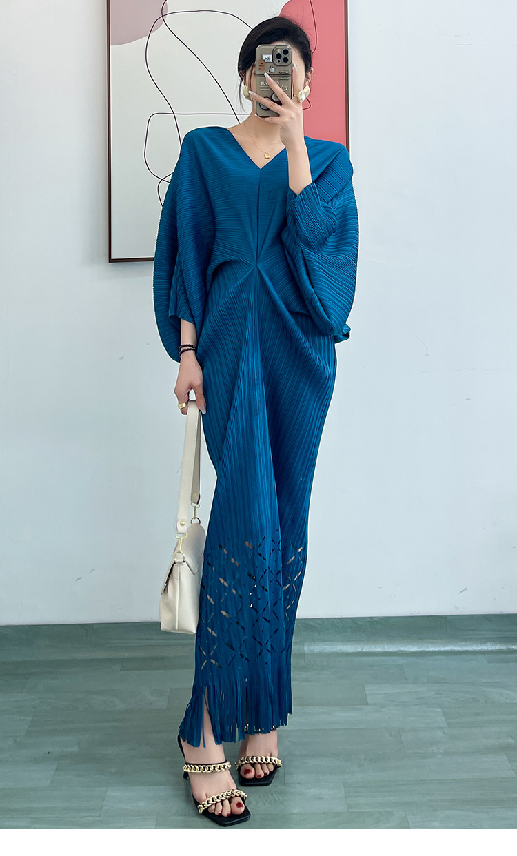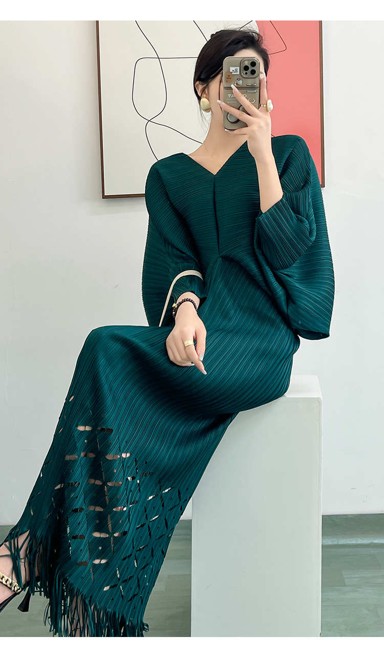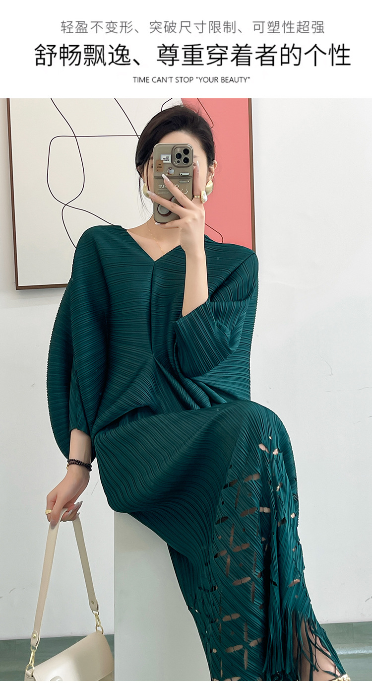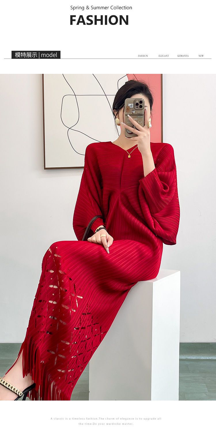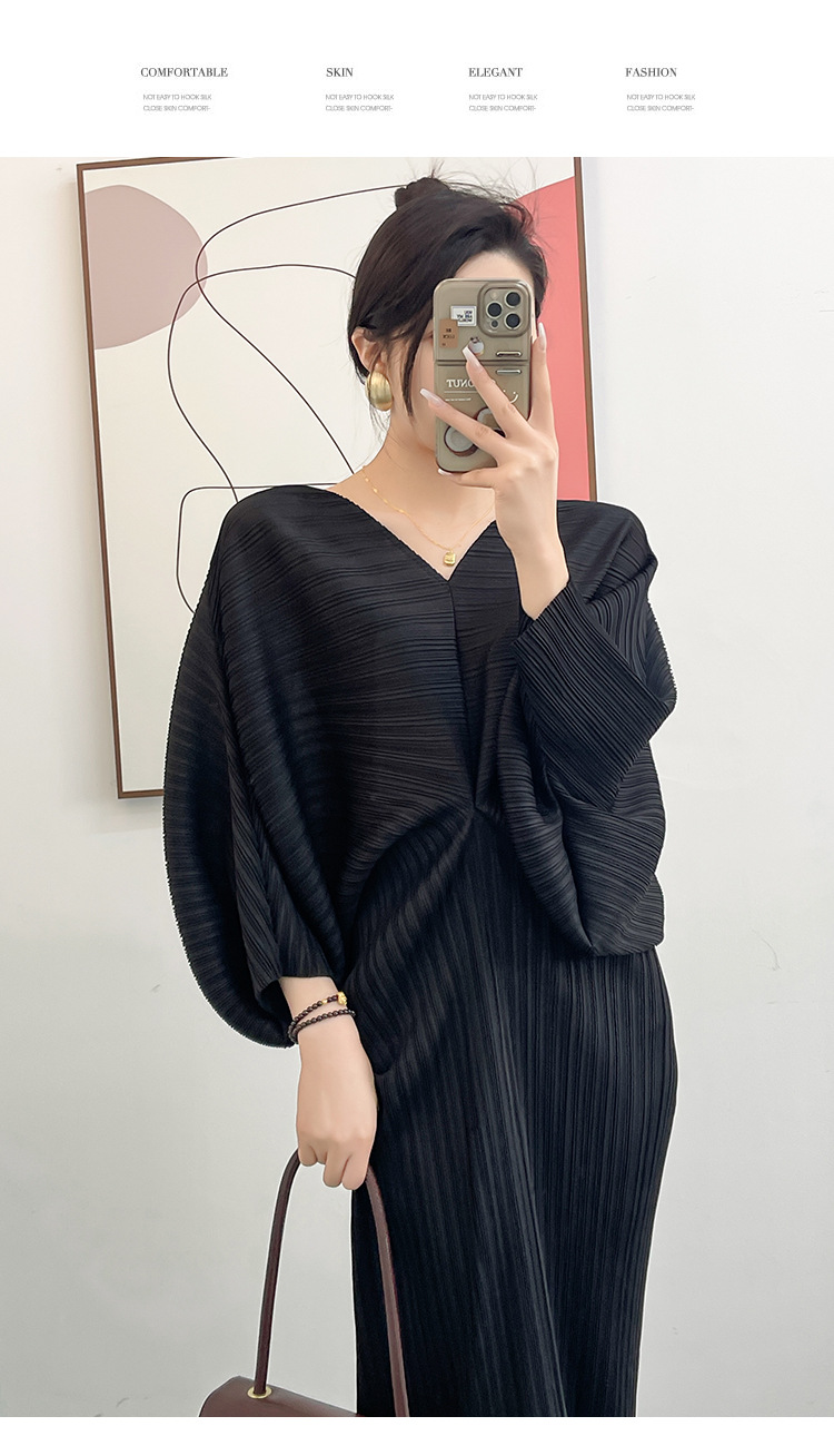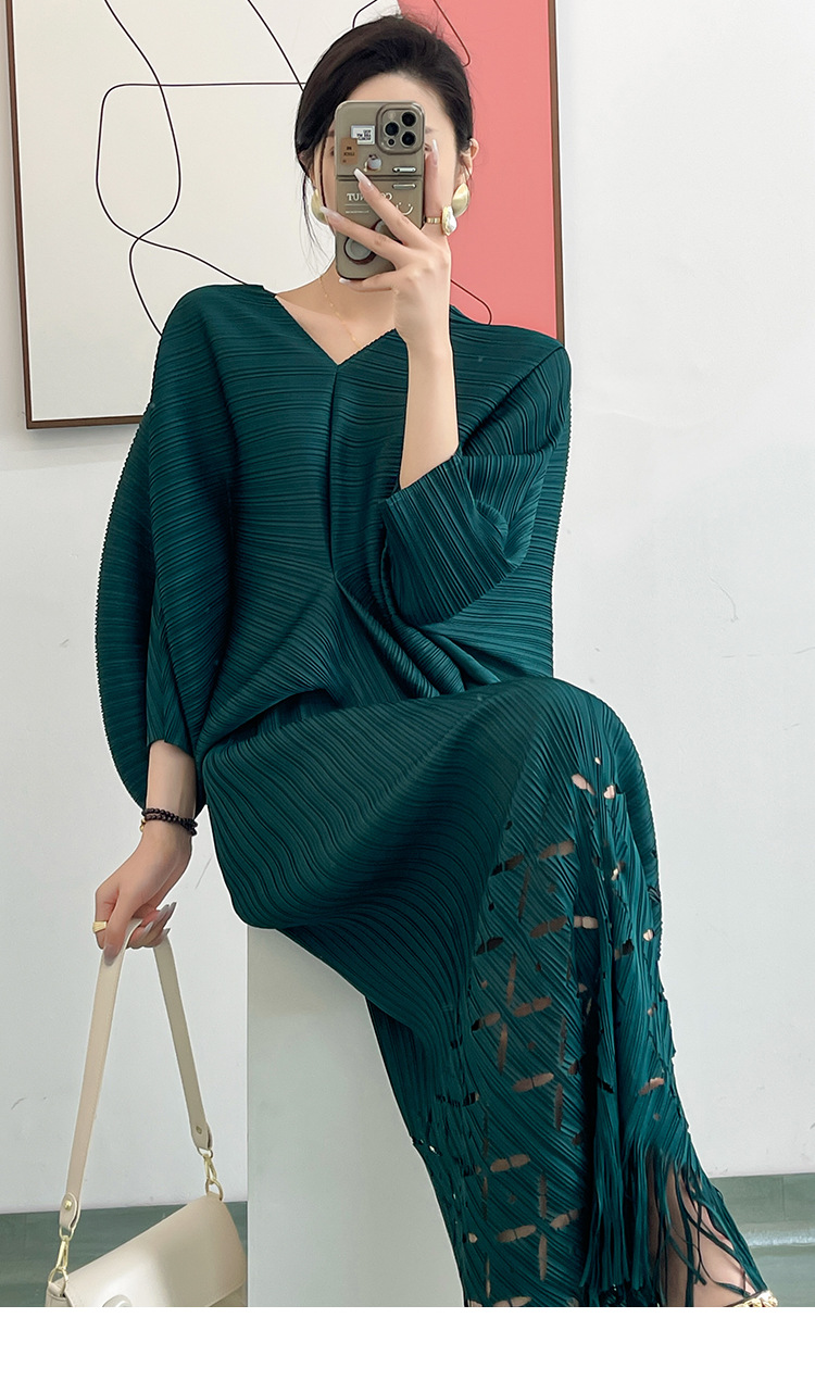 실제 촬영 삼이 플리츠 빅사이즈 원피스 2025 우아한 루즈핏 배트 슬리브 브이넥 슬림핏 피쉬테일 프린지 롱드레스