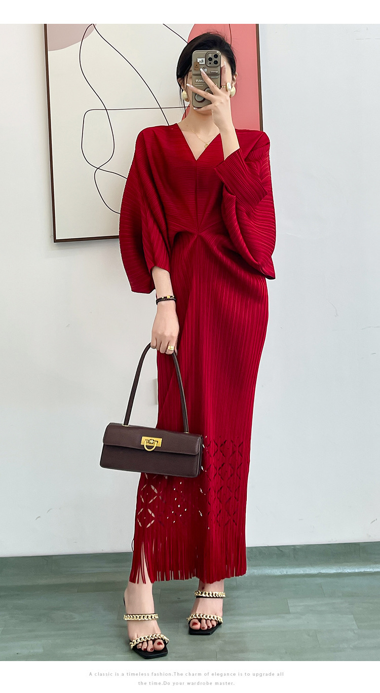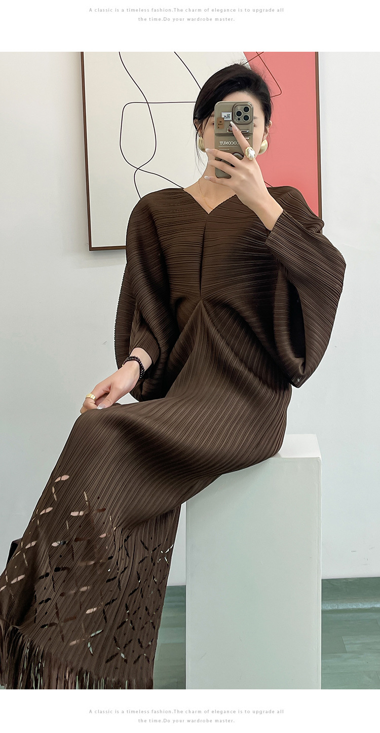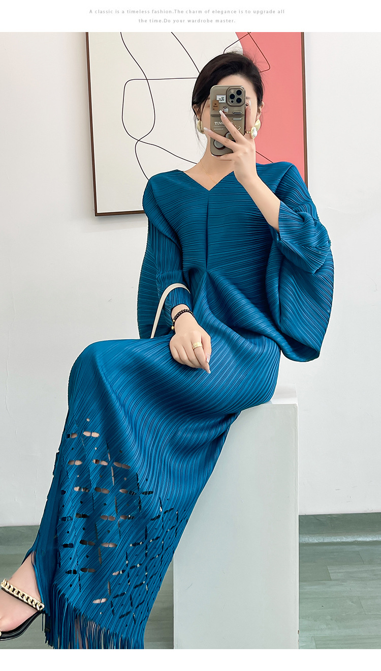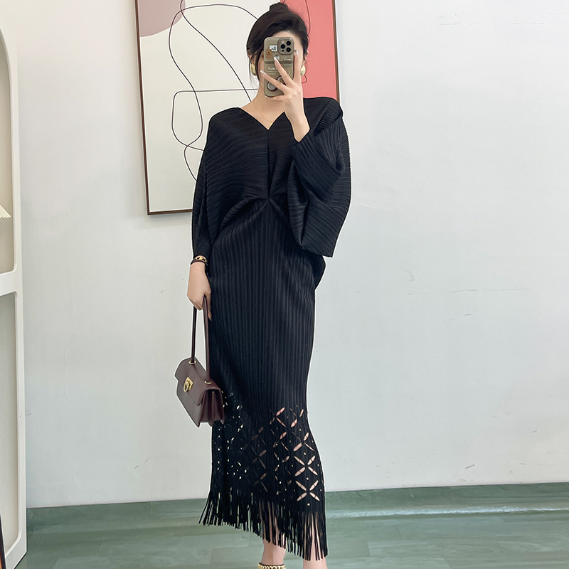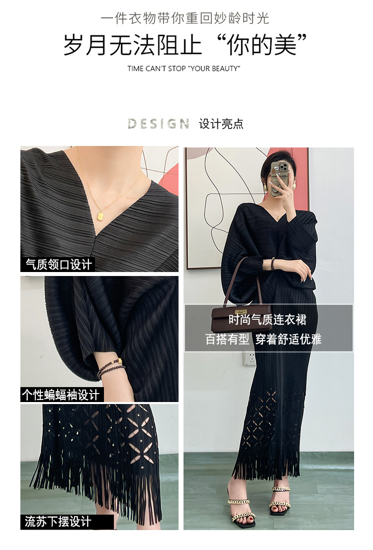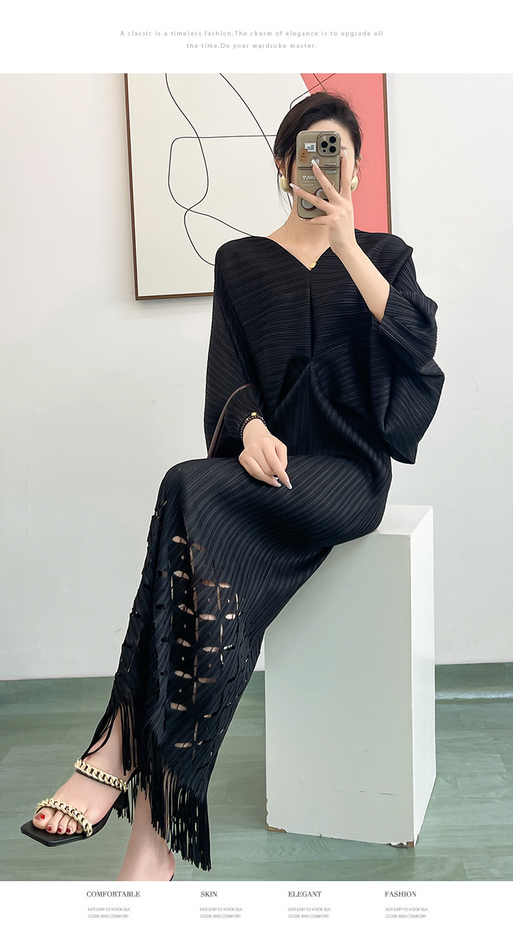 실제 촬영 삼이 플리츠 빅사이즈 원피스 2025 우아한 루즈핏 배트 슬리브 브이넥 슬림핏 피쉬테일 프린지 롱드레스