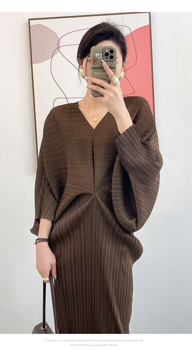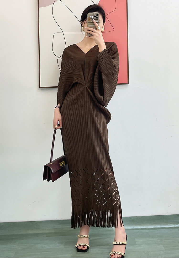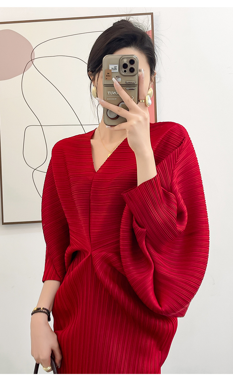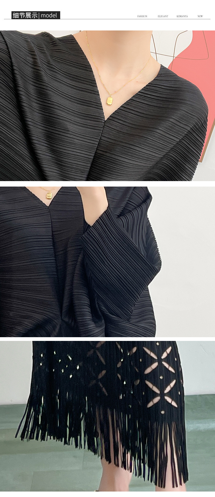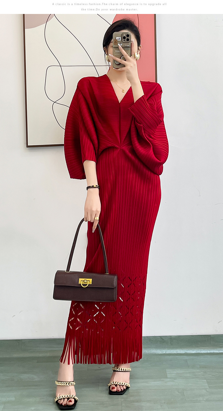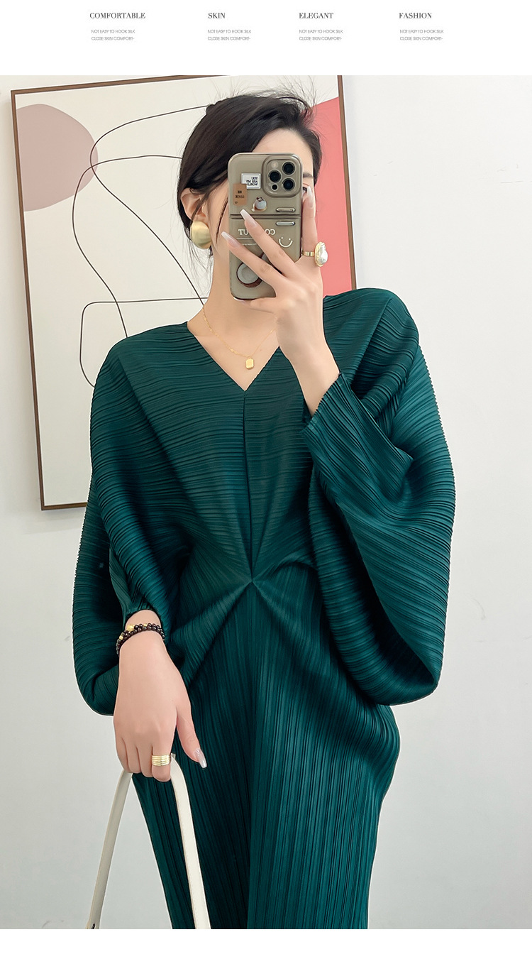 실제 촬영 삼이 플리츠 빅사이즈 원피스 2025 우아한 루즈핏 배트 슬리브 브이넥 슬림핏 피쉬테일 프린지 롱드레스