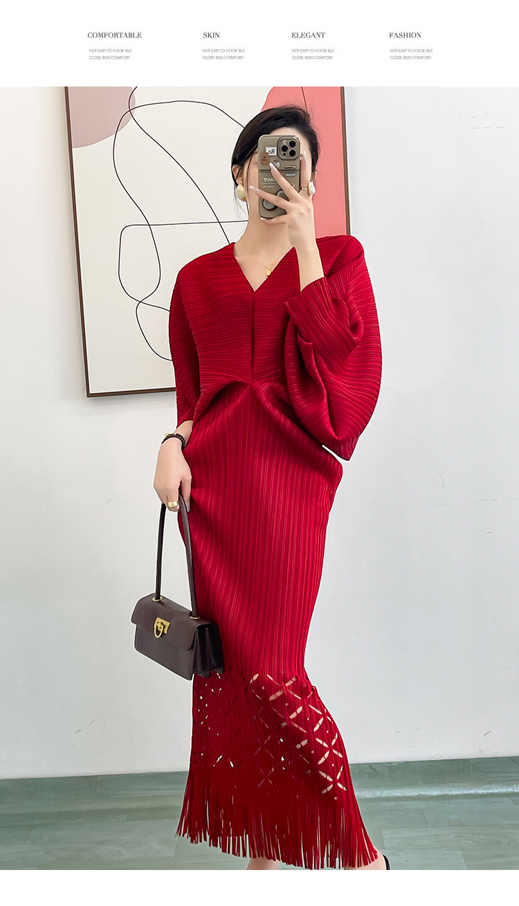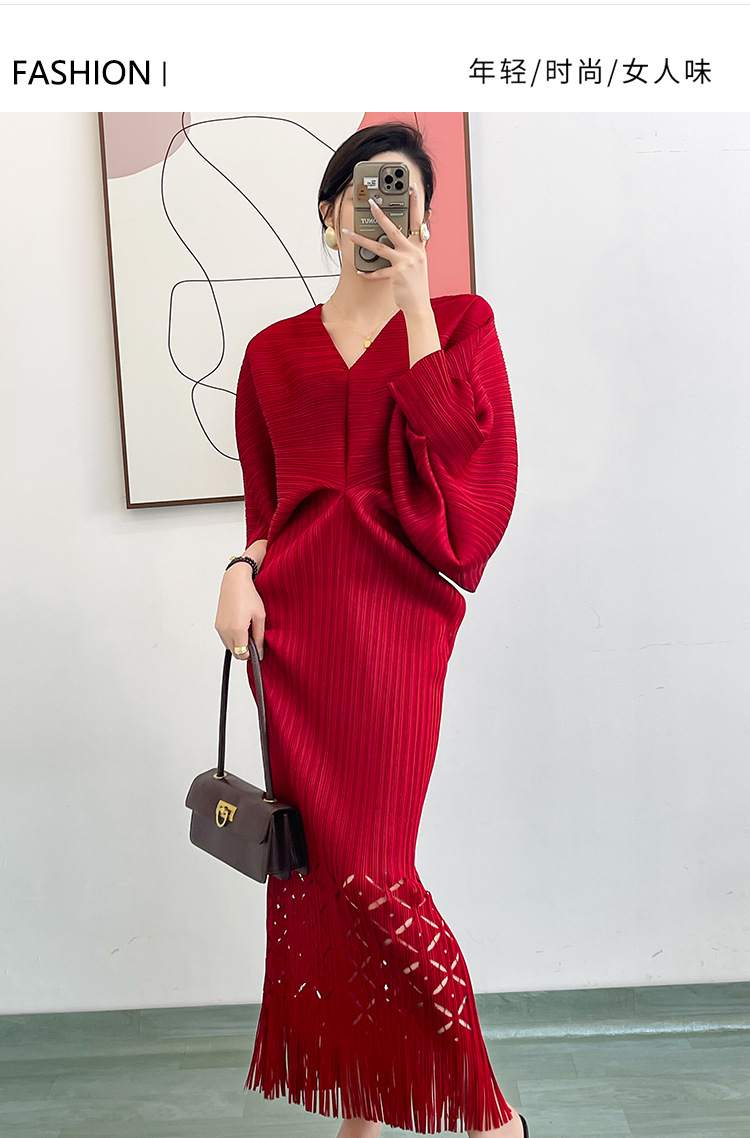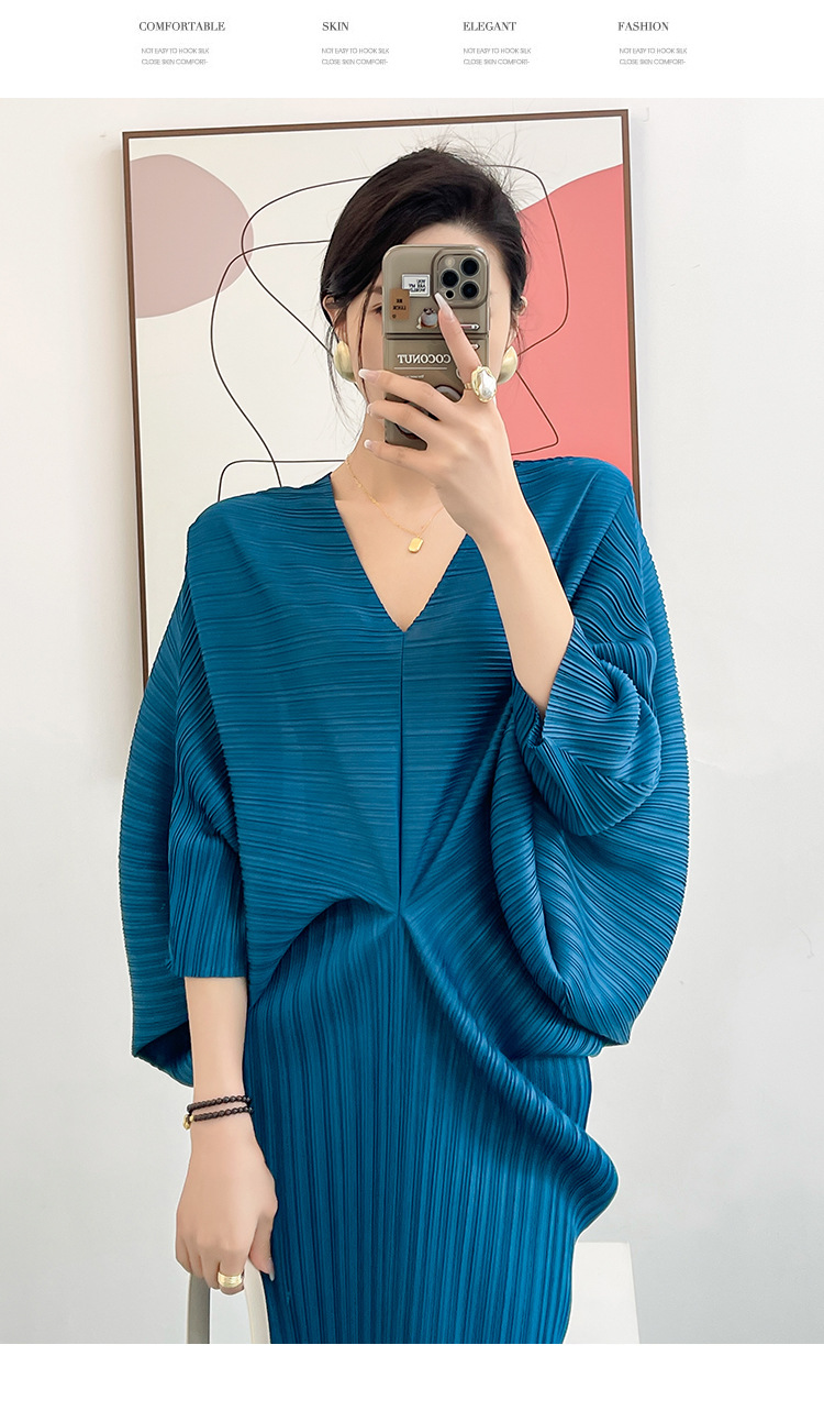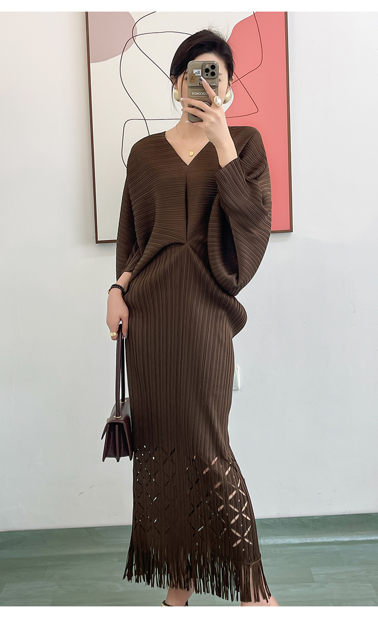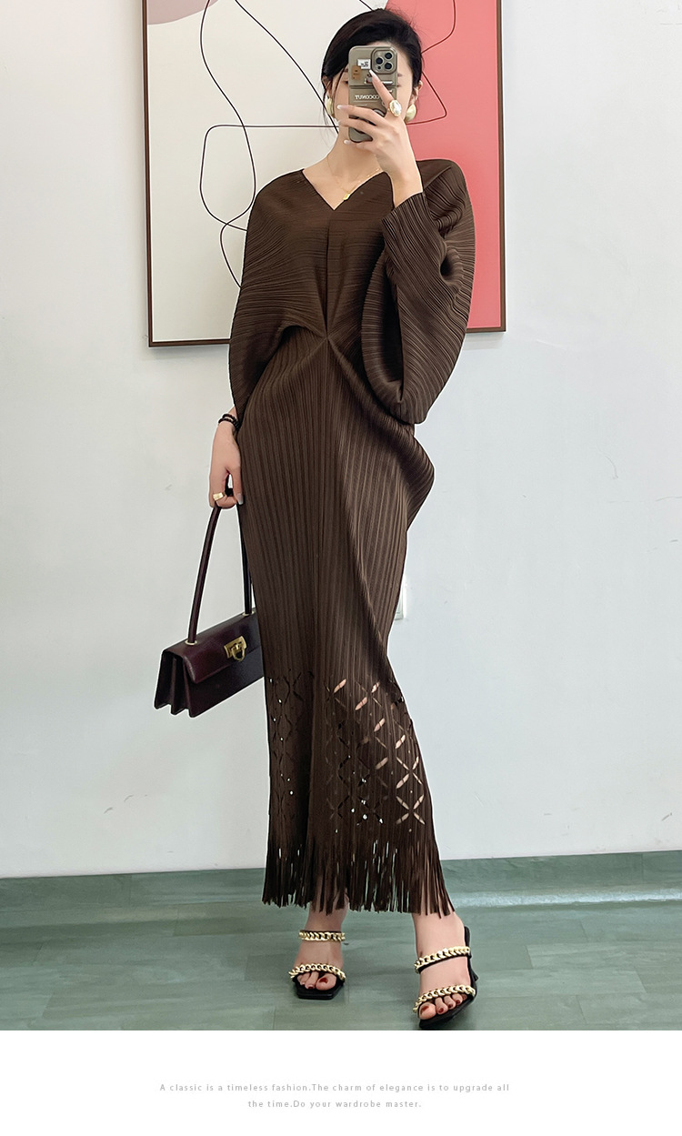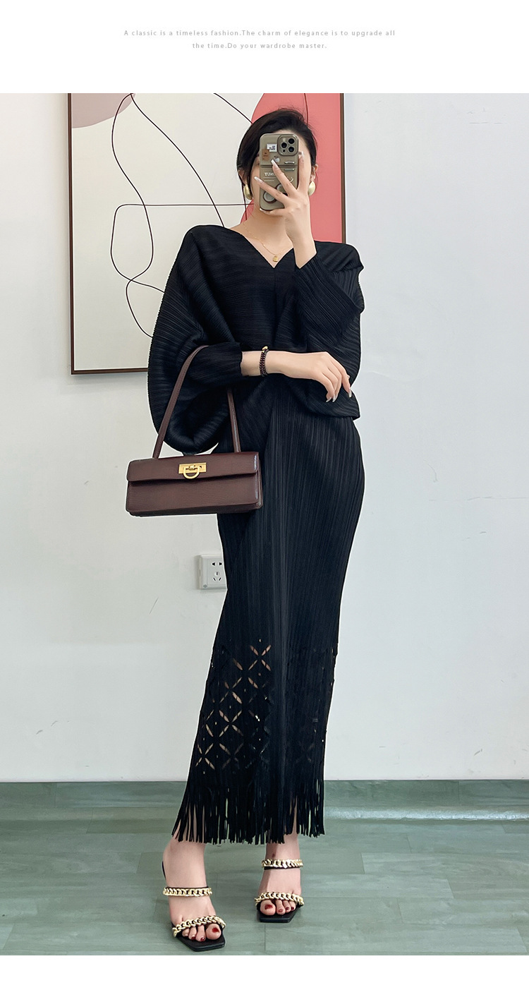 실제 촬영 삼이 플리츠 빅사이즈 원피스 2025 우아한 루즈핏 배트 슬리브 브이넥 슬림핏 피쉬테일 프린지 롱드레스