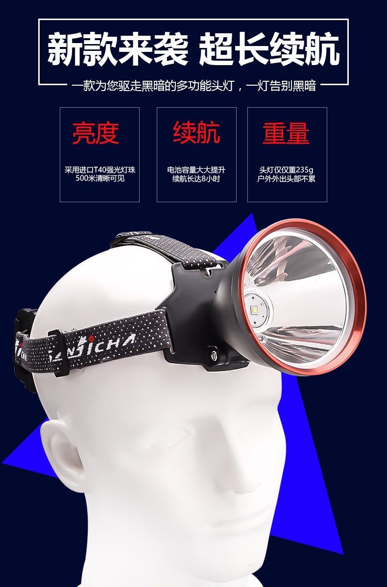 도매 t40 헤드램프 강한 빛 충전 슈퍼 브라이트 장거리 헤드 장착 야외 장거리 고출력 조명 헤드램프