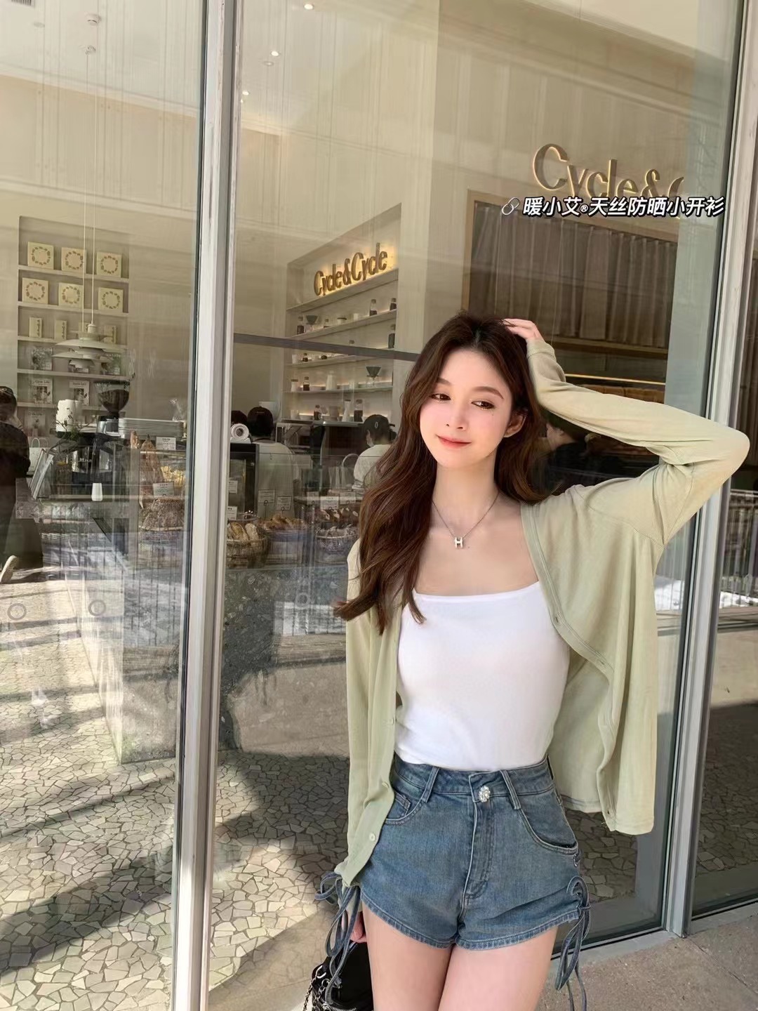 일본 신상품 텐셀 카디건 여성용 긴팔 여름 얇은 스트랩 오버셔츠 V넥 에어컨 블라우스 탑스토어 가기