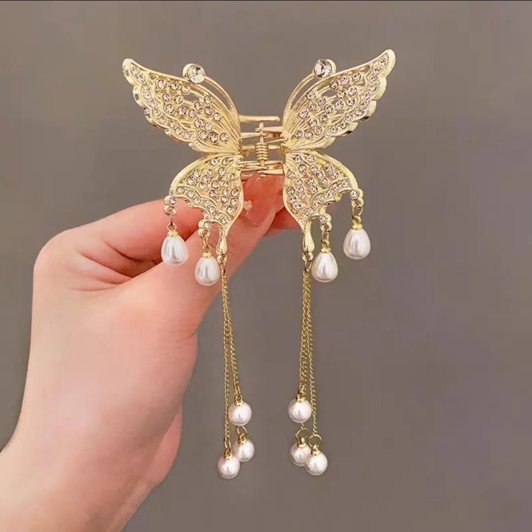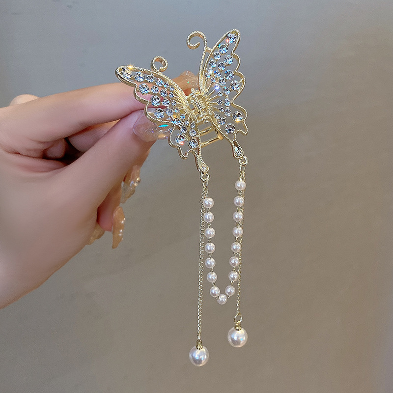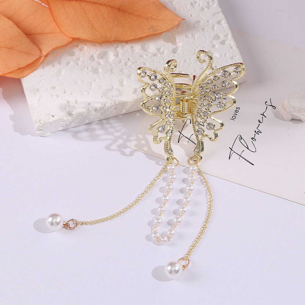 나비 술 진주 그립 클립 고급 여성 기질 뒤 머리 반 머리 클립 머리 장식 금속 중간 머리 그립