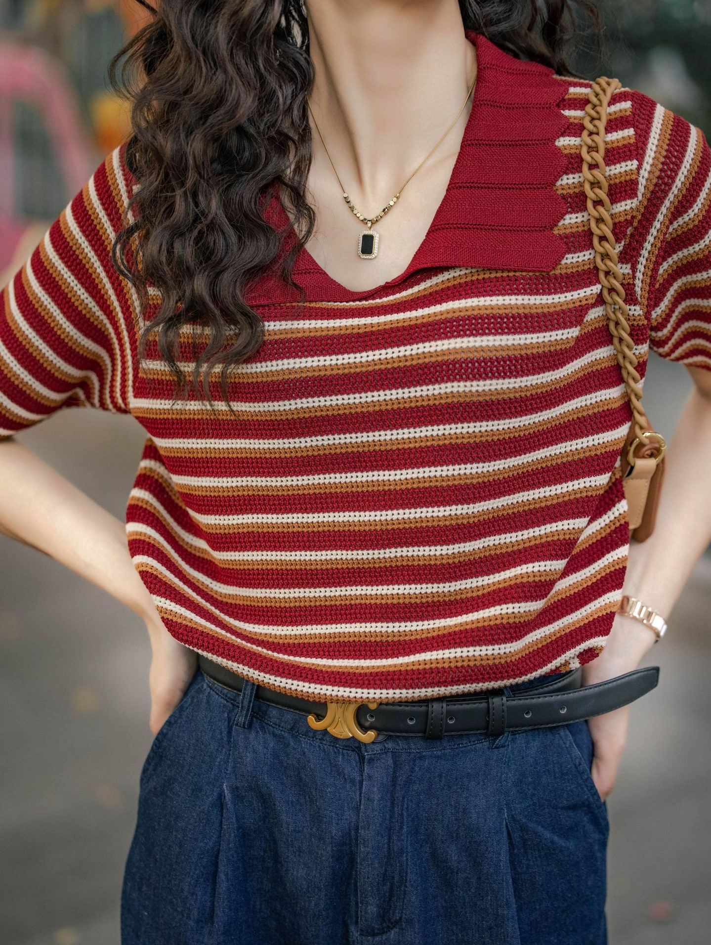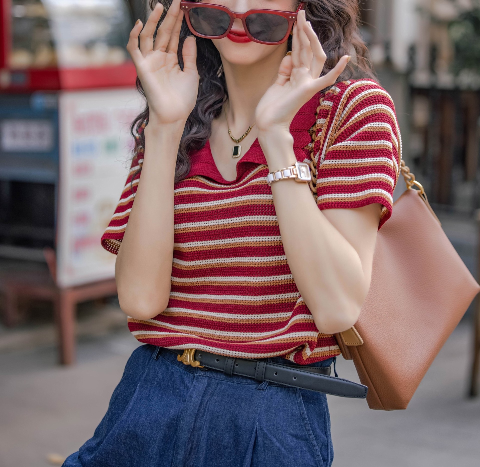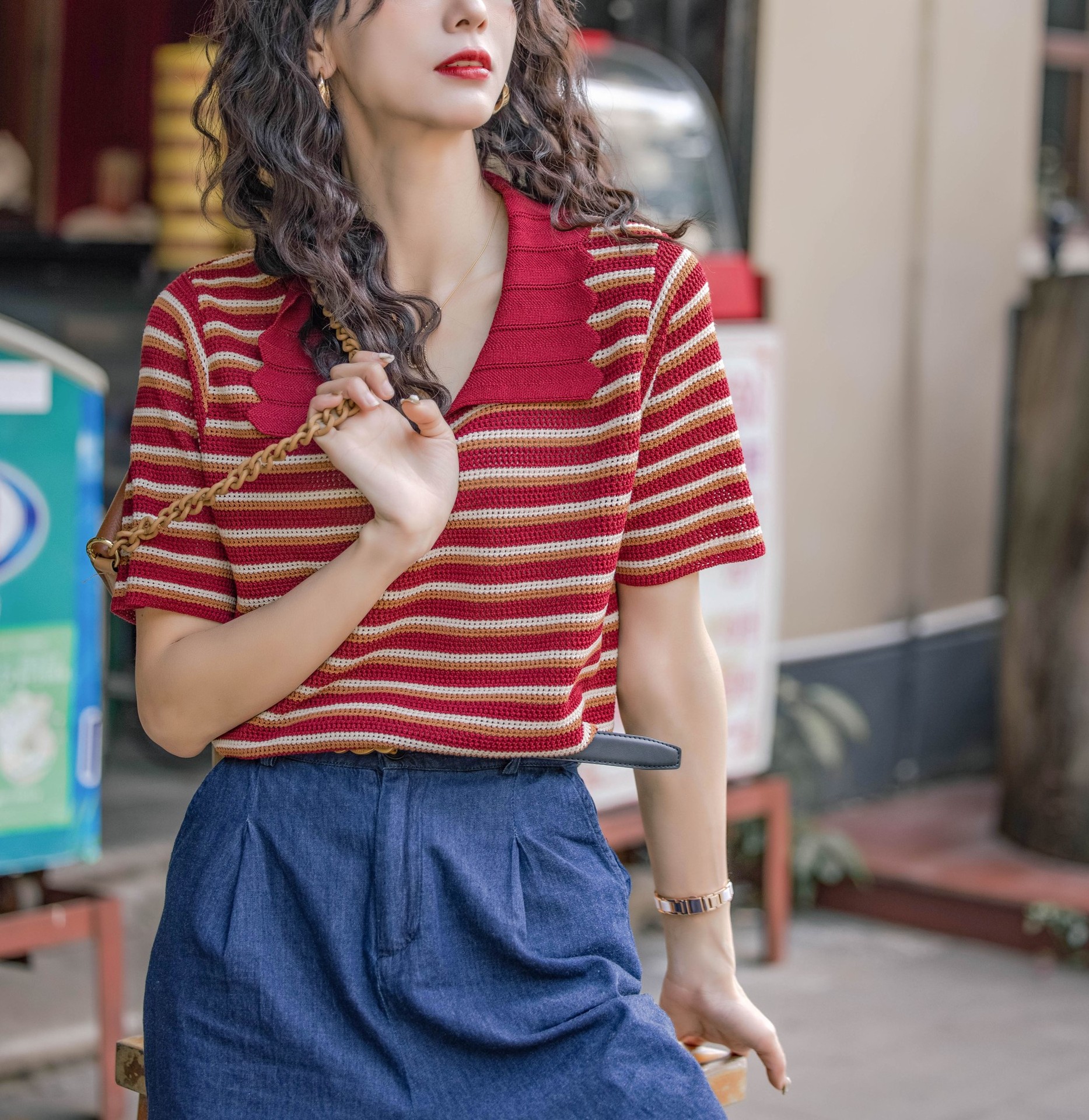 레드 스트라이프 폴로 셔츠 여름 홍콩 스타일 레트로 숄더 여성용 반팔 니트 티셔츠 여성용 틈새 시크 탑스토어 가기