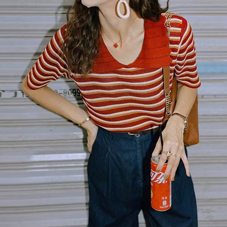 레드 스트라이프 폴로 셔츠 여름 홍콩 스타일 레트로 숄더 여성용 반팔 니트 티셔츠 여성용 틈새 시크 탑