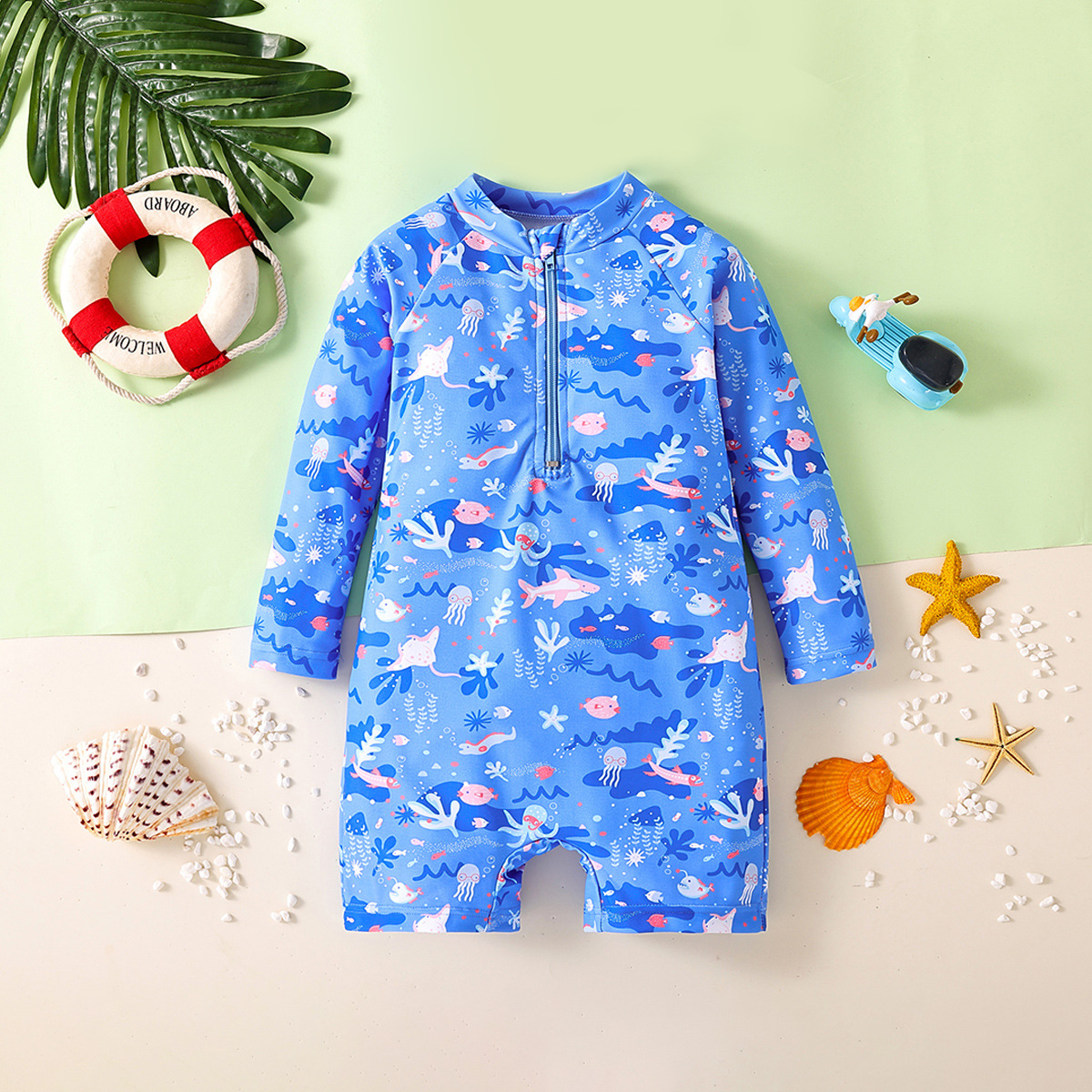 SAMGAMIBABY 아동복 남아 여름 비치 수영복 어린이 장난 인쇄 긴 소매 원피스 수영복 수영 모자