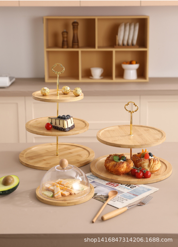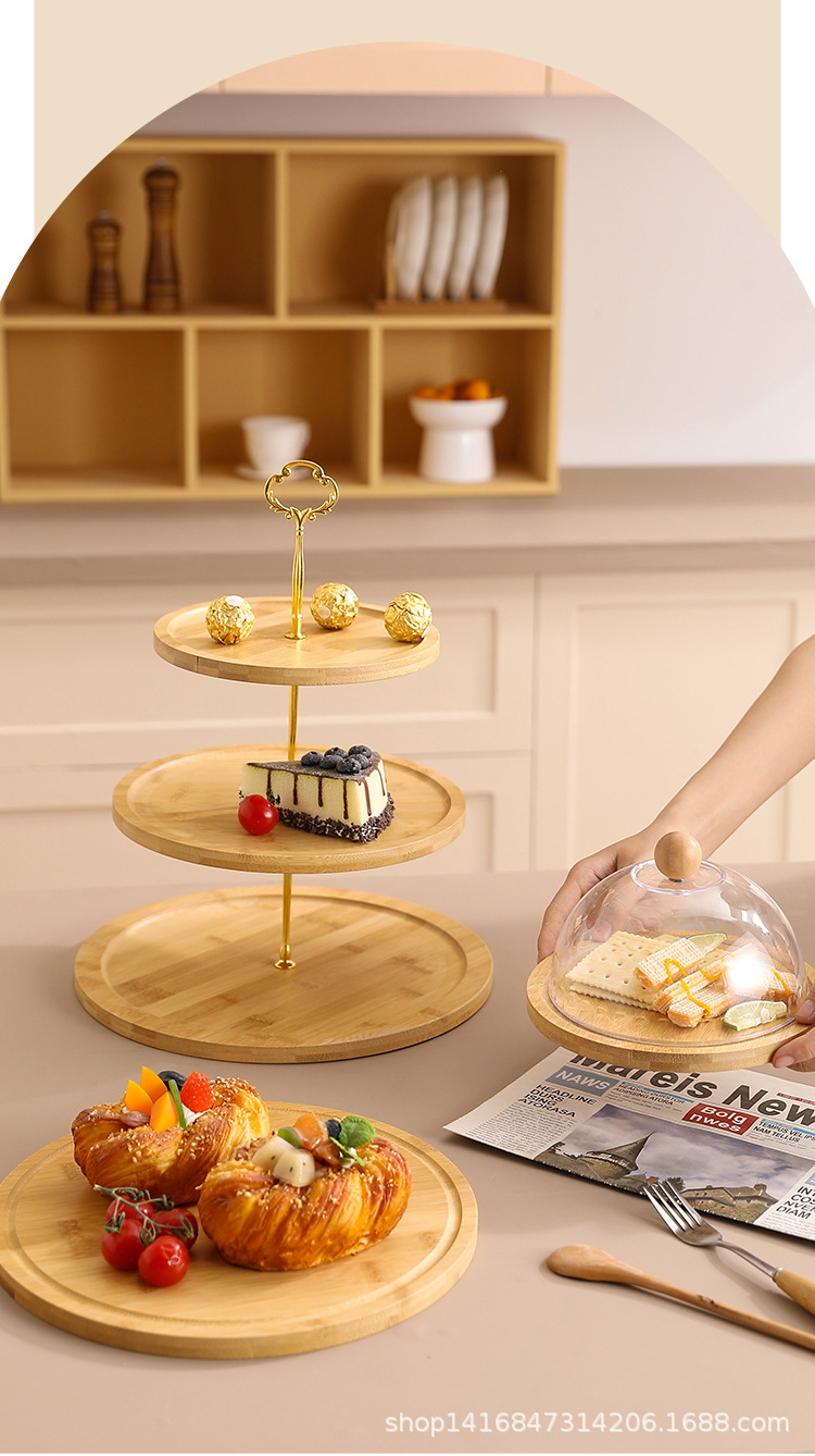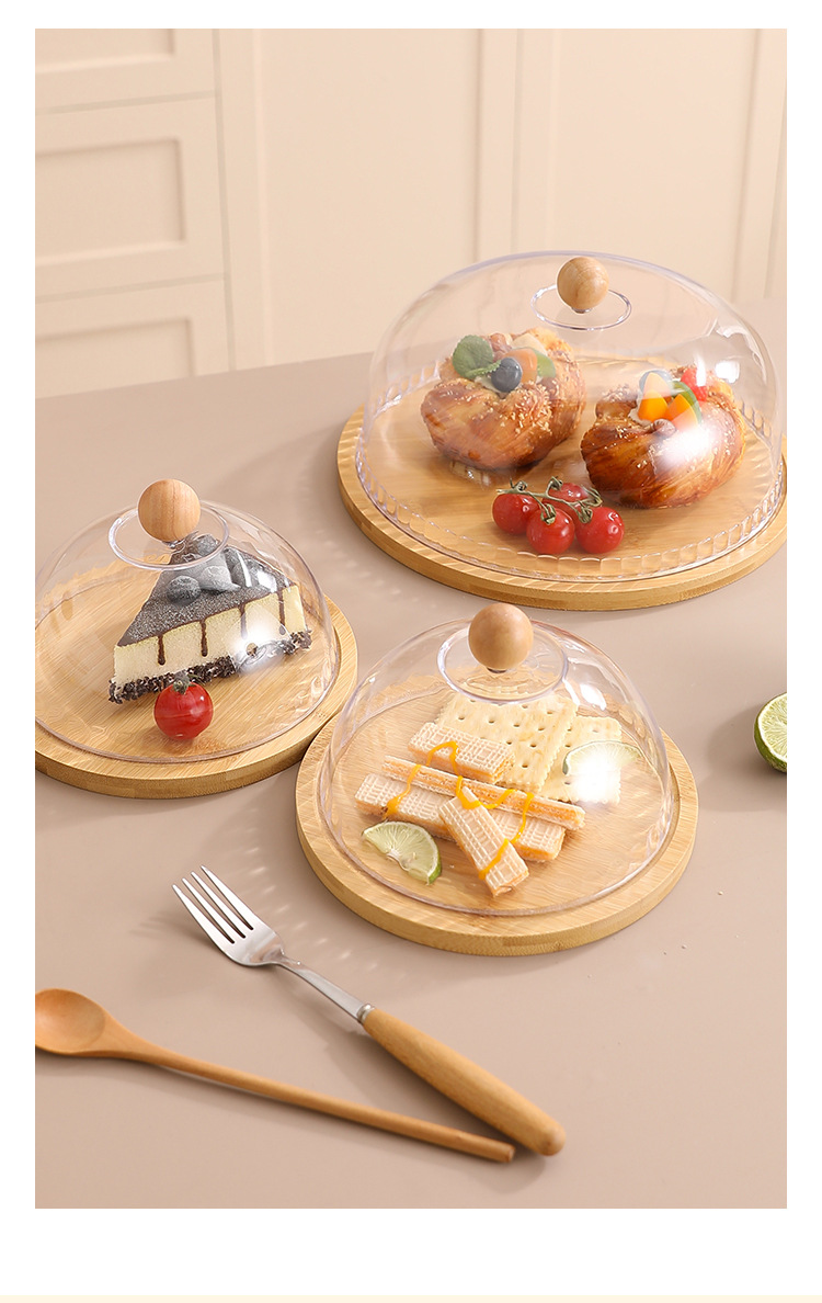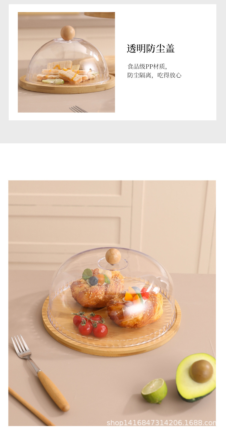 대나무 다층 스낵 트레이 스낵 과일 케이크 트레이 홈 실용 방진 투명 커버 디저트 트레이 목재 제품스토어 가기