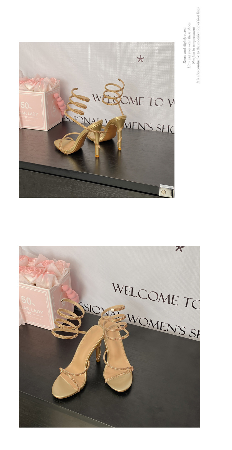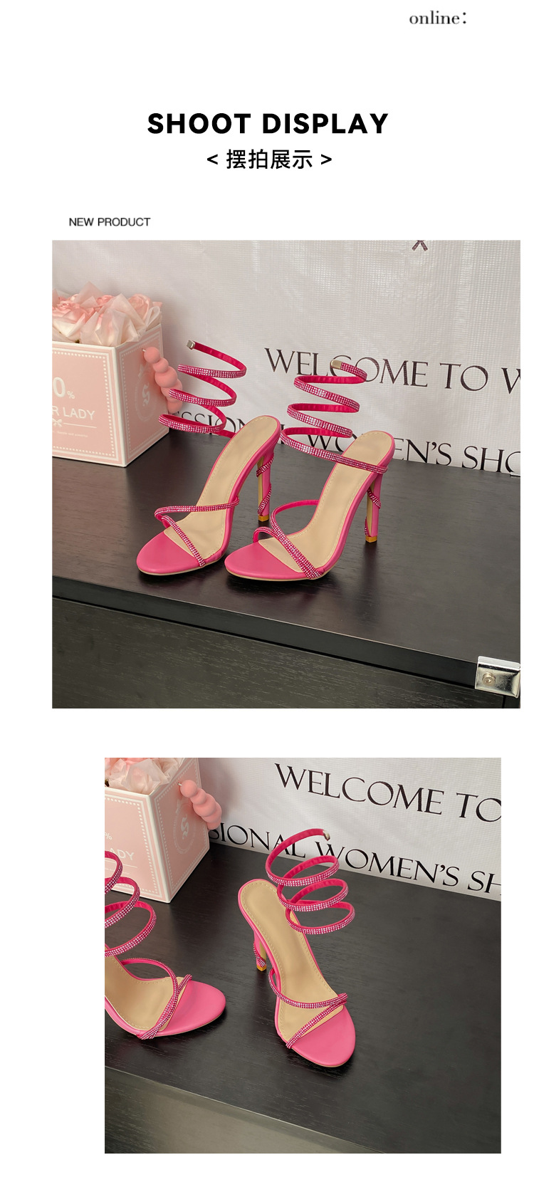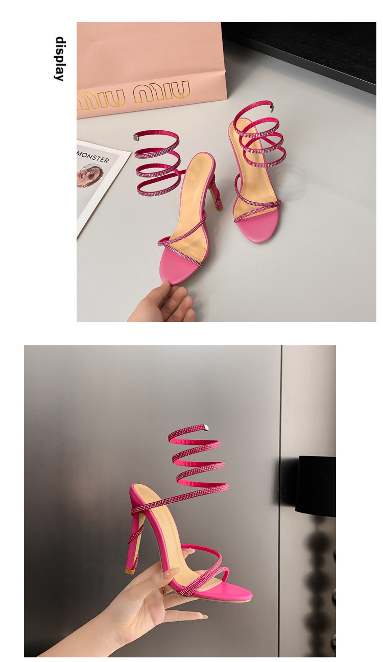 2023 새로운 여름 뱀 모양의 모조 다이아몬드 하이힐 사이버 연예인 요정 바람에 싸인 얇은 굽 샌들 여성 도매 대외 무역스토어 가기