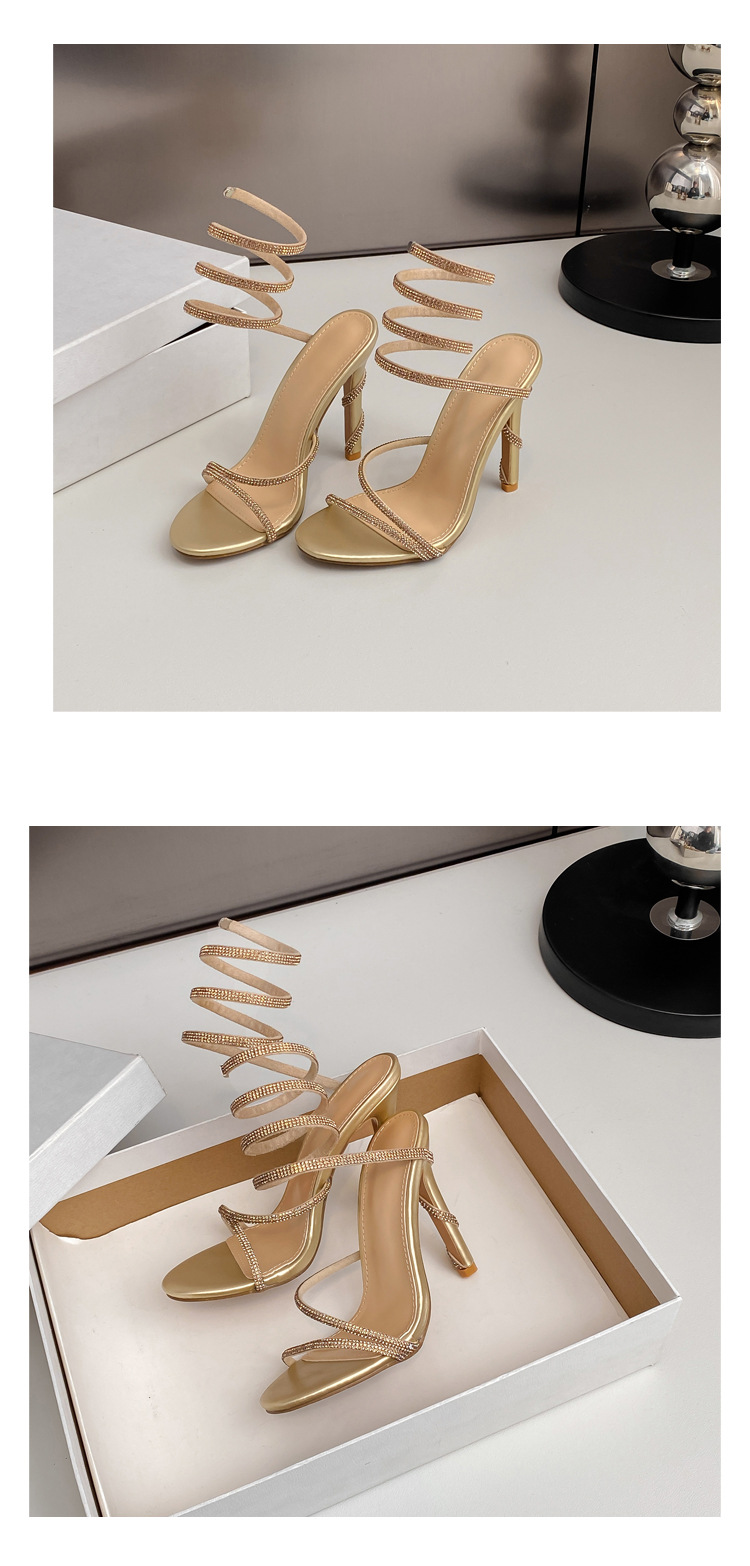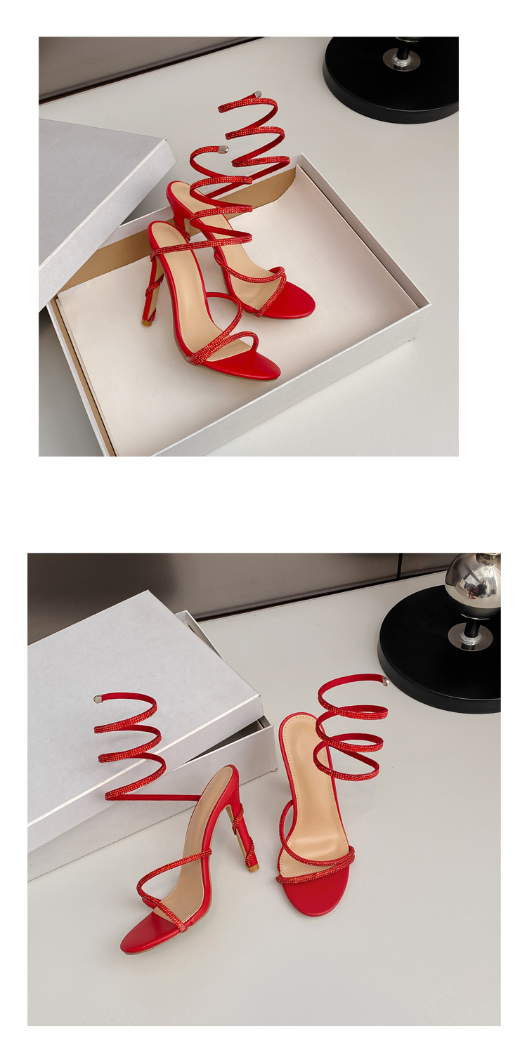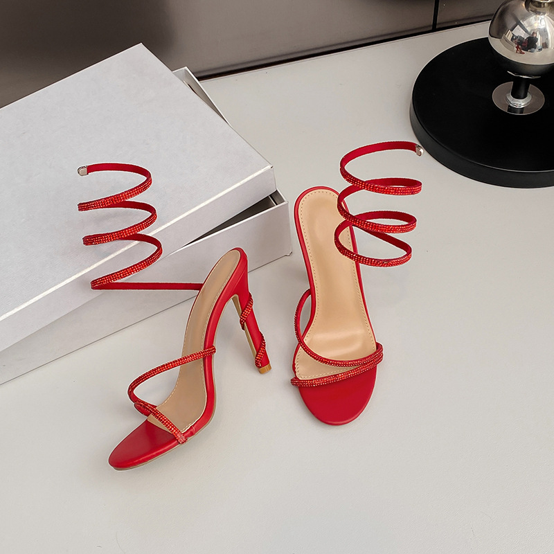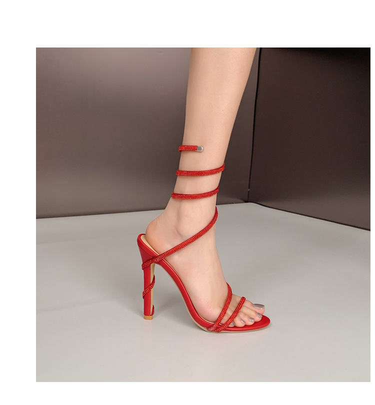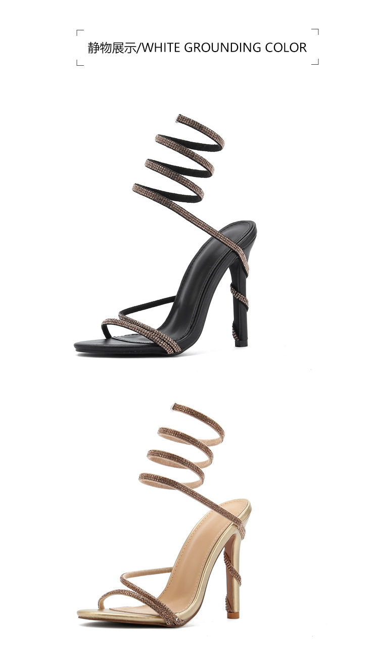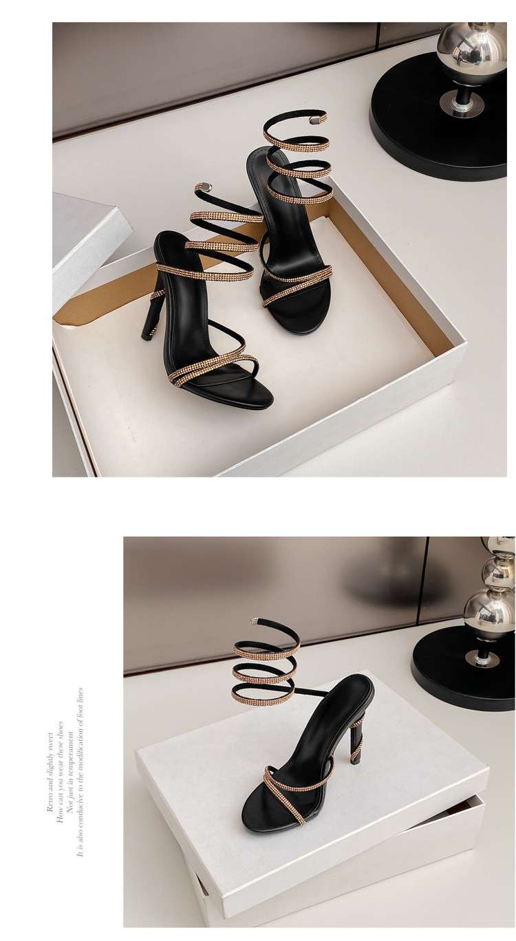 2023 새로운 여름 뱀 모양의 모조 다이아몬드 하이힐 사이버 연예인 요정 바람에 싸인 얇은 굽 샌들 여성 도매 대외 무역