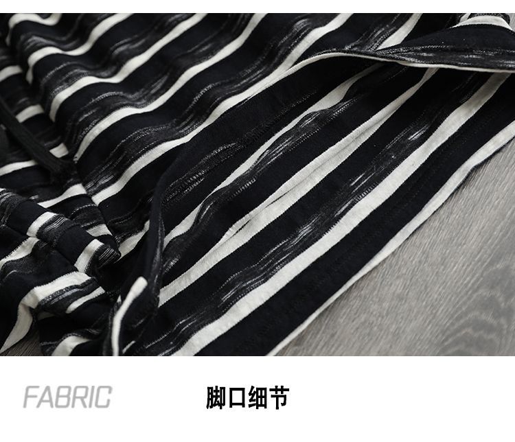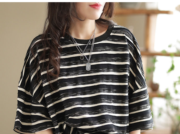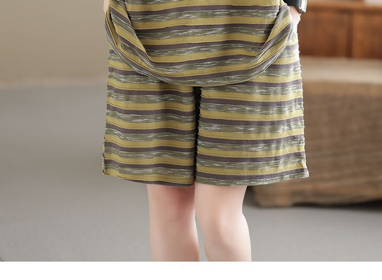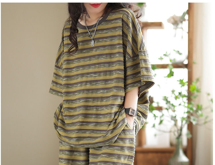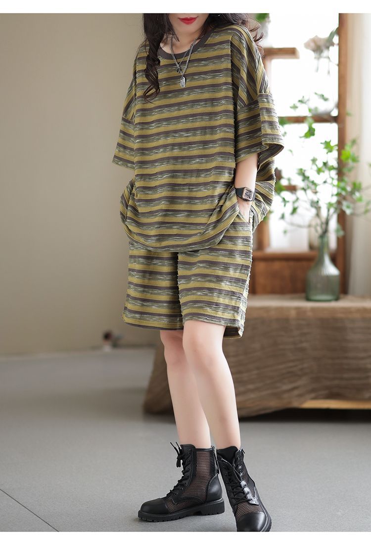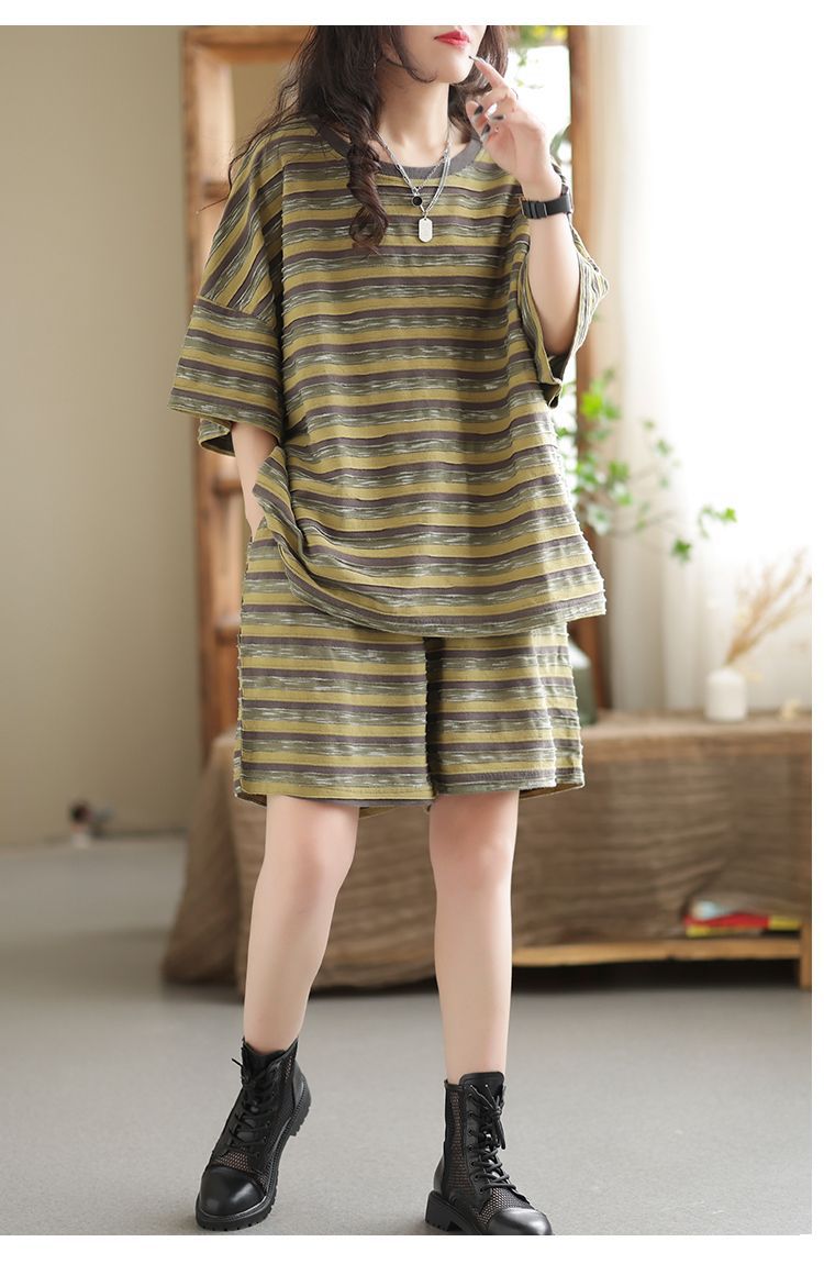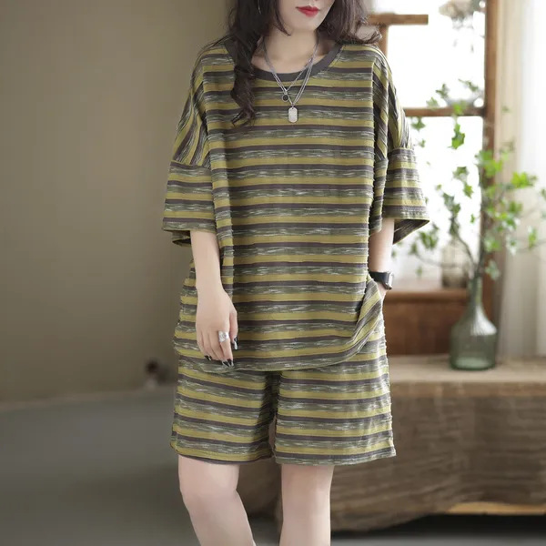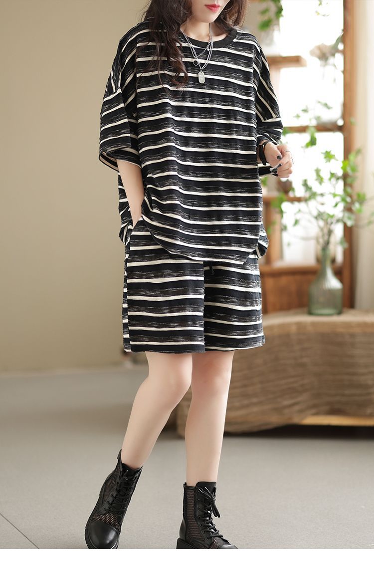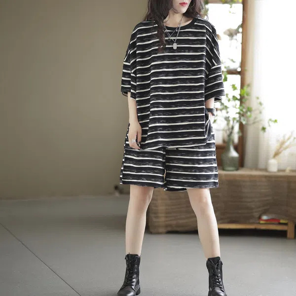 2024 여름 대형 여성 의류 유행 줄무늬 반팔 티셔츠 반바지 느슨한 슬리밍 캐주얼 투피스 세트스토어 가기