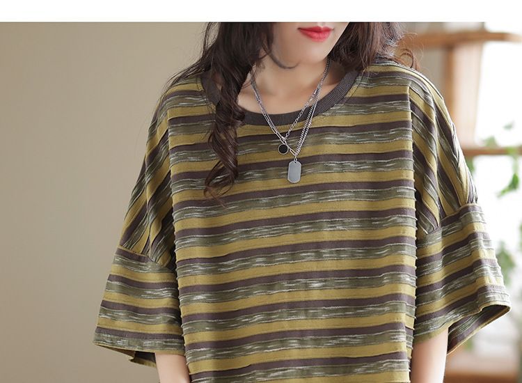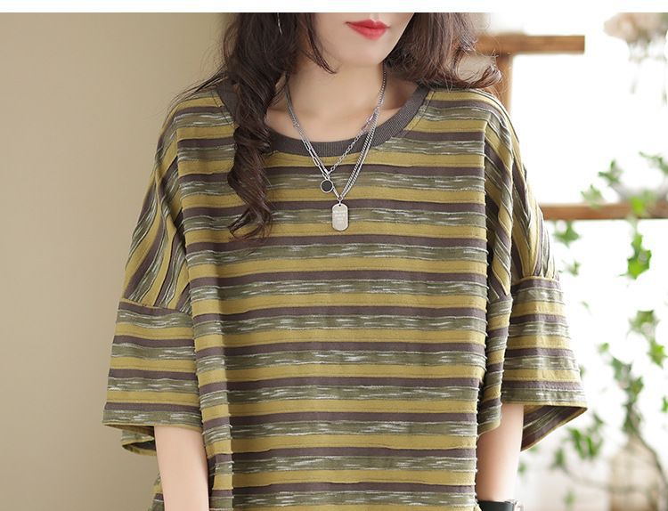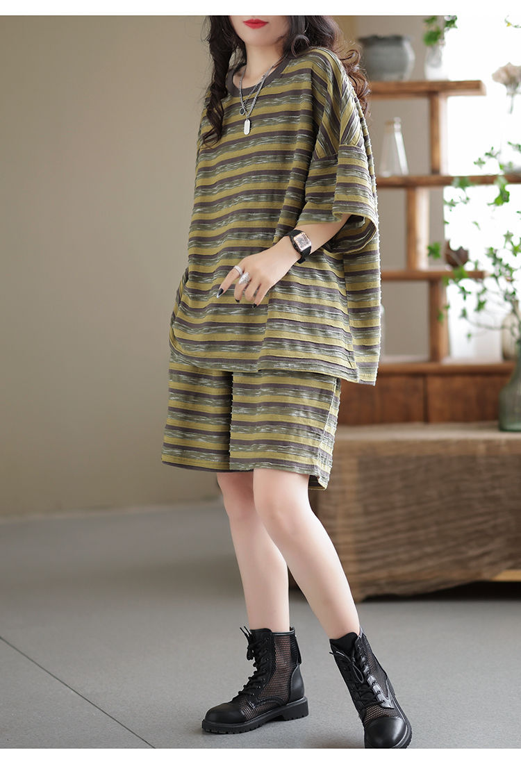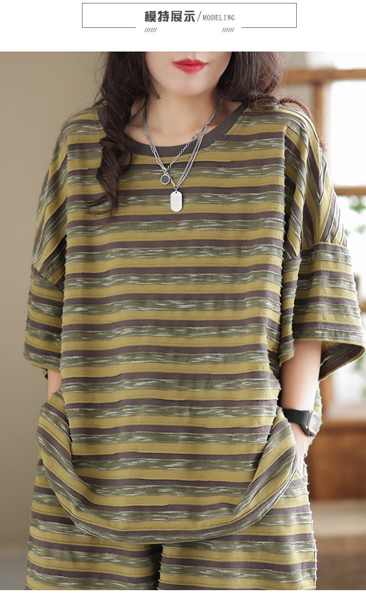 2024 여름 대형 여성 의류 유행 줄무늬 반팔 티셔츠 반바지 느슨한 슬리밍 캐주얼 투피스 세트