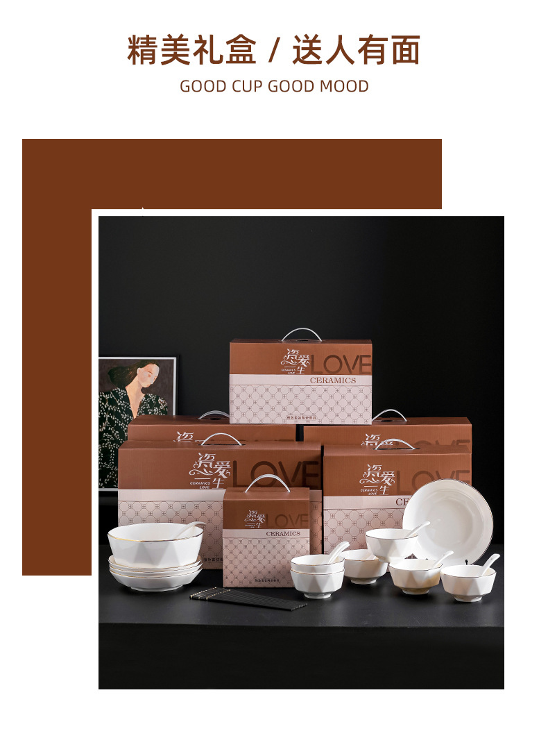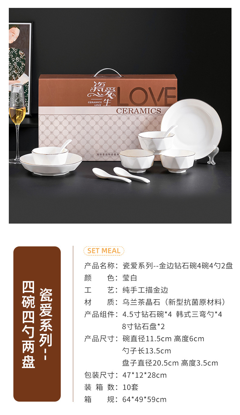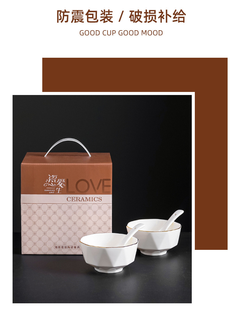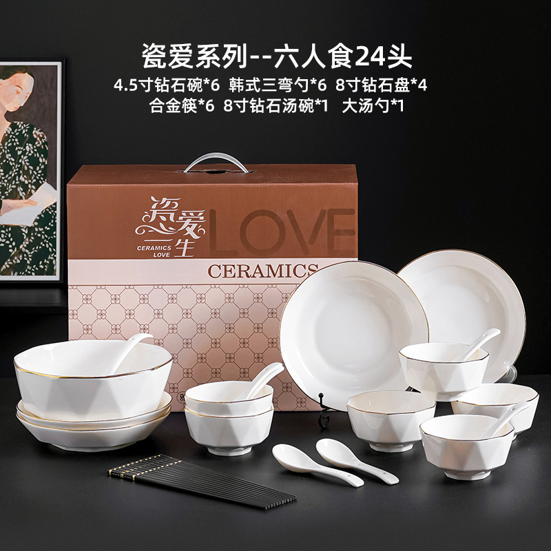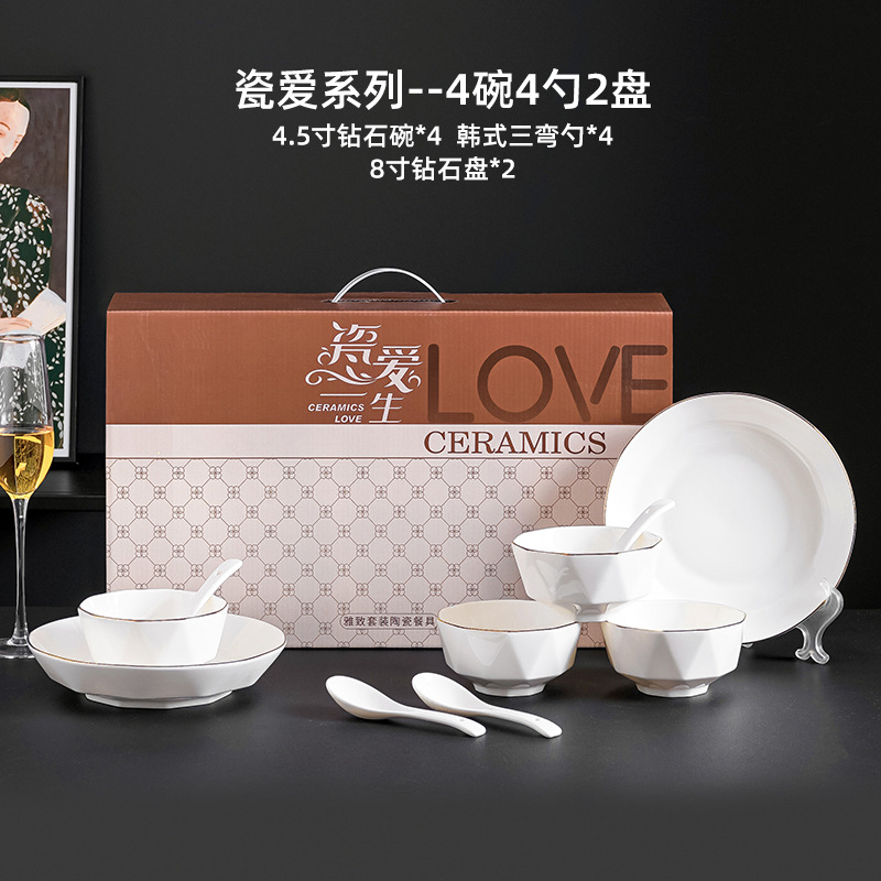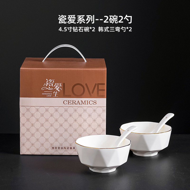 프놈펜 다이아몬드 그릇 세라믹 식기 가정용 그릇 숟가락 세트 간단한 단색 그릇 젓가락 세트 선물 상자 인쇄 로고