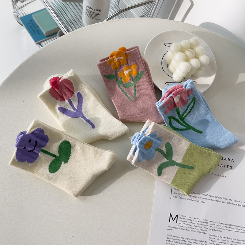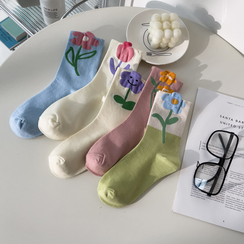 튤립 양말 여성용 가을 겨울 꽃무늬 시리즈 롱 양말 작은 꽃 흰색 미드 양말 검정색 여성용 꽃무늬