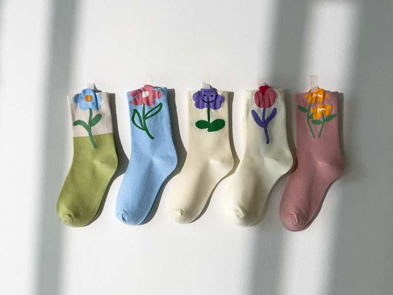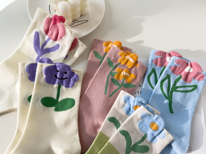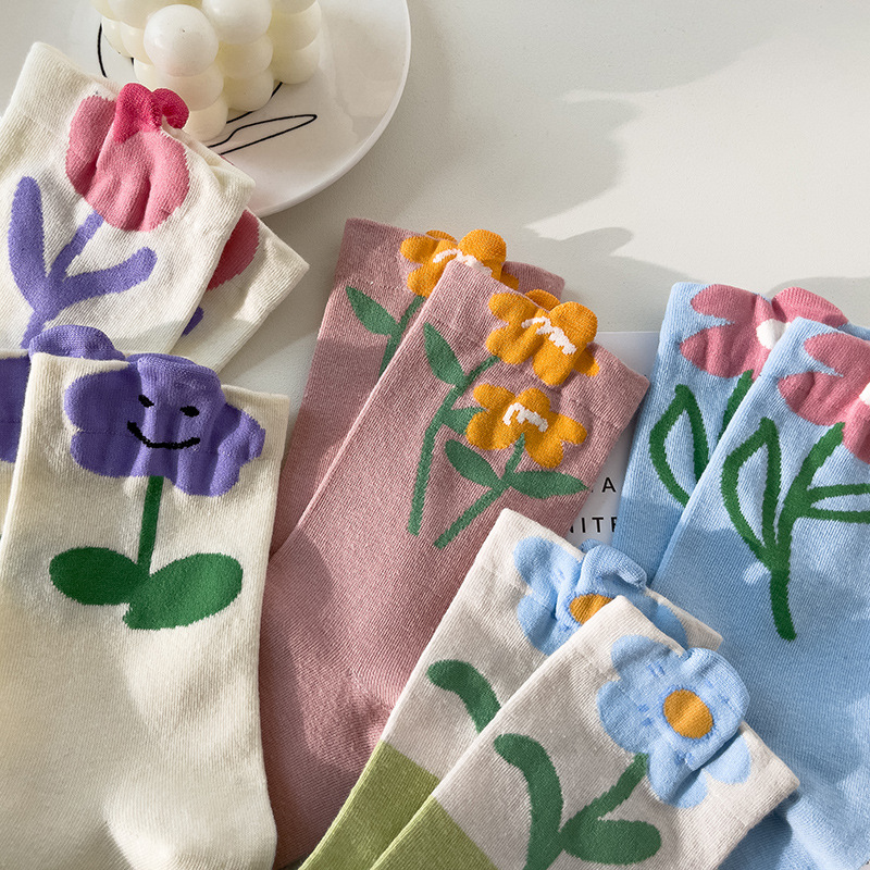 튤립 양말 여성용 가을 겨울 꽃무늬 시리즈 롱 양말 작은 꽃 흰색 미드 양말 검정색 여성용 꽃무늬스토어 가기