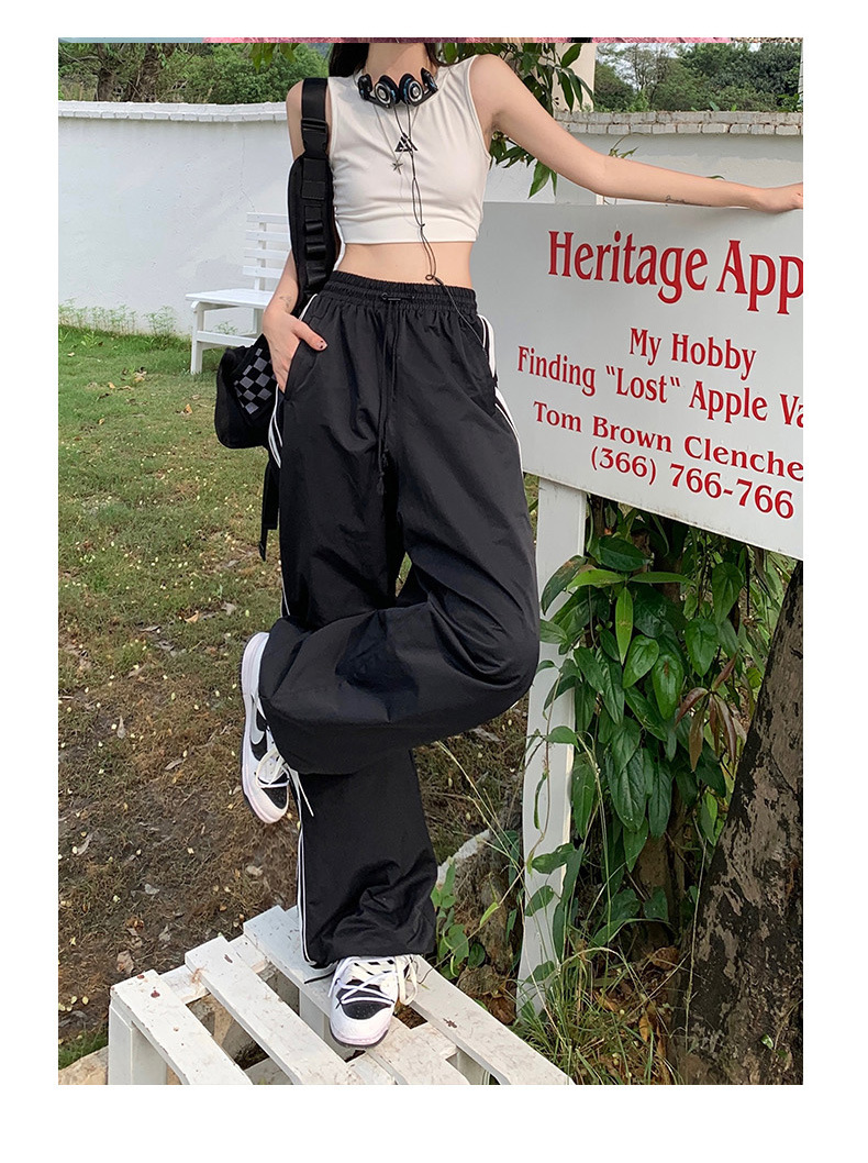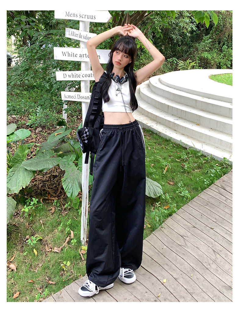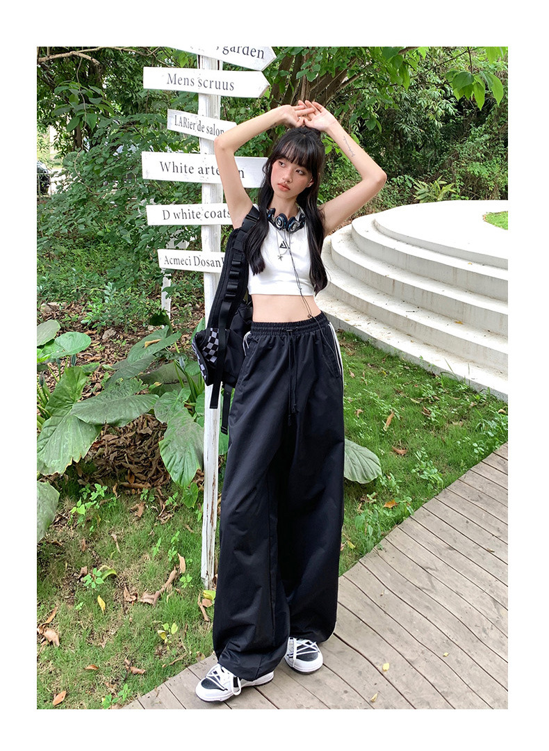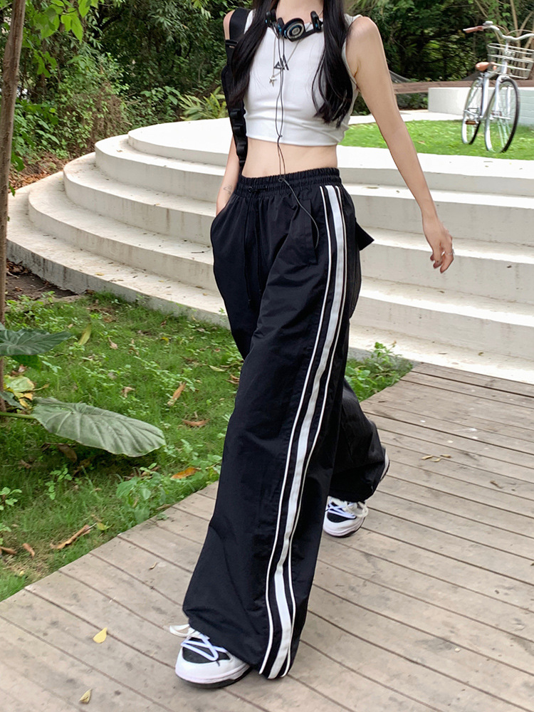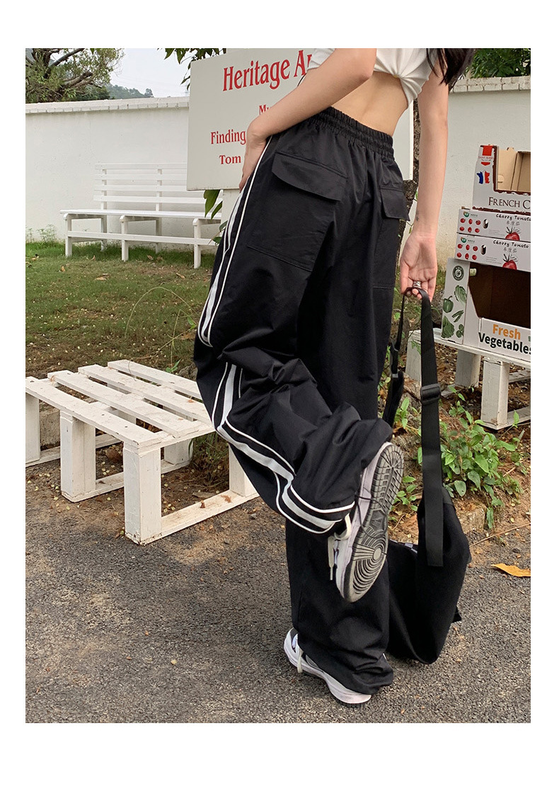 블랙 스포츠 팬츠 여성용 봄과 여름 아메리칸 스트레이트 루즈한 와이드 레그 차지 팬츠 드레이핑 사이드 스트라이프 캐주얼 팬츠
