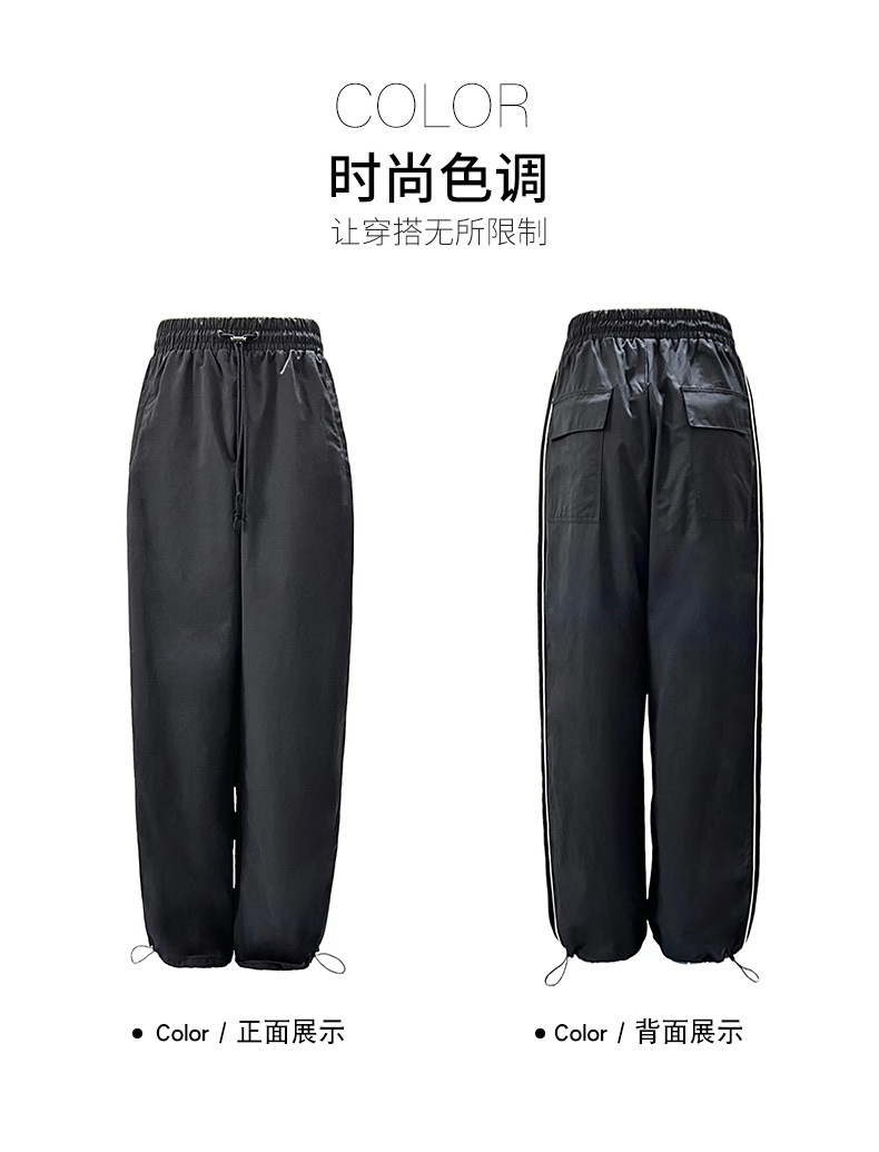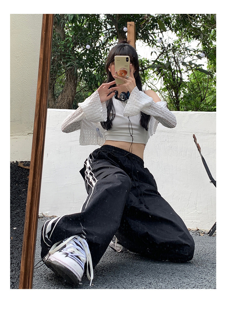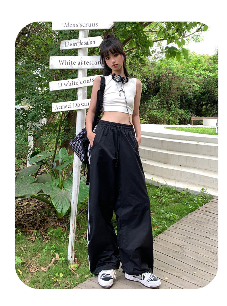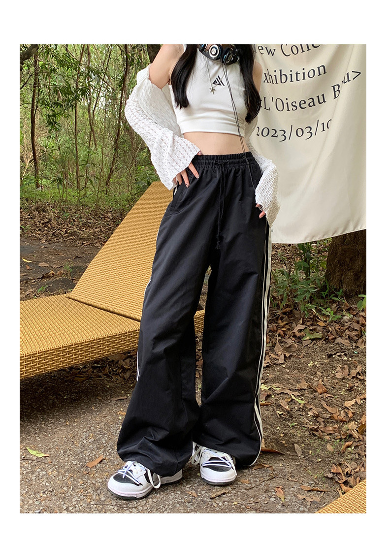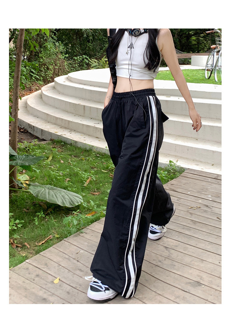 블랙 스포츠 팬츠 여성용 봄과 여름 아메리칸 스트레이트 루즈한 와이드 레그 차지 팬츠 드레이핑 사이드 스트라이프 캐주얼 팬츠
