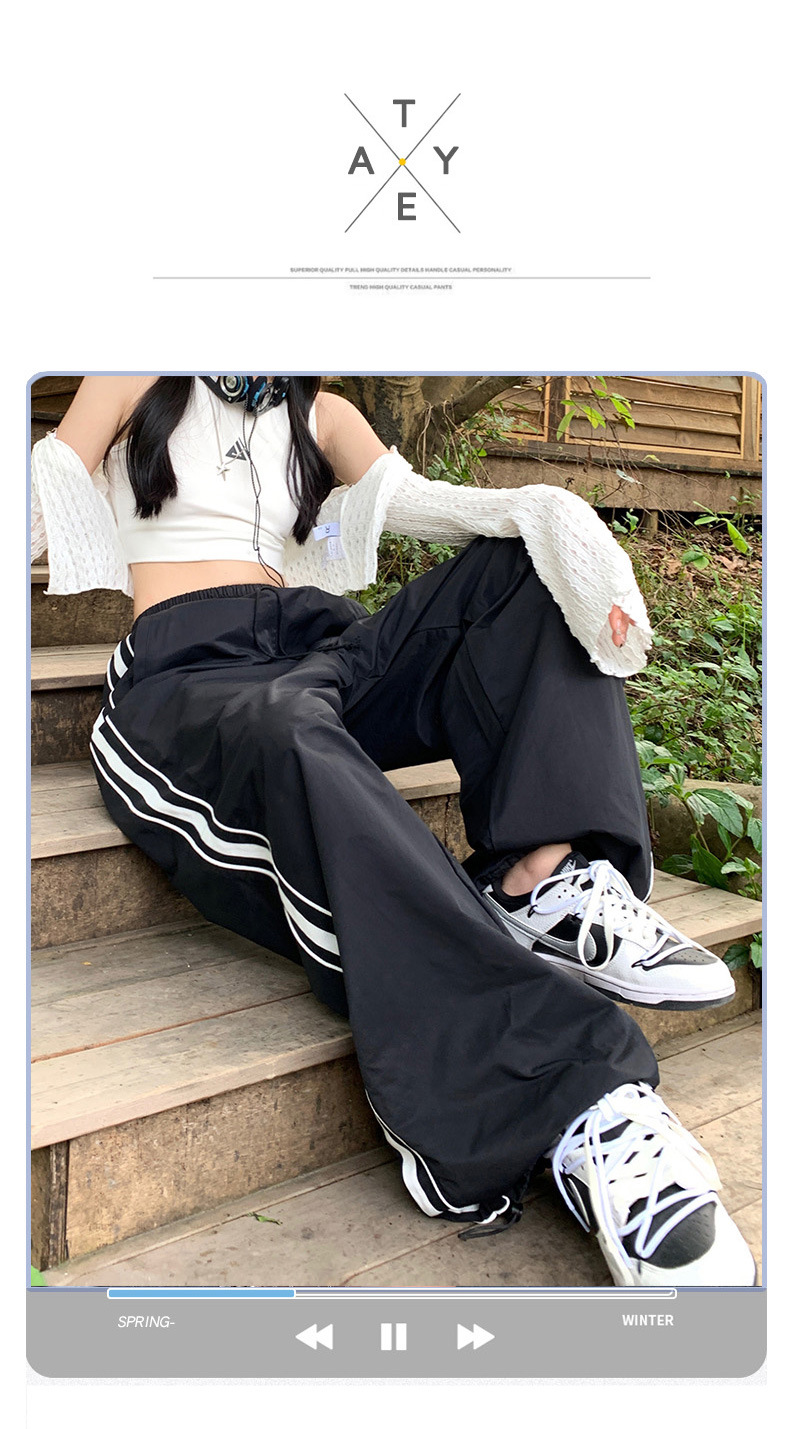 블랙 스포츠 팬츠 여성용 봄과 여름 아메리칸 스트레이트 루즈한 와이드 레그 차지 팬츠 드레이핑 사이드 스트라이프 캐주얼 팬츠스토어 가기