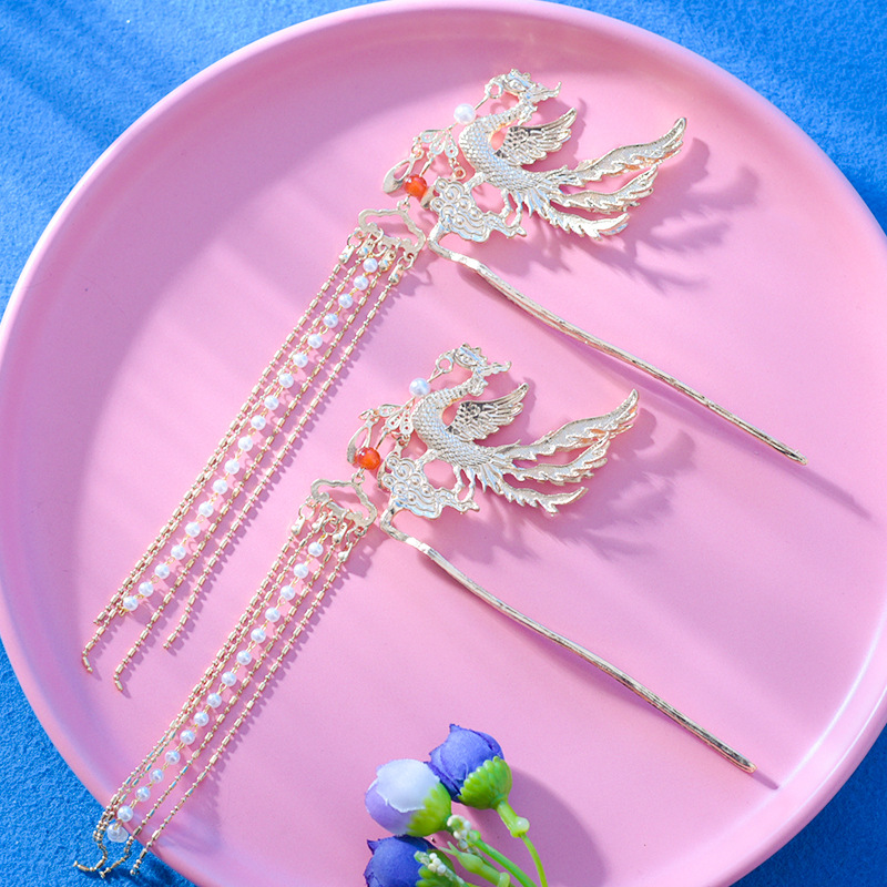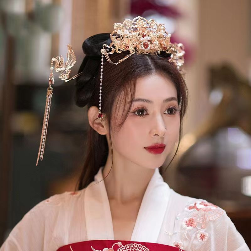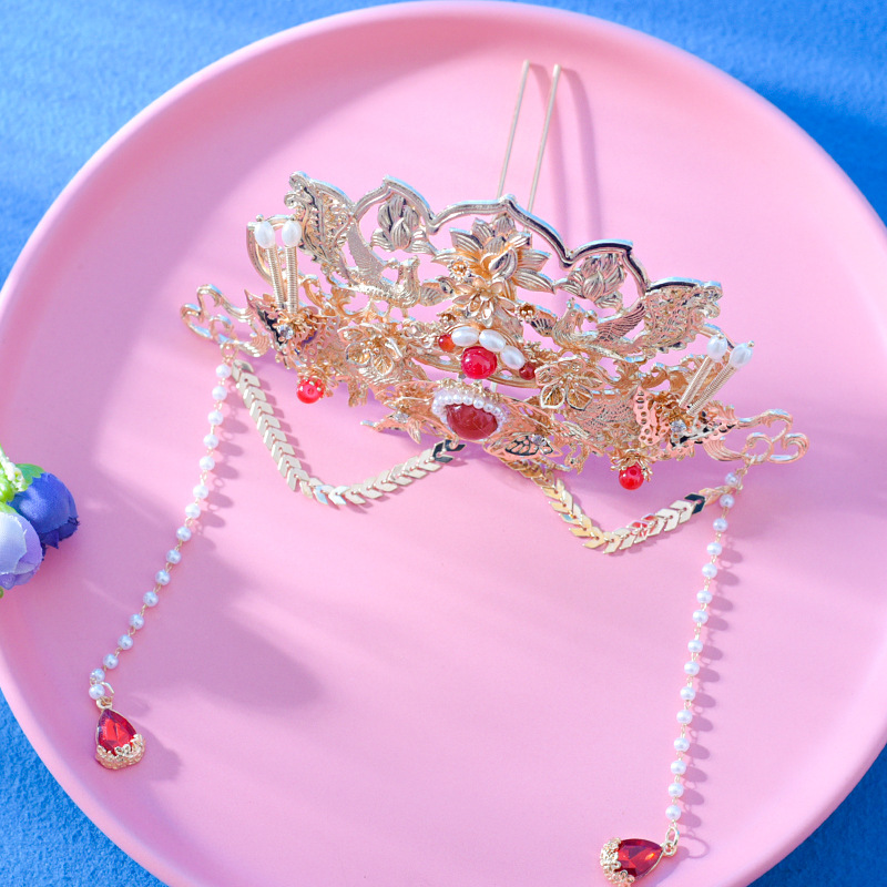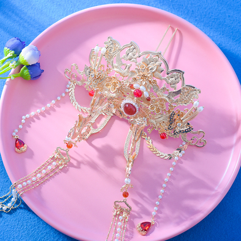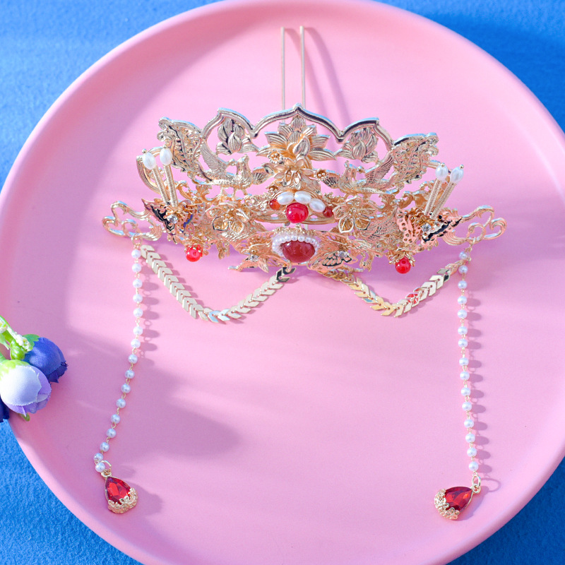 밍에서 만든 Hanfu 액세서리 쇼 기모노 헤어 크라운 머리 머리핀 세트 모든 매치 레드 골드 화려한 단계별 Fenglai Chao 슈퍼 불멸스토어 가기