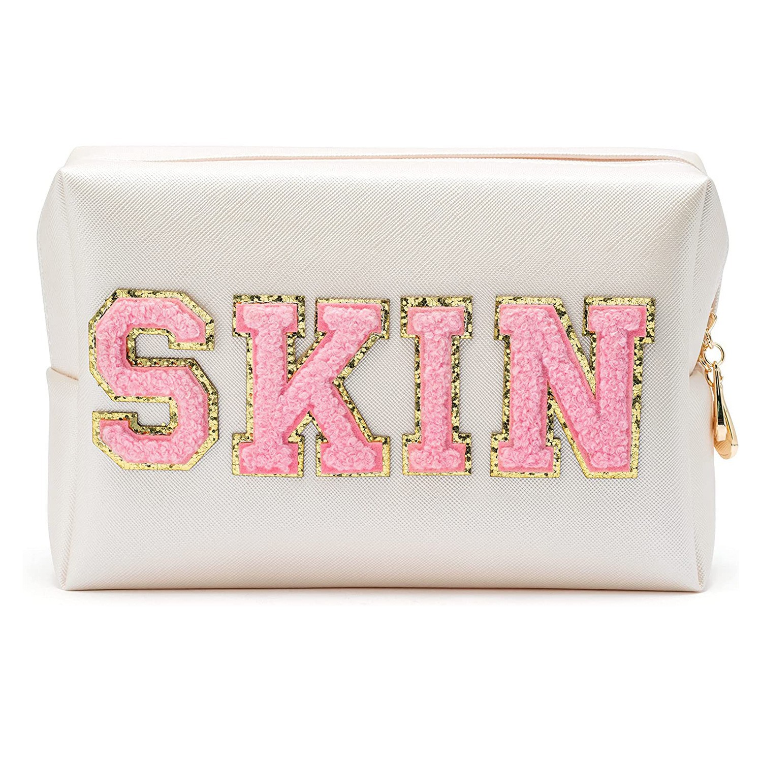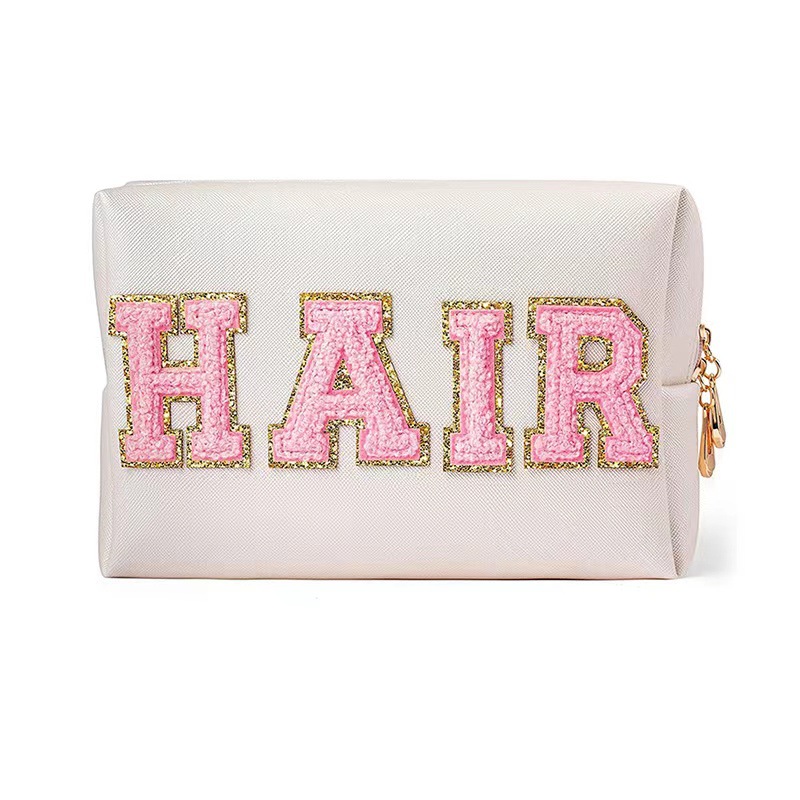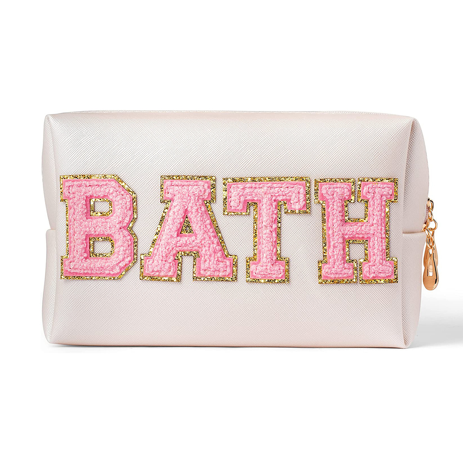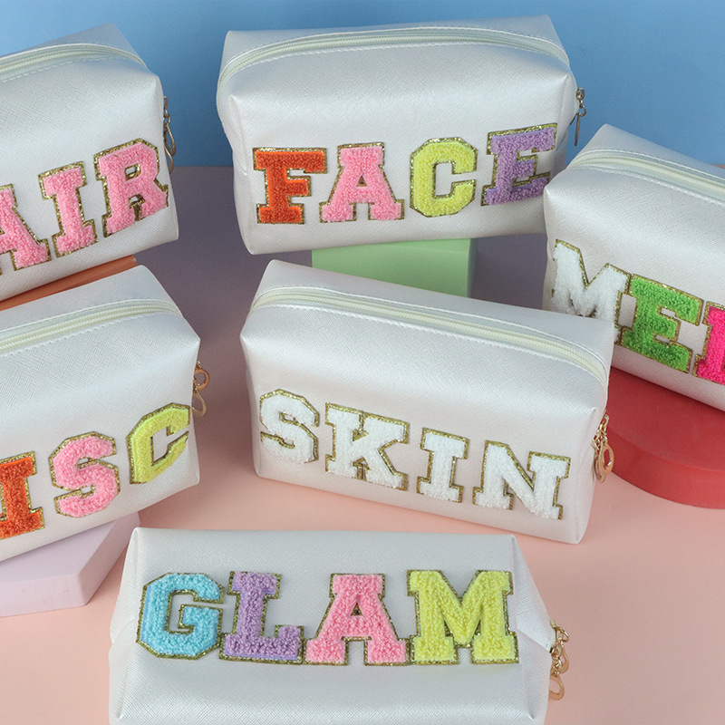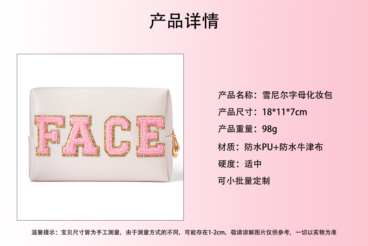 아마존 패치 편지 화장품 가방 스티치 핑크 셔닐 문자 PU 가죽 방수 화장품 가방