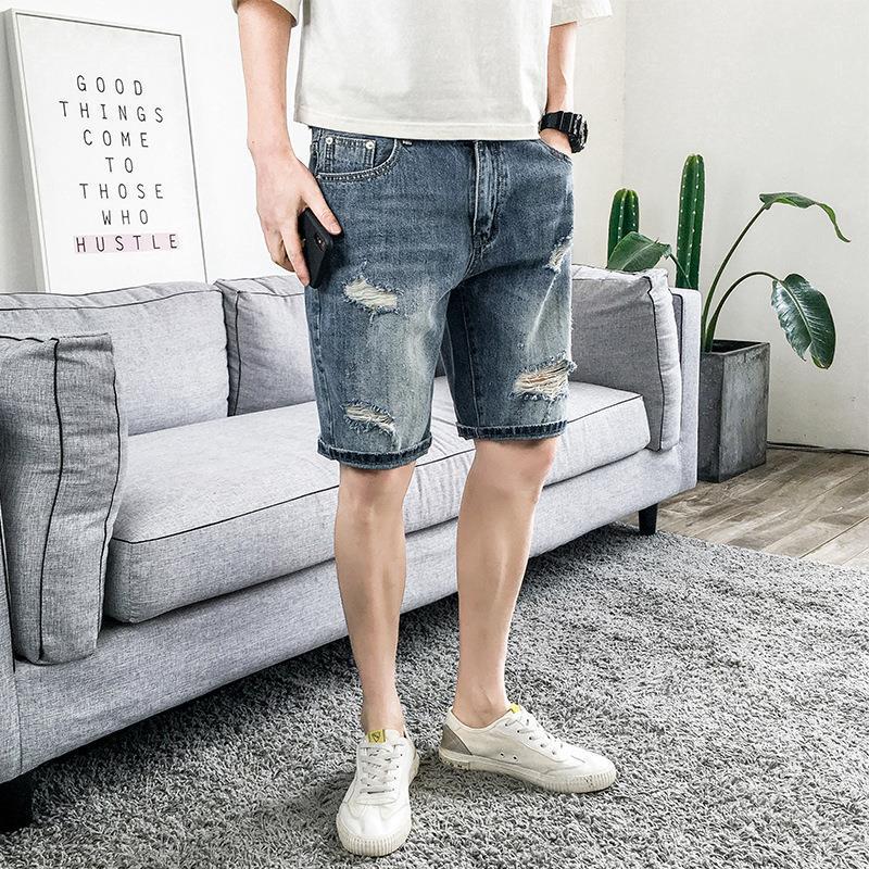 2023 여름 트렌디 찢어진 데님 반바지 남성 유행 느슨한 모든 경기 중간 길이 바지 십대 유행 브랜드 반 길이 바지스토어 가기