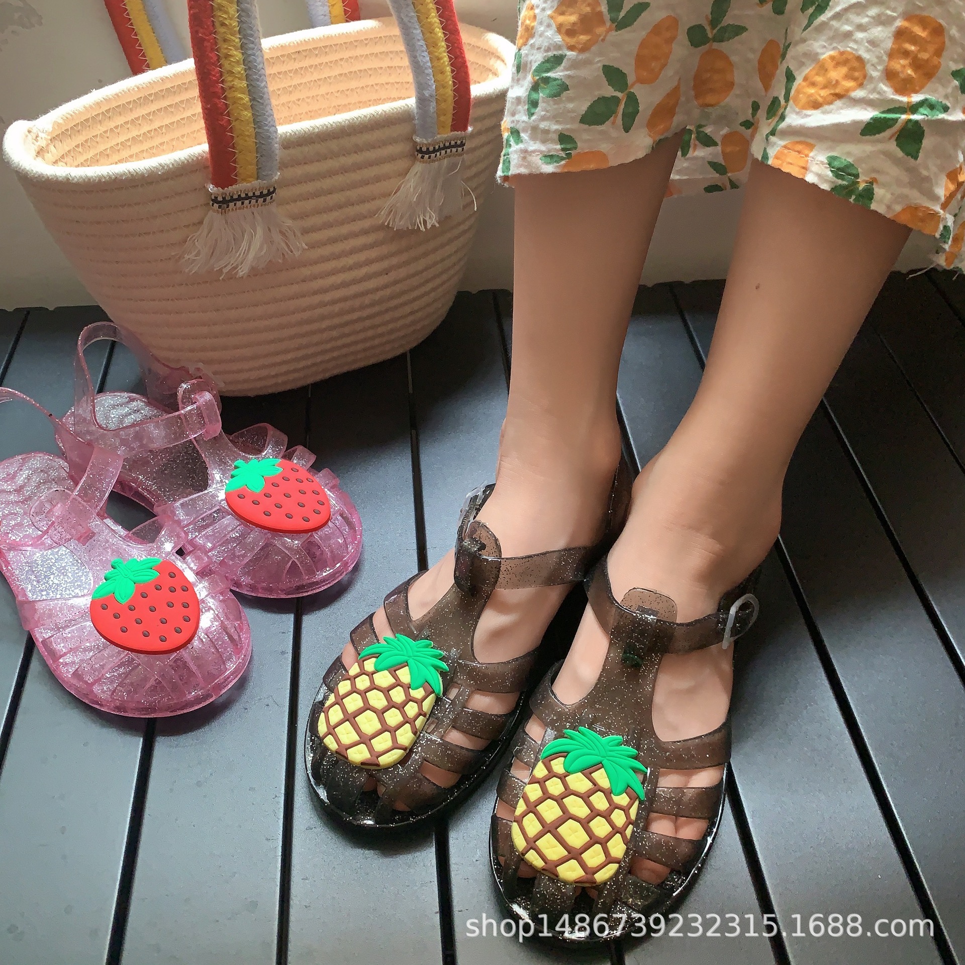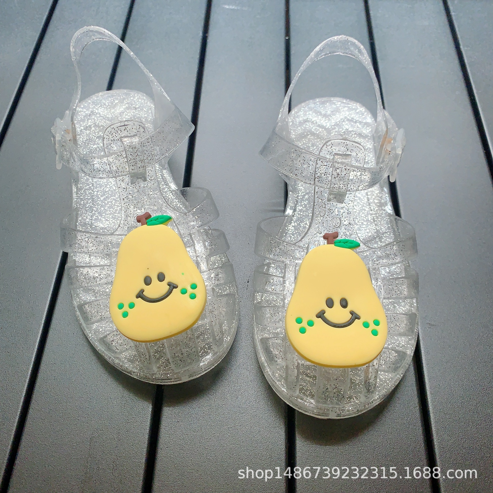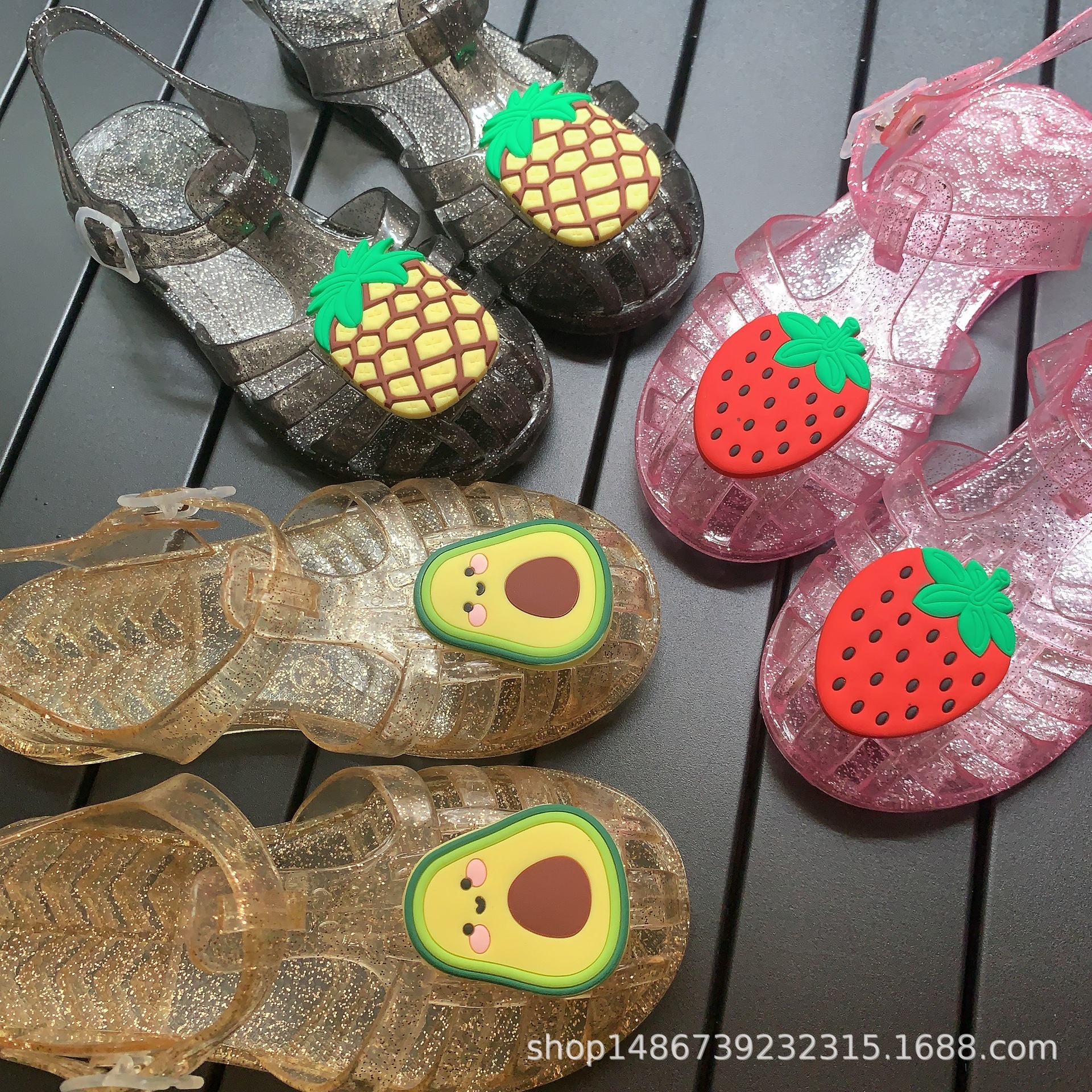 여름 새로운 젤리 샌들 패션 만화 과일 크리스탈 신발 Baotou 아기 샌들 부드러운 바닥 플라스틱 신발 도매