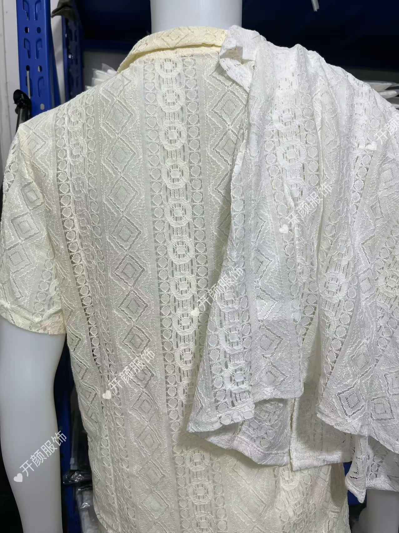 스팟 유럽과 미국의 패셔너블한 신작 남성용 레이스 반팔 셔츠, 버튼이 있는 휴일 캐주얼 중공 탑스토어 가기