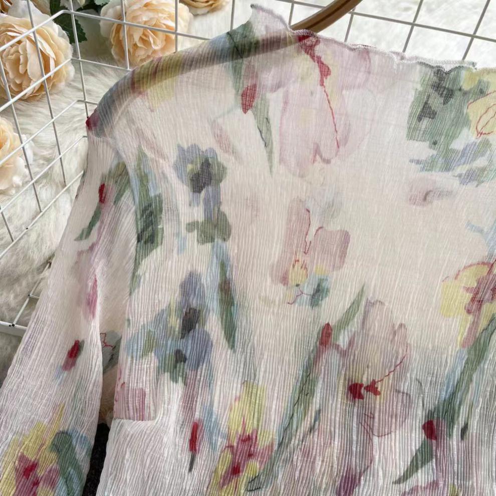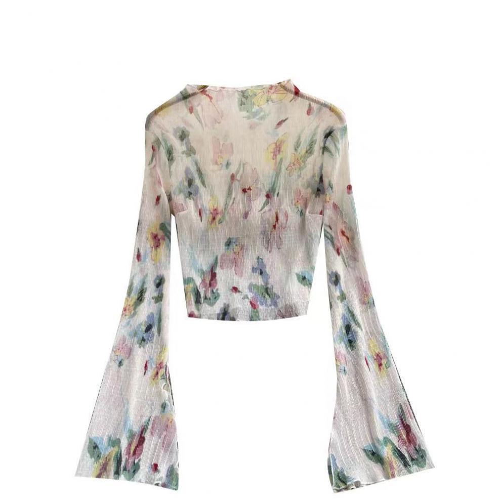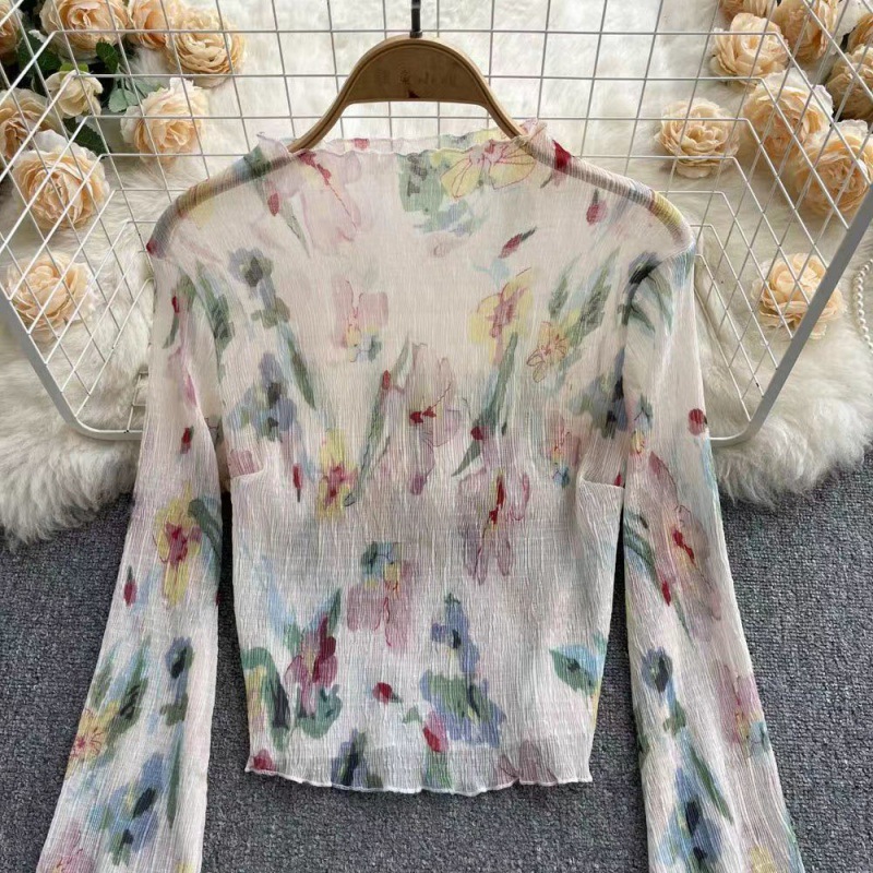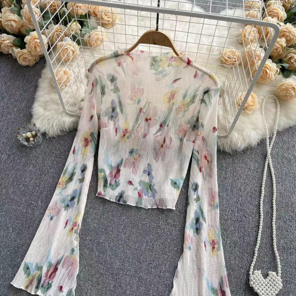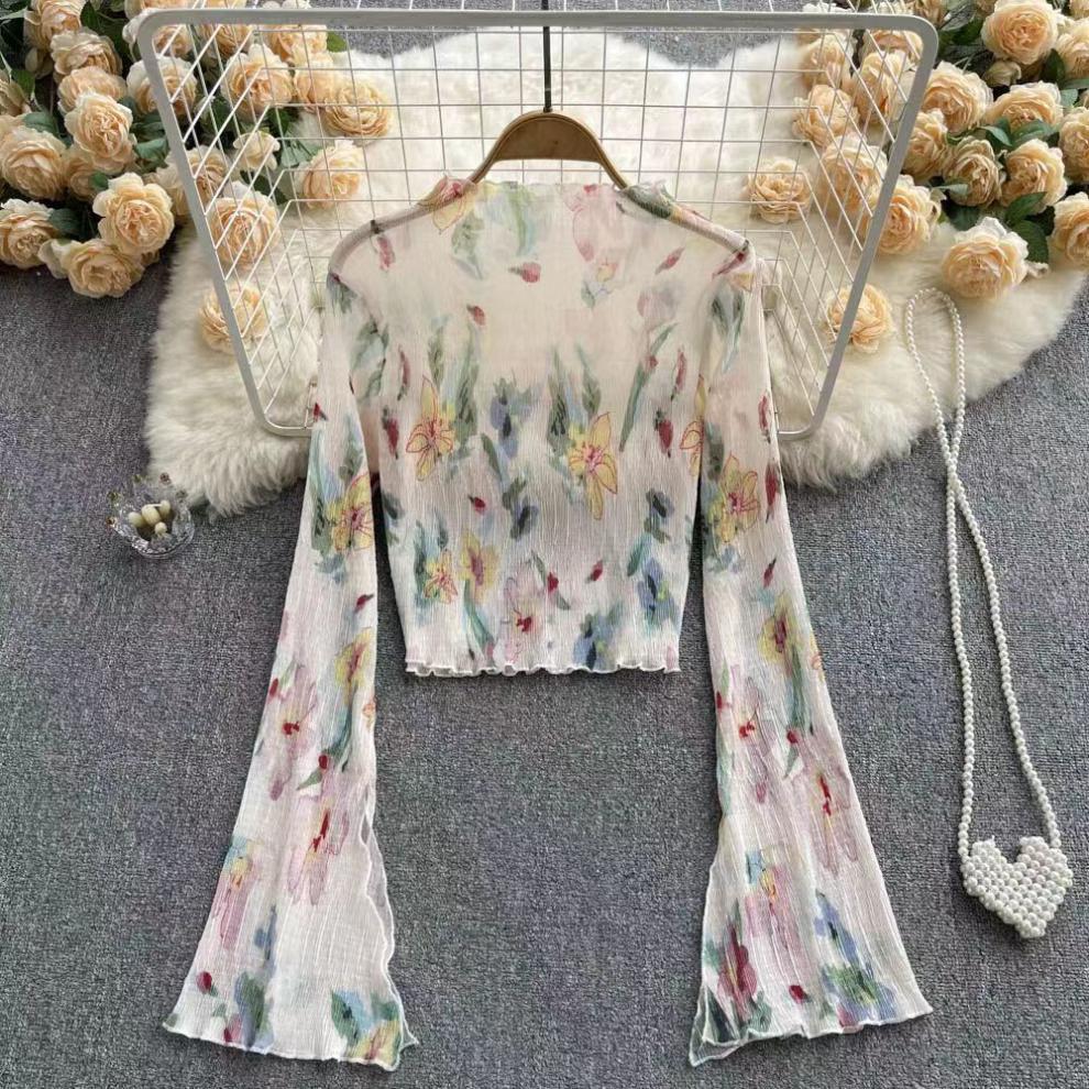 스파이스 걸스 틈새 디자인 센스 프린트 자외선 차단제 셔츠 탑 긴팔 셔츠 여성용 세련된 모든 매치 짧은 라운드 넥 혼 소매