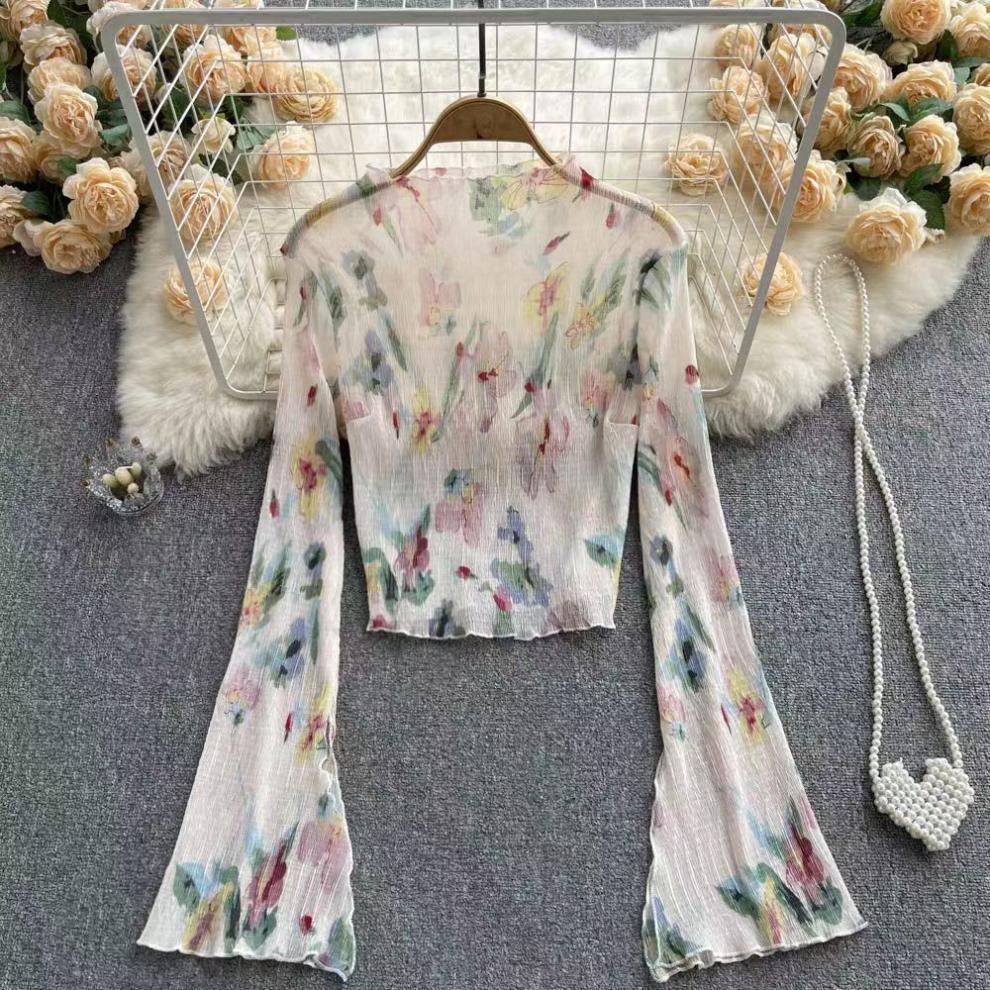 스파이스 걸스 틈새 디자인 센스 프린트 자외선 차단제 셔츠 탑 긴팔 셔츠 여성용 세련된 모든 매치 짧은 라운드 넥 혼 소매스토어 가기