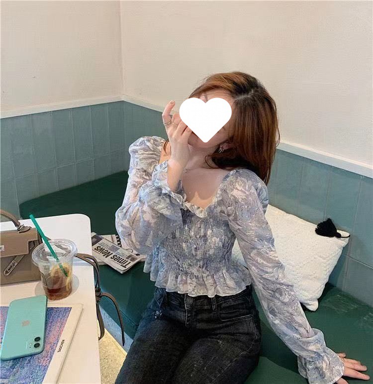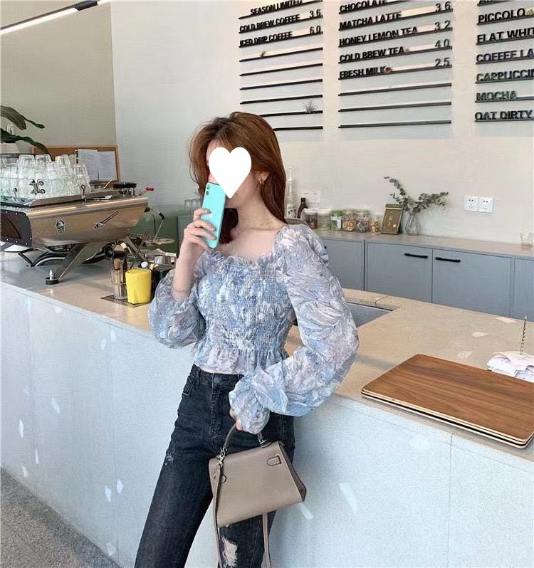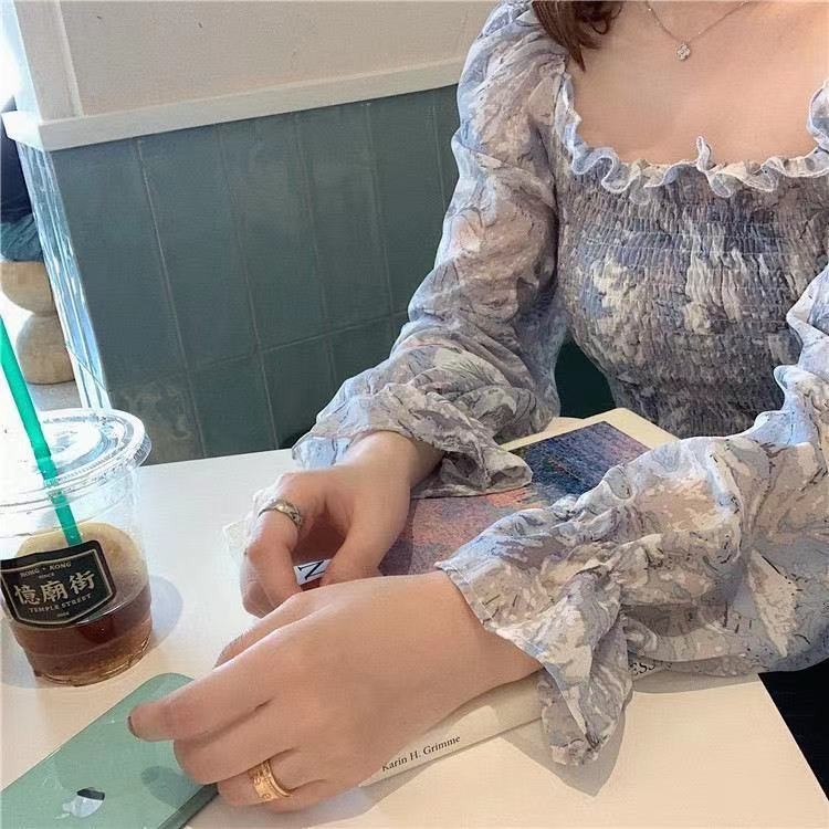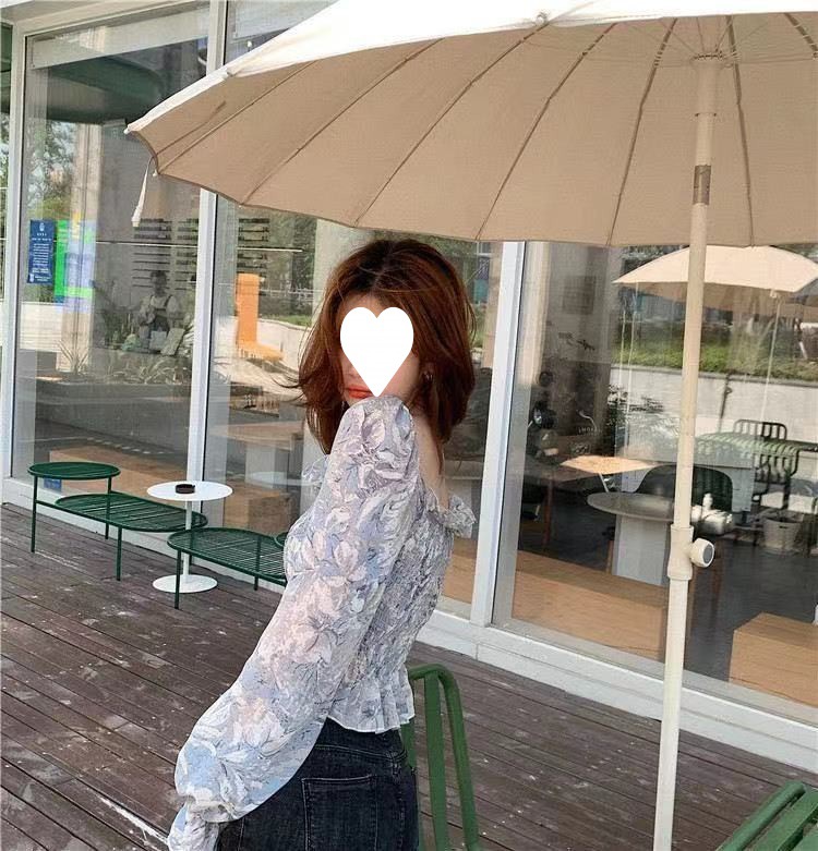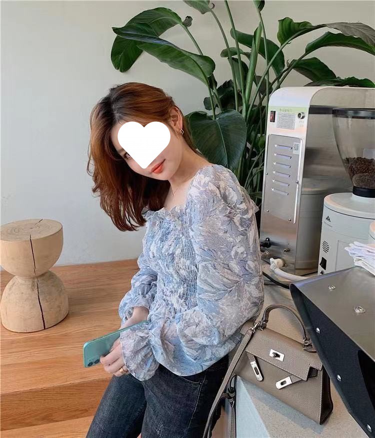 프렌치 스타일 스퀘어 칼라 플로럴 오프 숄더 쉬폰 셔츠 여성용 2023 년 새로운 봄과 여름 한국 스타일 긴팔 오프 숄더 우아한 셔츠스토어 가기