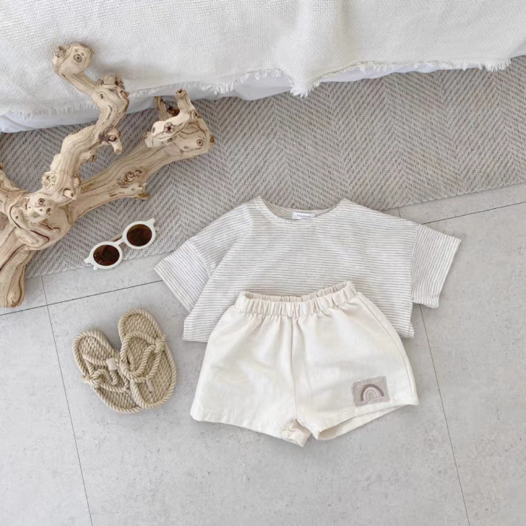 에서 한국 유아 의상 재킷 스트라이프 + 레인보우 반바지 시원한 세트 여름 간단한 나가는 세트