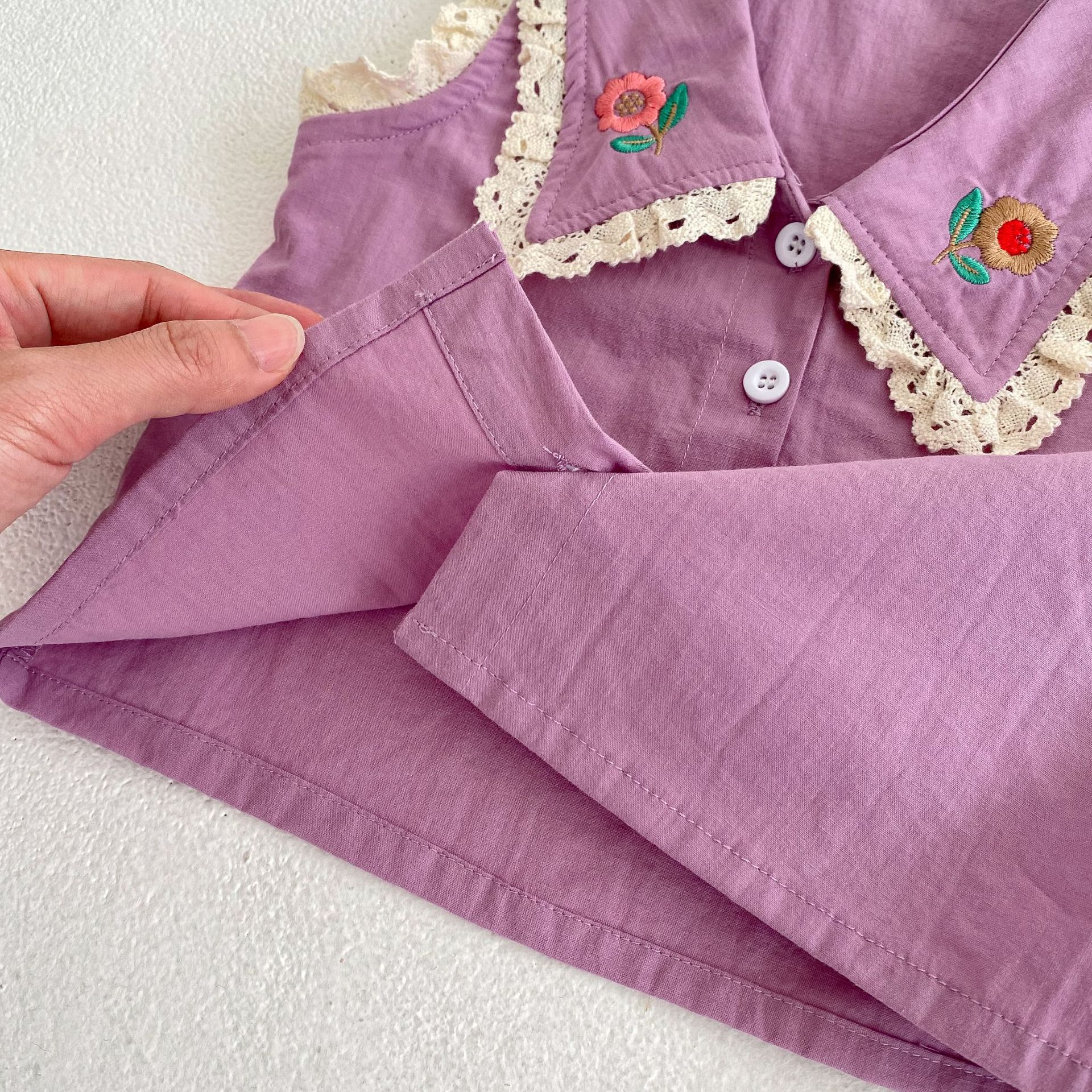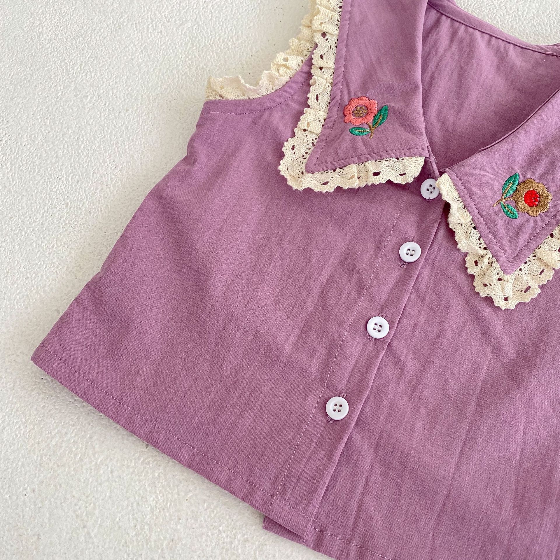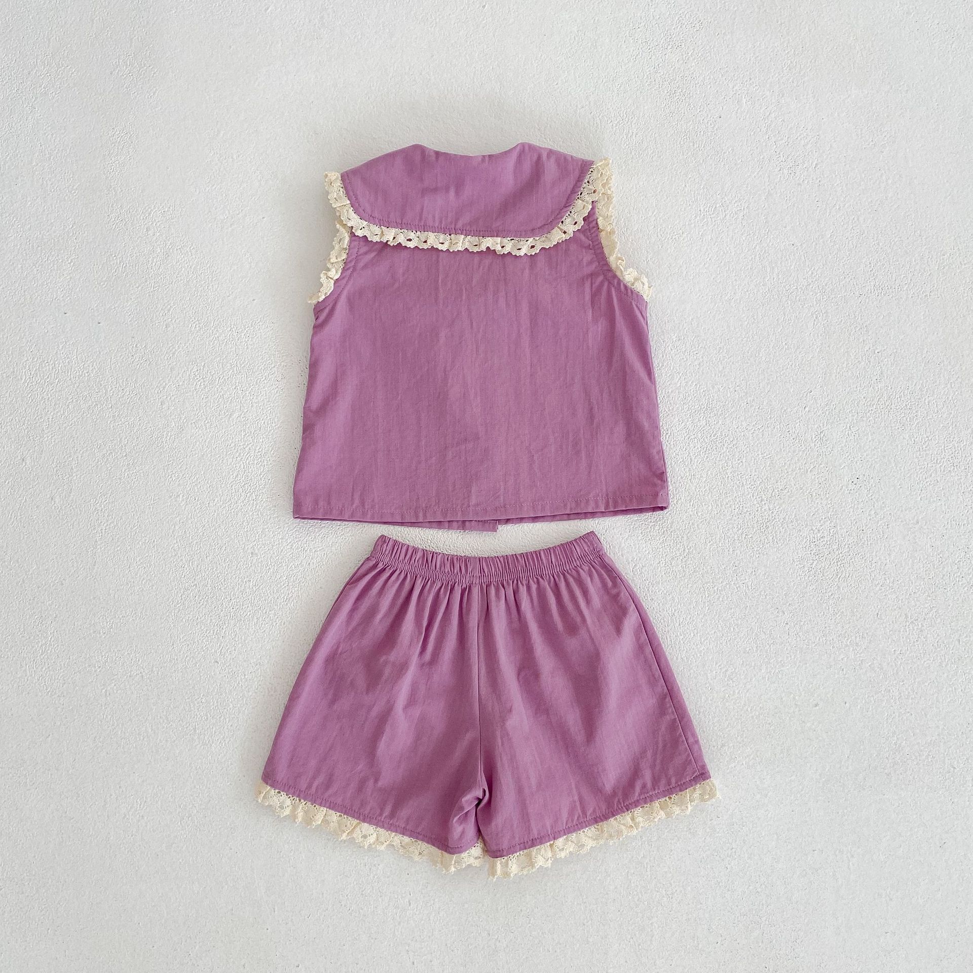 2025 여름 스타일 인스 아기 자수 뾰족 칼라 민소매 단추 여밈 상의 + 레이스 반바지 여아 2피스 세트