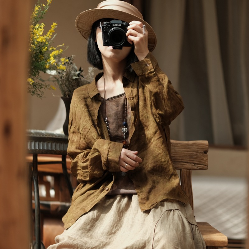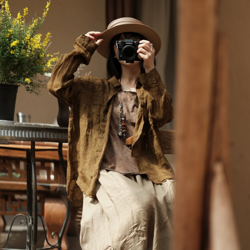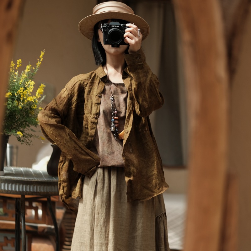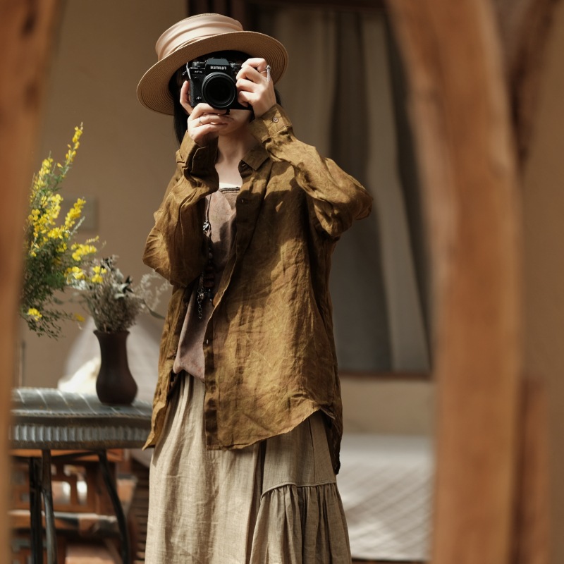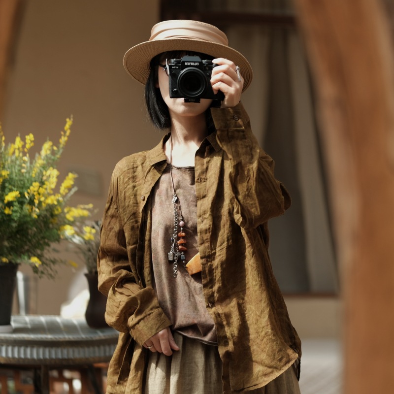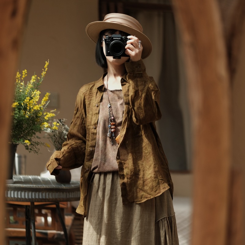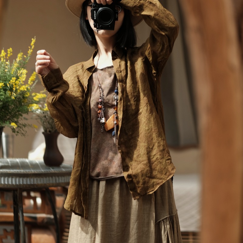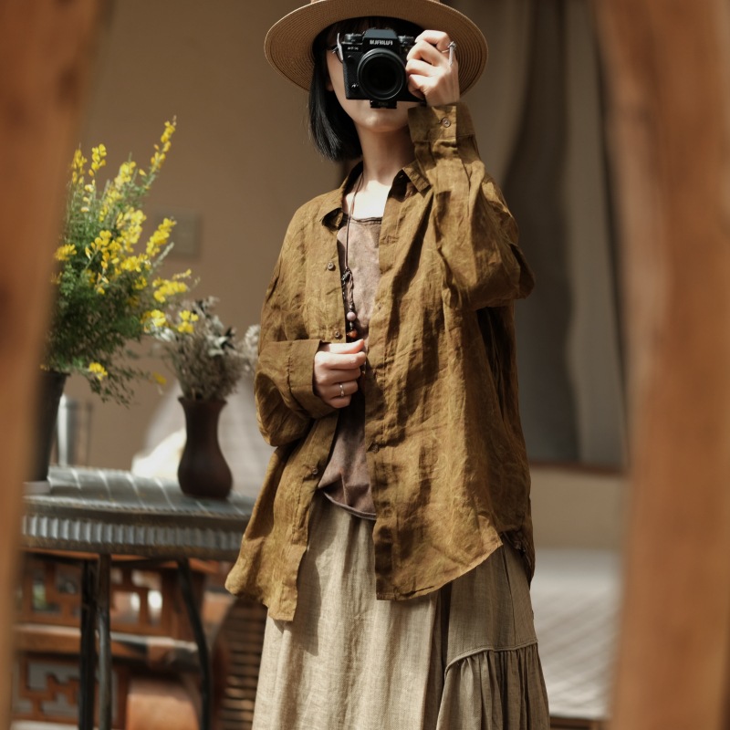 2023 봄 작은 진흙 소녀 빈티지 예술적 워시 순수 라미 느슨한 셔츠 카디건 재킷 2040 Nanke