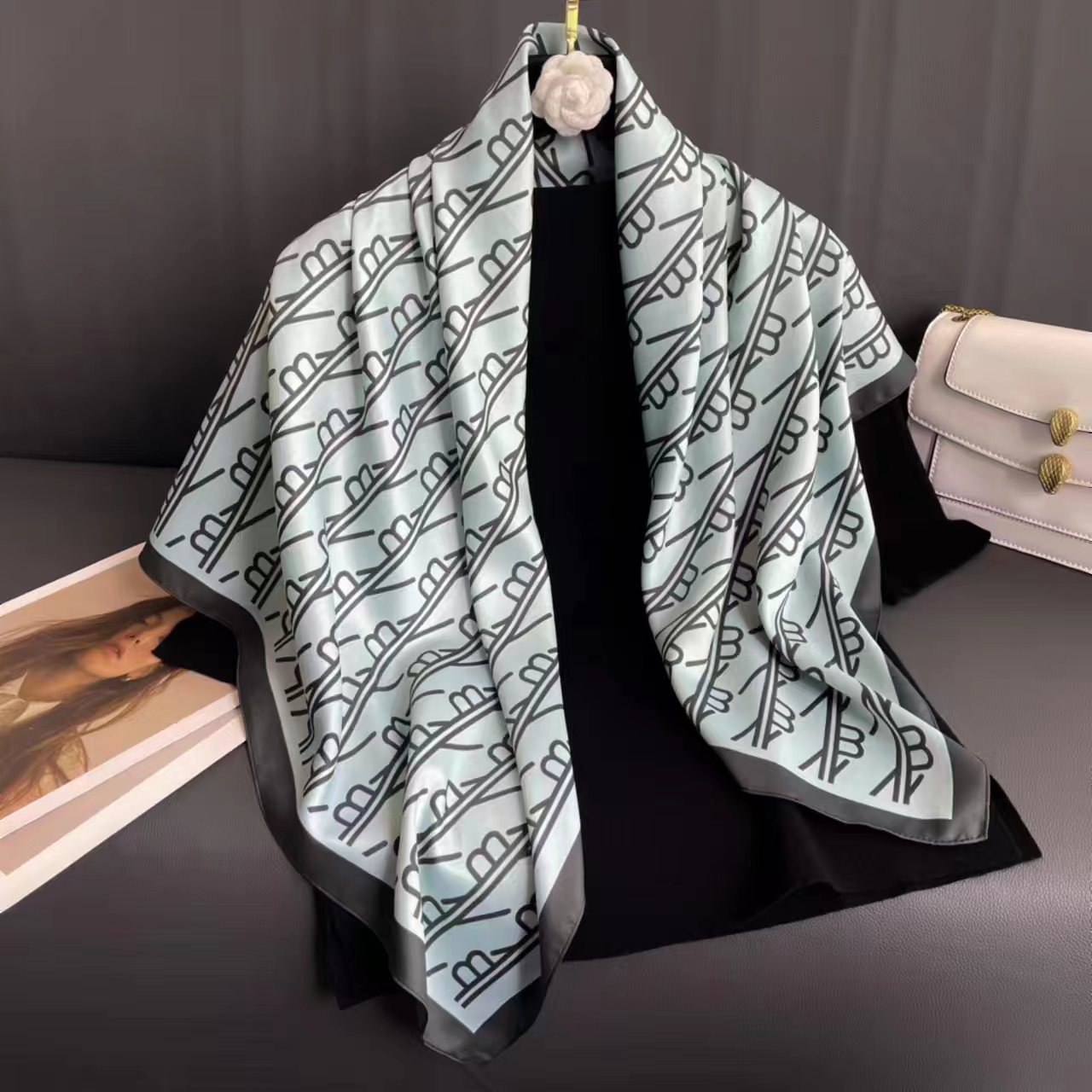 2023 봄과 여름 새로운 머리 스카프 90cm 대형 사각 스카프 스카프 능직 기하학 심플 실크 스카프 여성의 모든 경기 우아한스토어 가기