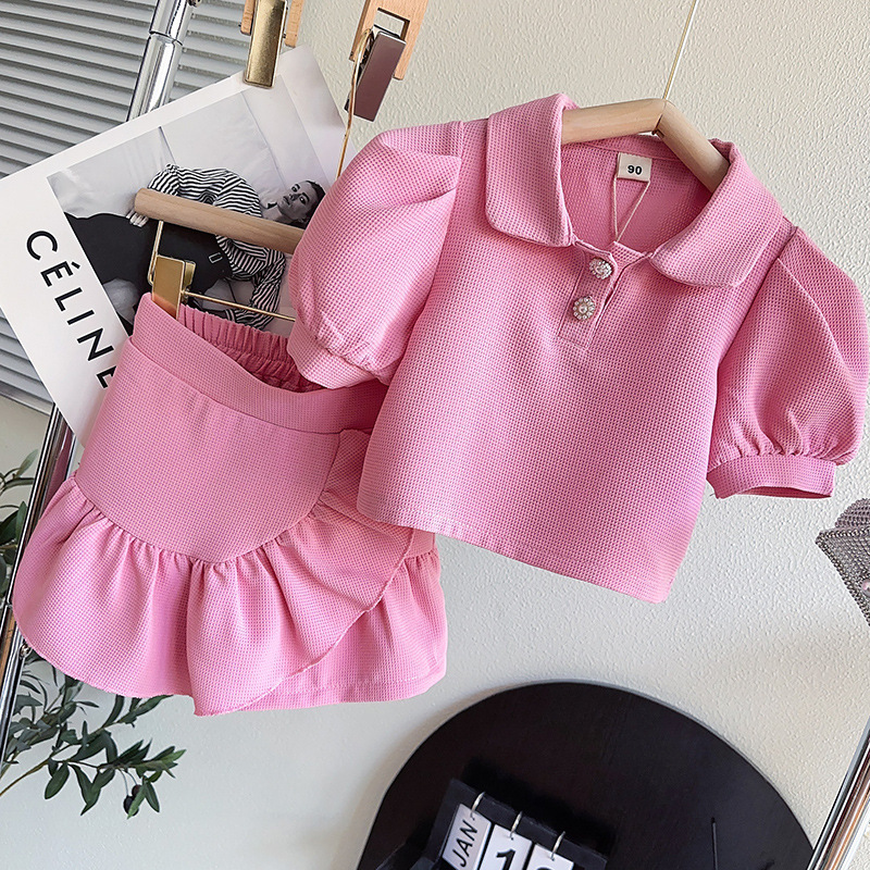 걸스 세트 2023 여름 새로운 버블 라펠 반팔 셔츠 + 외국 스타일 스커트 투피스 크로스 보더 헤어 생성스토어 가기