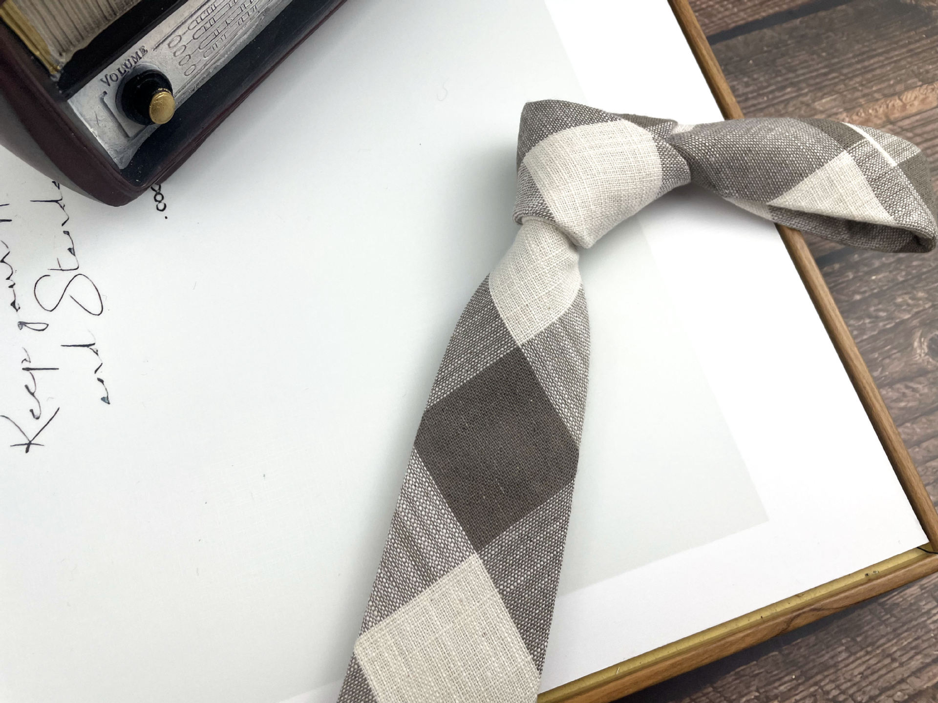 • 커피 격자 무늬 코튼 린넨 넥타이 핸드 타이