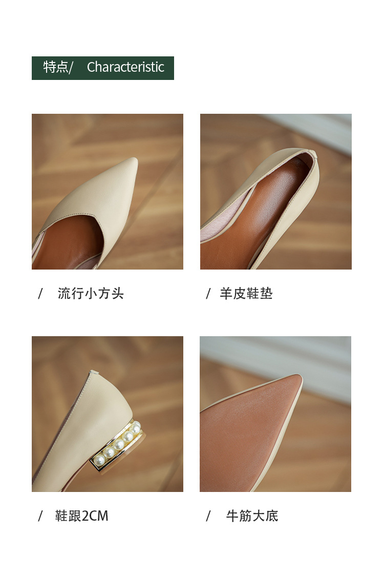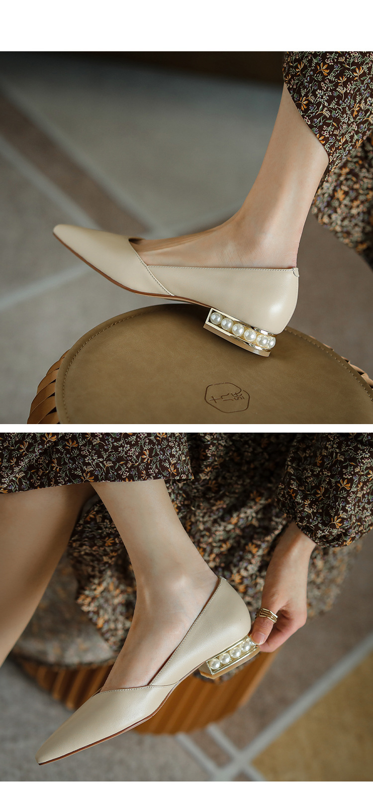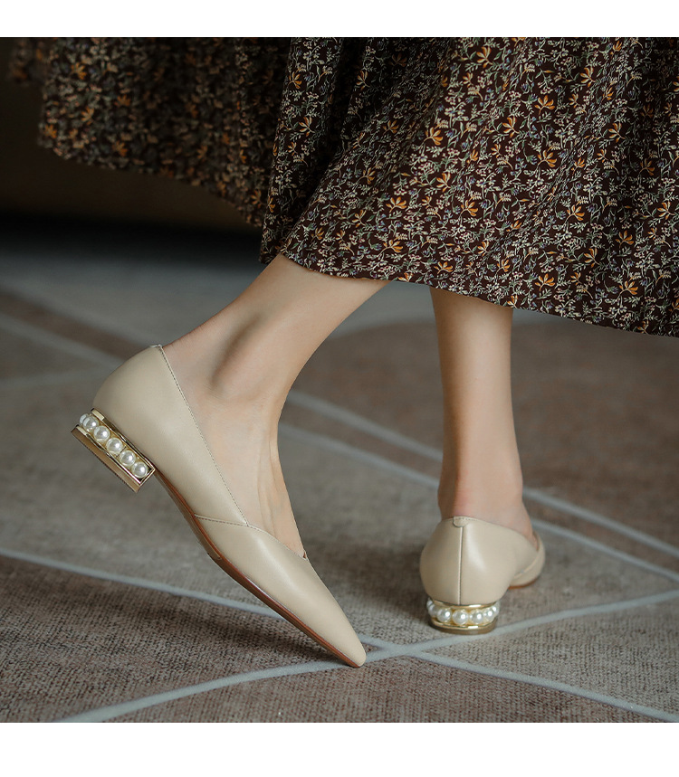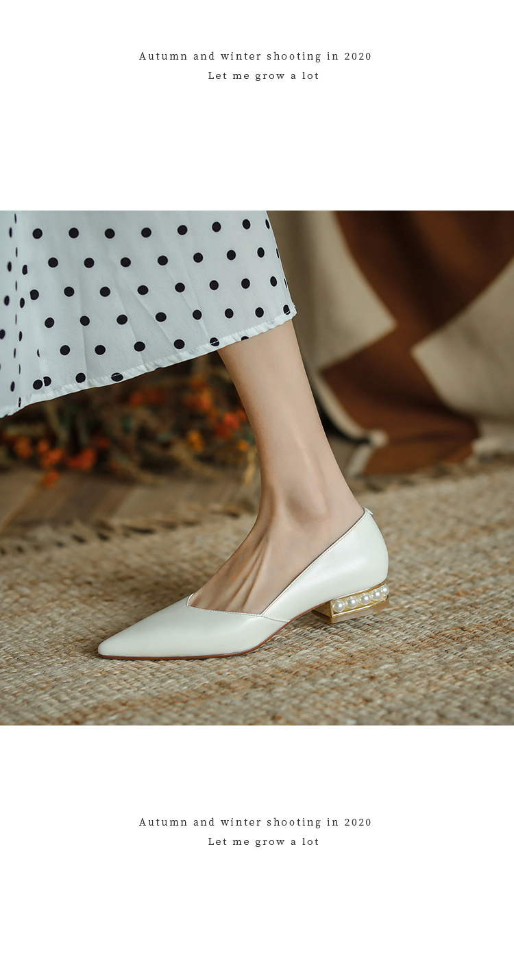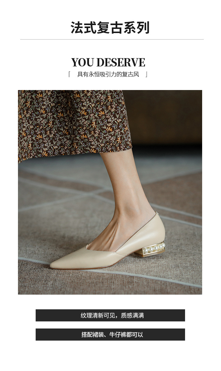 프랑스 복고풍 청키 힐 신발 여성용 2022 봄 새로운 소가죽 신발 낮은 굽 뾰족한 진주 여성 신발스토어 가기