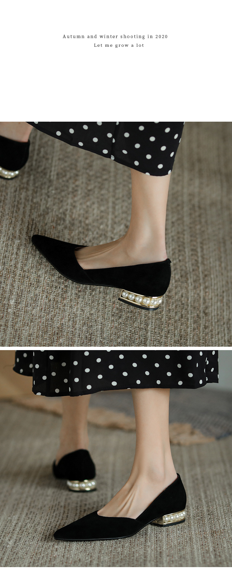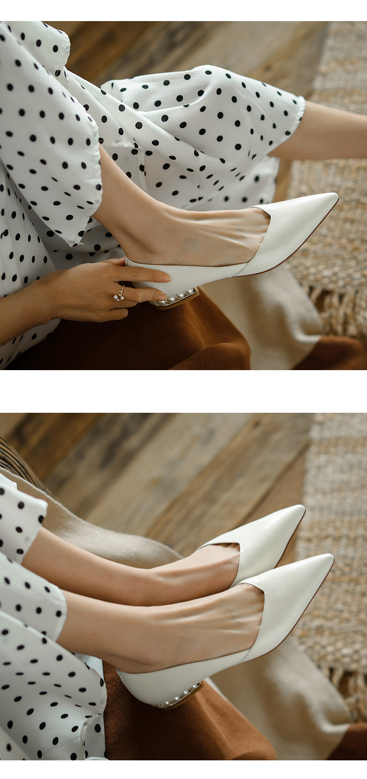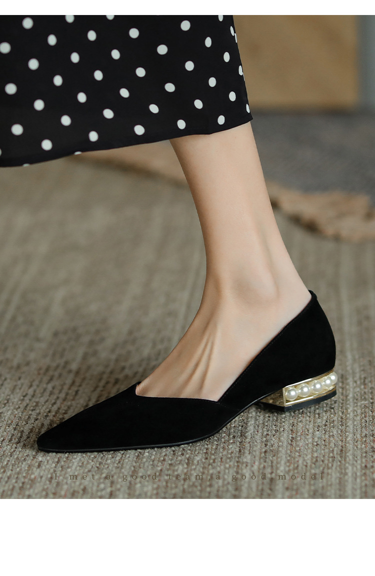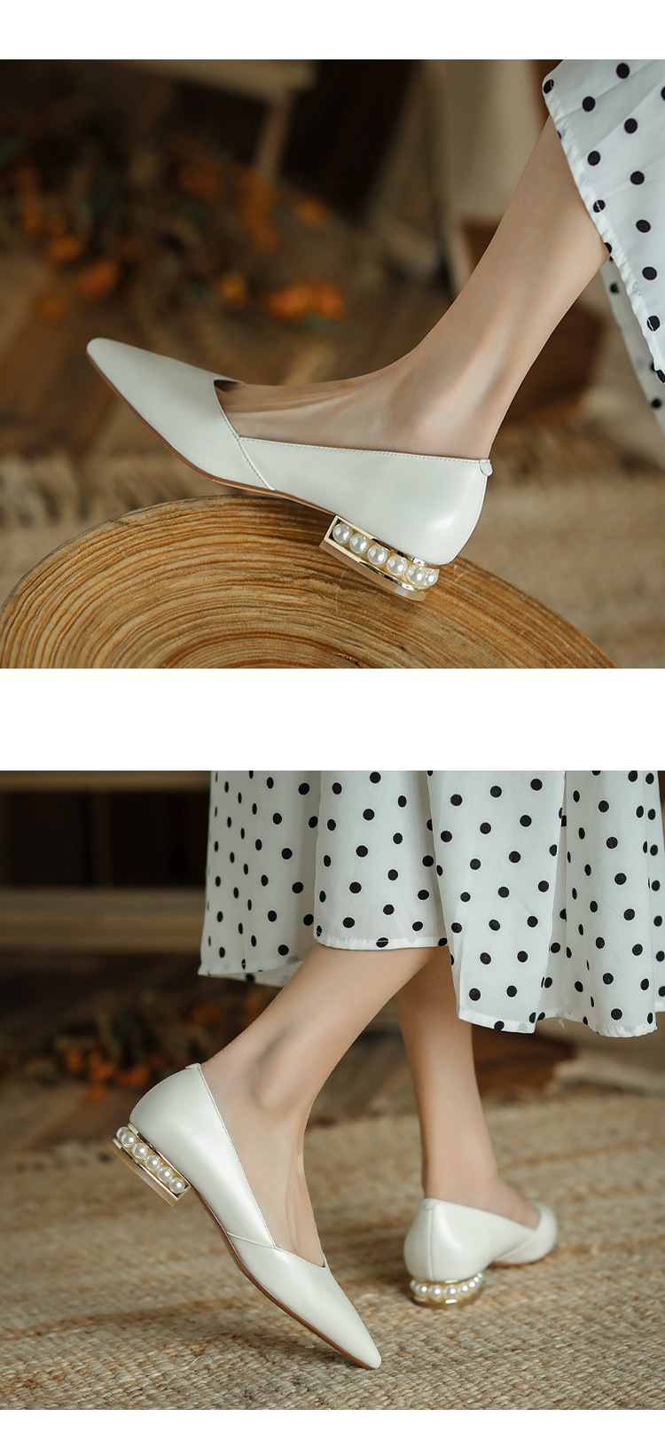 프랑스 복고풍 청키 힐 신발 여성용 2022 봄 새로운 소가죽 신발 낮은 굽 뾰족한 진주 여성 신발스토어 가기