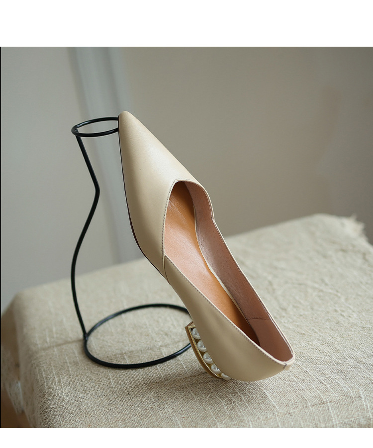 프랑스 복고풍 청키 힐 신발 여성용 2022 봄 새로운 소가죽 신발 낮은 굽 뾰족한 진주 여성 신발