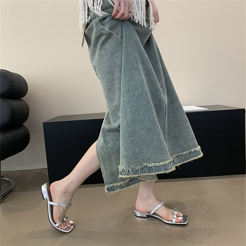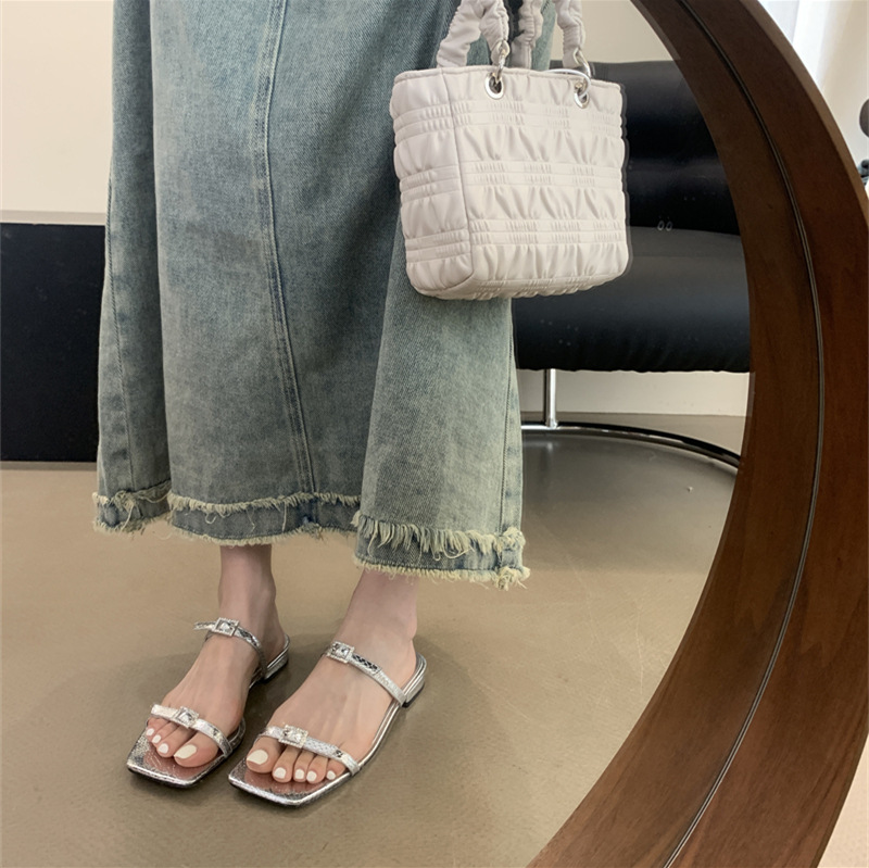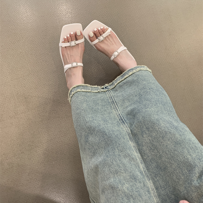 2024 슈퍼 아름다운 라인 석 버클 로우 힐 신발 겉옷 얇은 스트랩 블랙 새끼 고양이 두꺼운 뒤꿈치 여름 샌들 슬리퍼 여성을위한