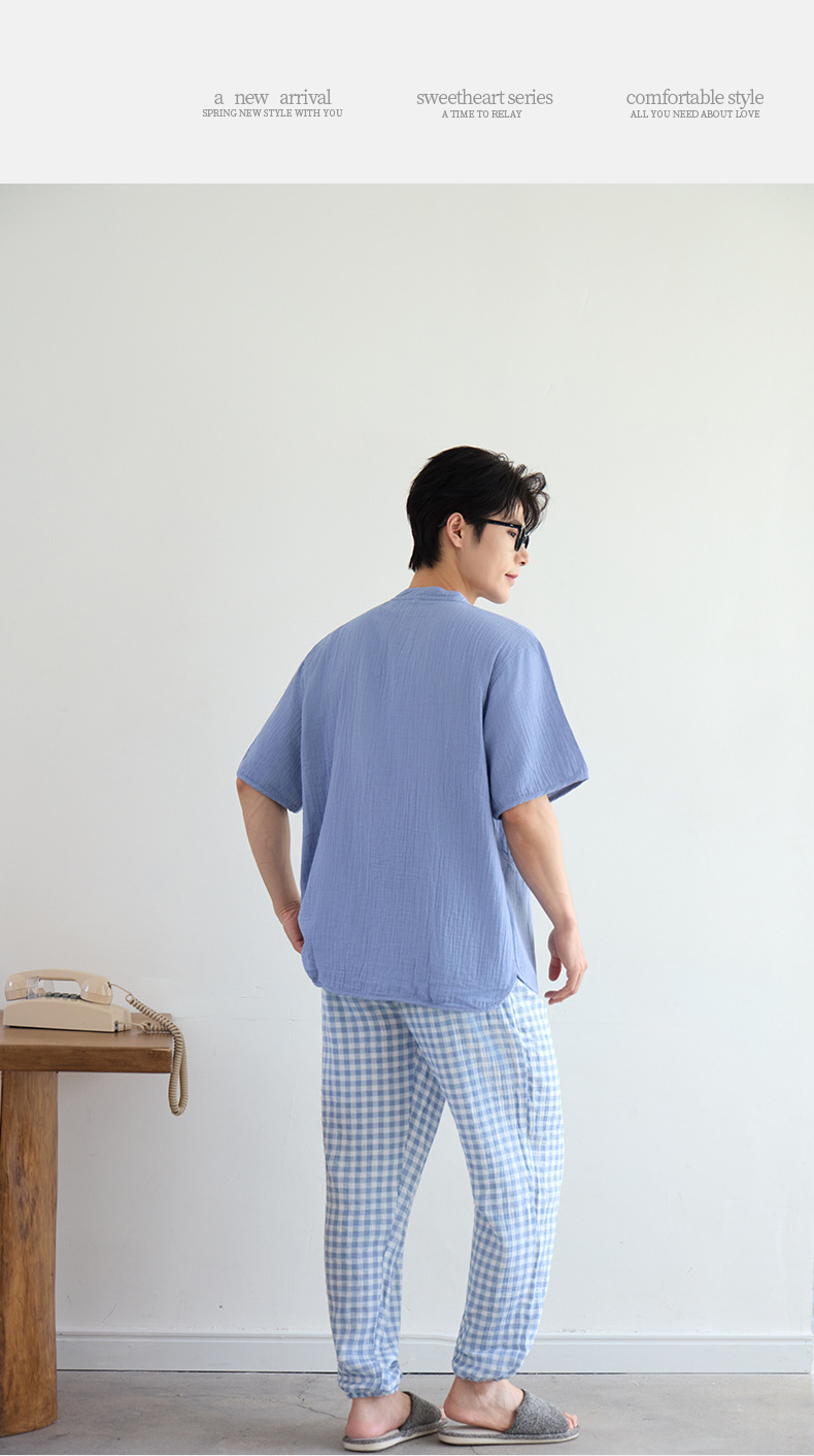 일본식 심플 남성용 격자 무늬 여름 얇은 순면 더블 레이어 거즈 반팔 잠옷 바지 가정복