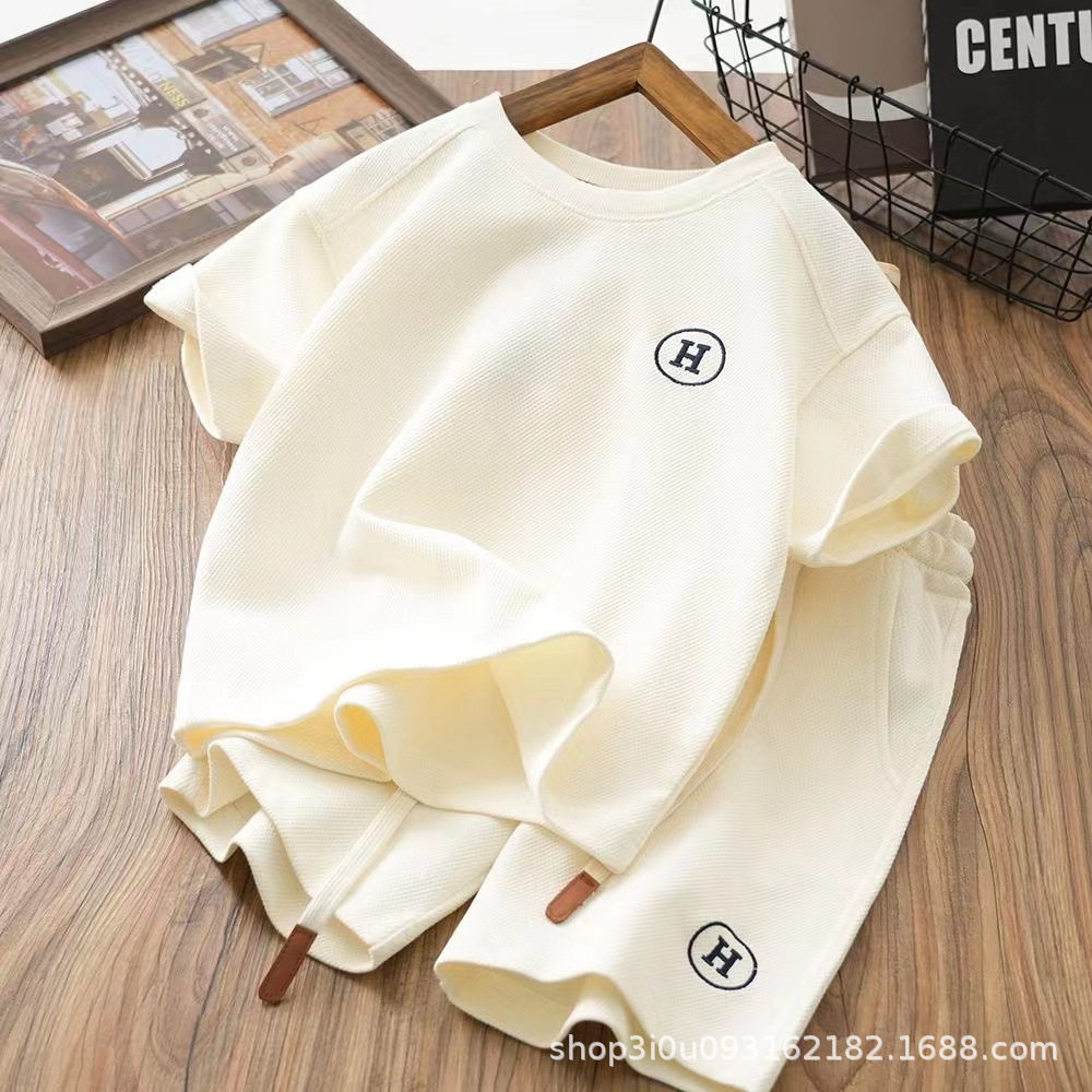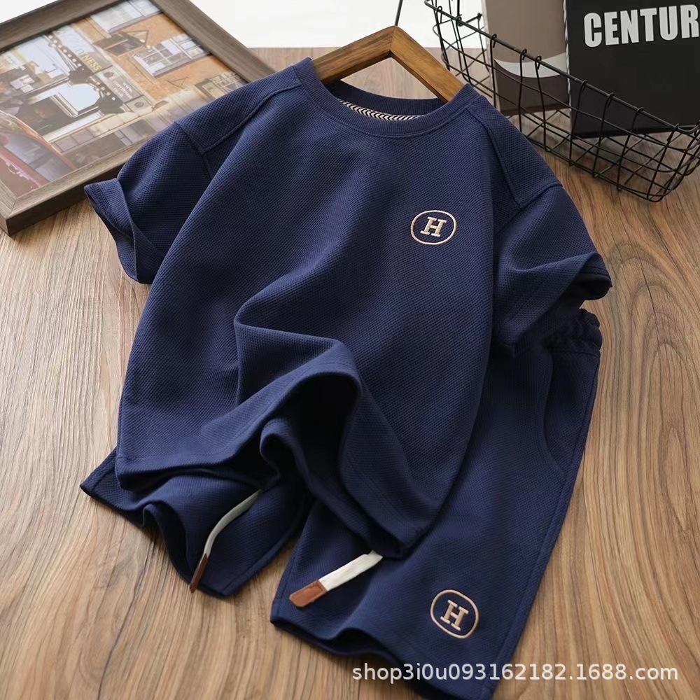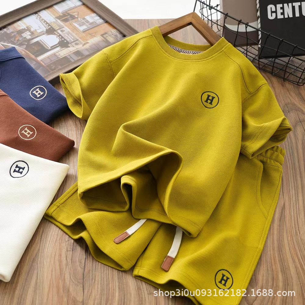 남아 아동복 반팔 투피스 세트 2023 여름 신상품 와플 스타일리스트 반팔 중형 얇은 세트스토어 가기