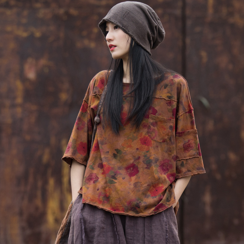 디지털 인쇄 모래 세척 오래된면 및 린넨 여성 의류 새로운 카운터 품질 짧은 소매 티셔츠 문학 복고풍 여성 탑